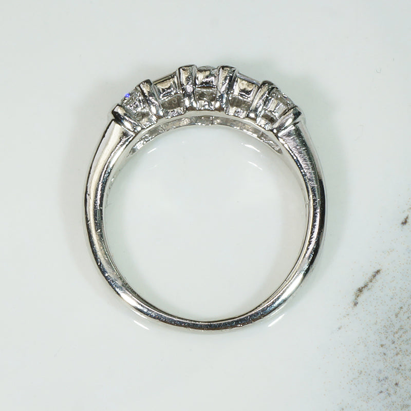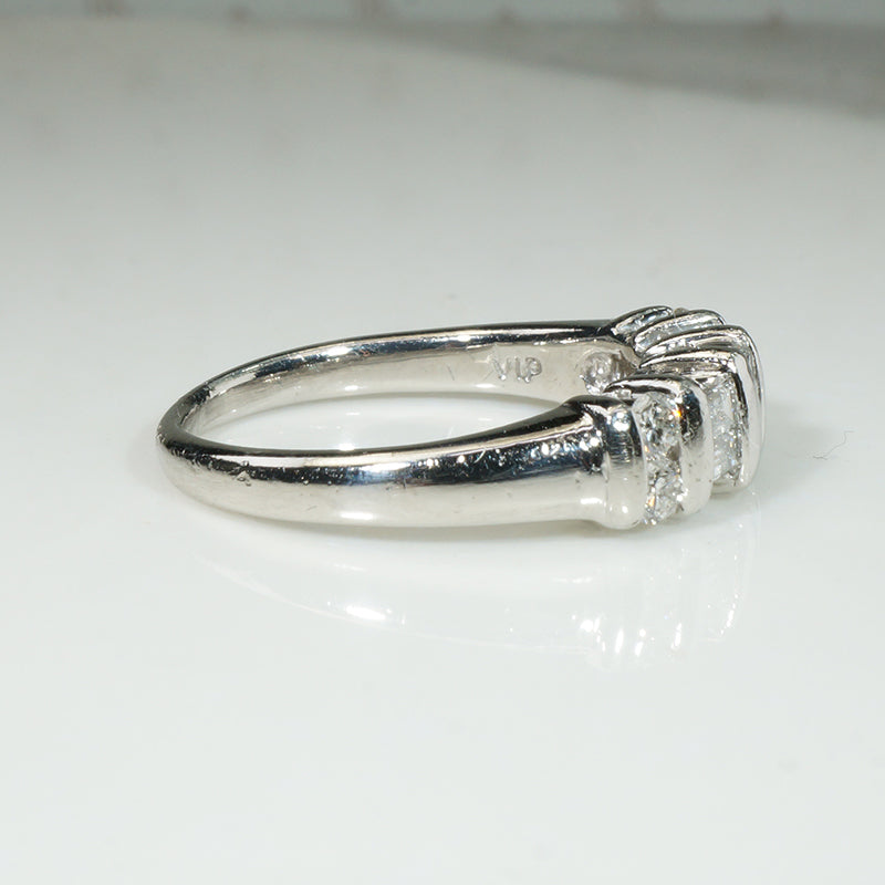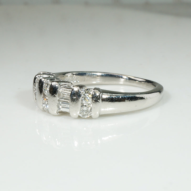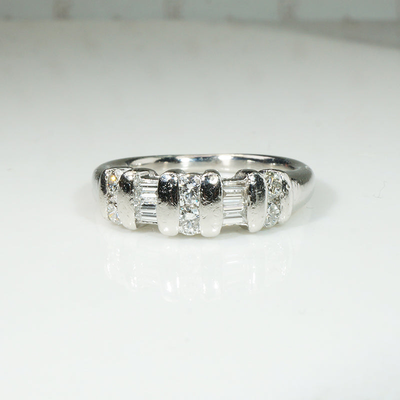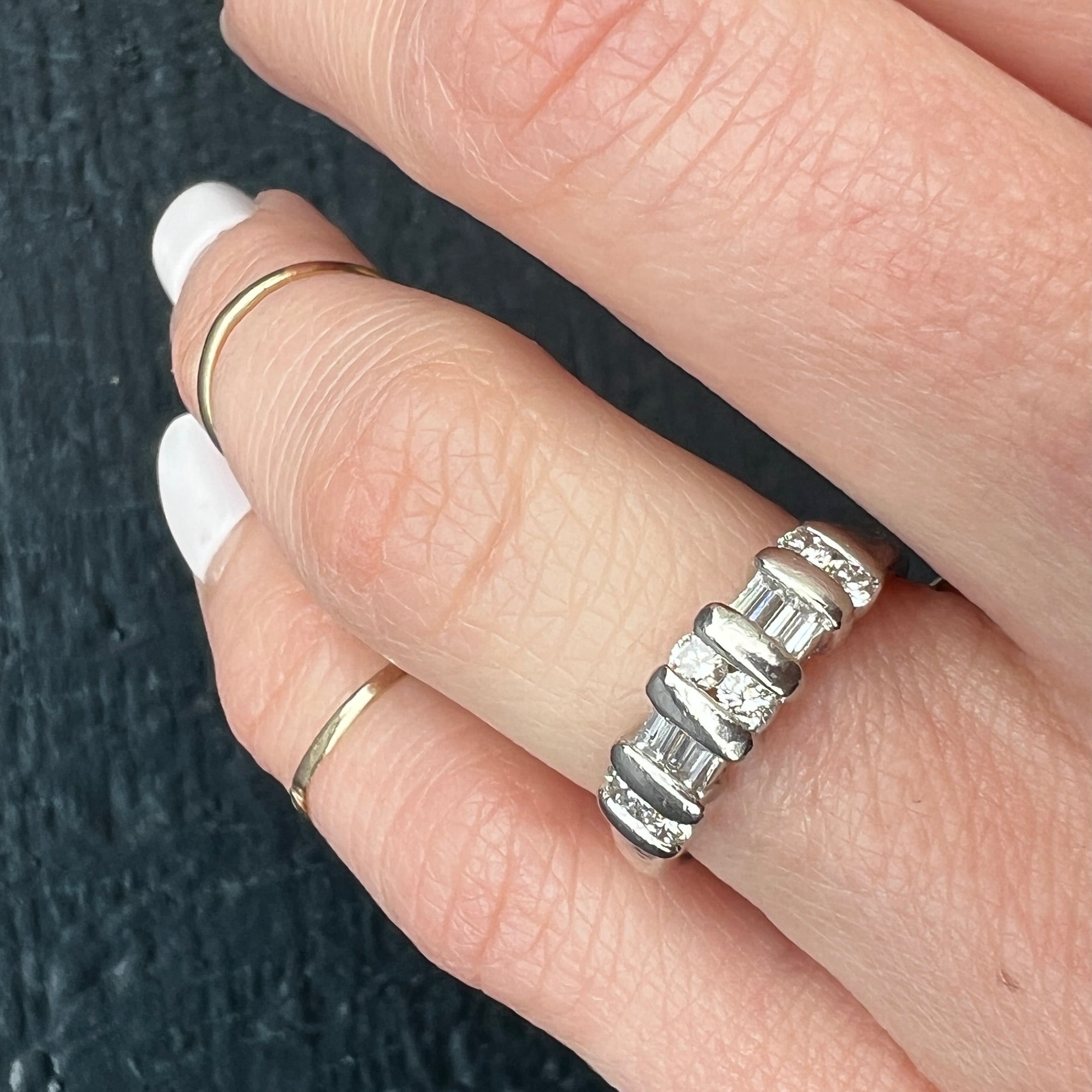 Alternating sections of round and baguette-shaped diamonds are bar set across the front of this heavy, well made, Platinum Ring. The diamonds are natural and of VS quality and a nice white color, and are they ever sparkly! Dating from the 1960s, you can pair this with an engagement ring, wear it on its own, or add it to a stack.