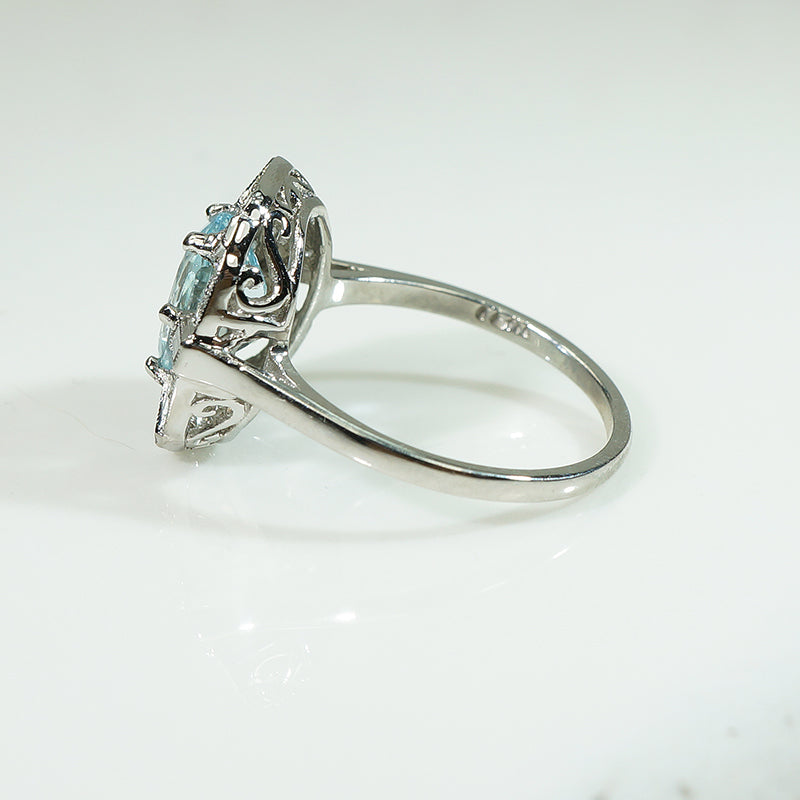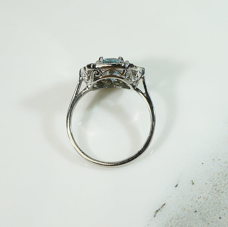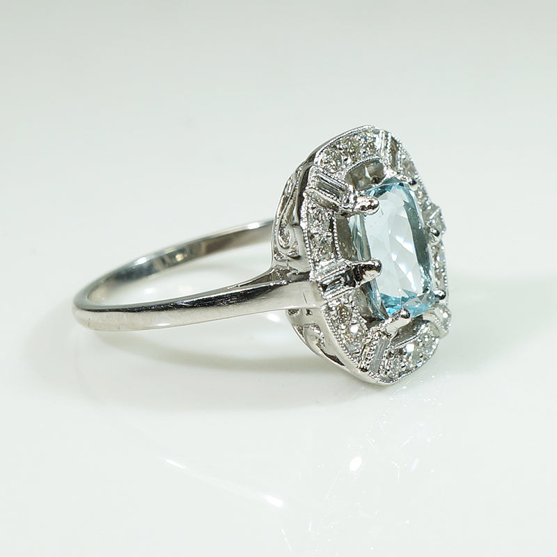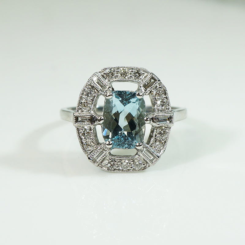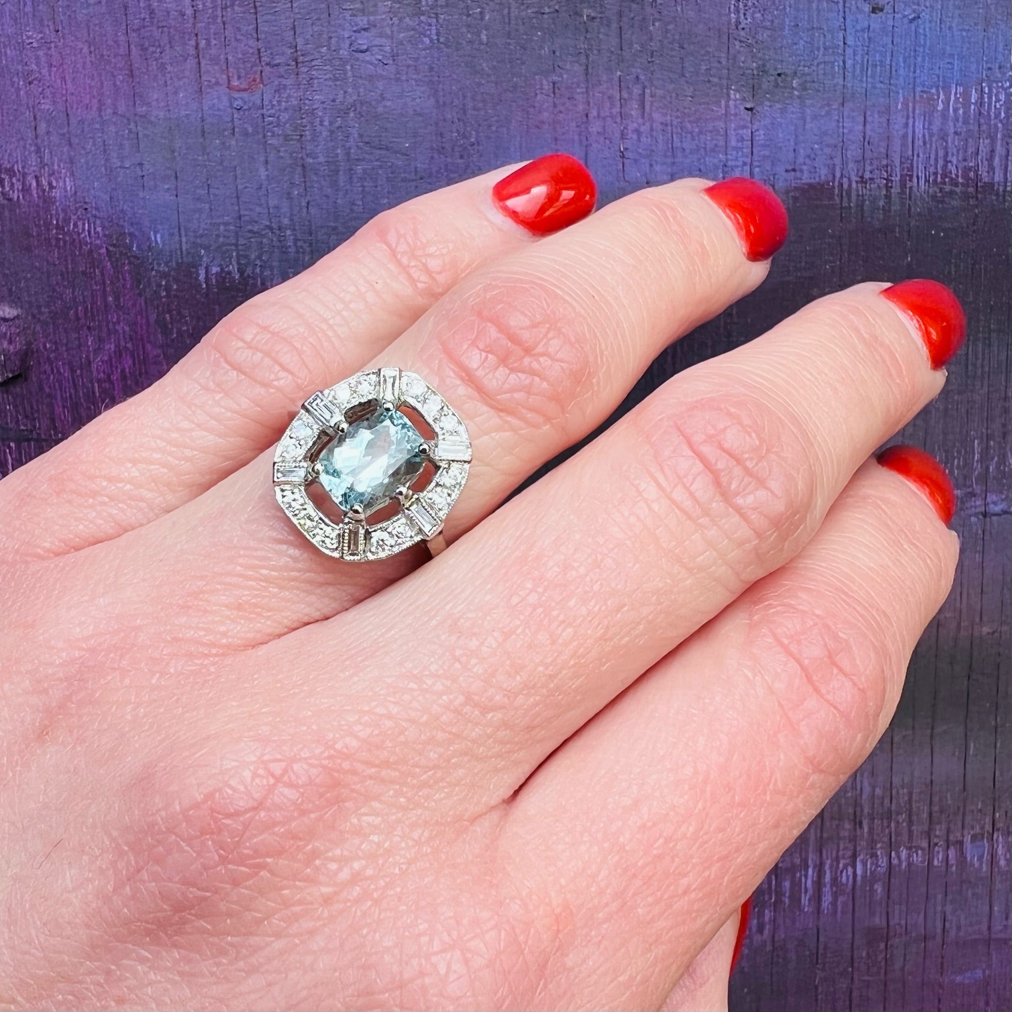 A saturated rich blue long cushion-cut Aquamarine is prong set at the center of a stunning halo of diamonds. There are six baguette-cut diamonds in the halo, each terminating into the prongs that hold the mesmerizing blue jewel in the center. The aquamarine appears to hover in its diamond border, with the light open space all around it adding to its beauty. Dating from circa 1930 this stunner is platinum, the natural Aquamarine is 1.43 carats and there are .50tcw of bright white diamonds. One of my favourite things about vintage jewels is that the back is as pretty as the front check out the 3rd picture for all the detail.