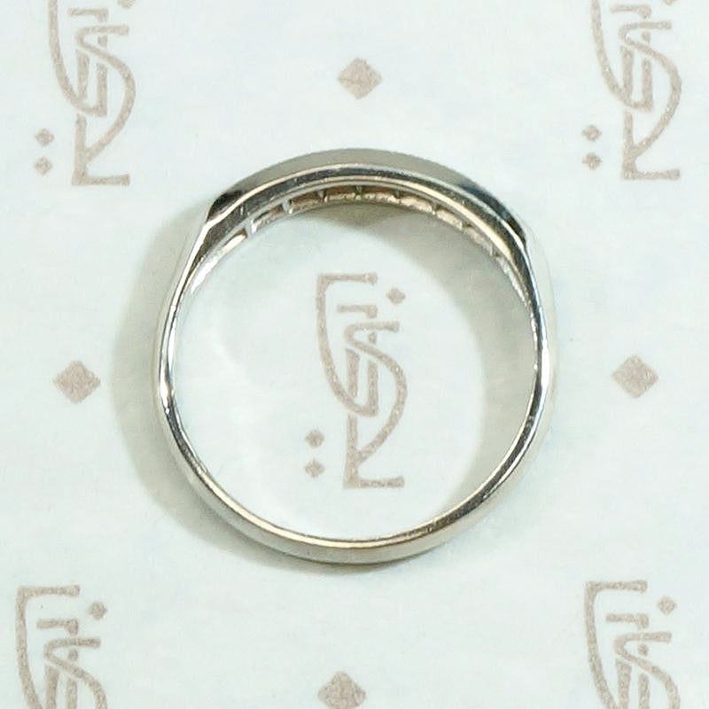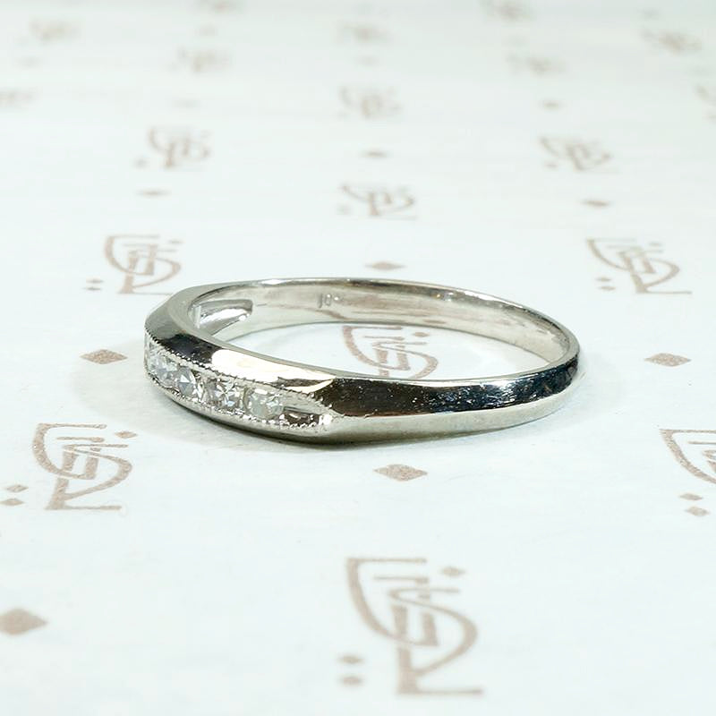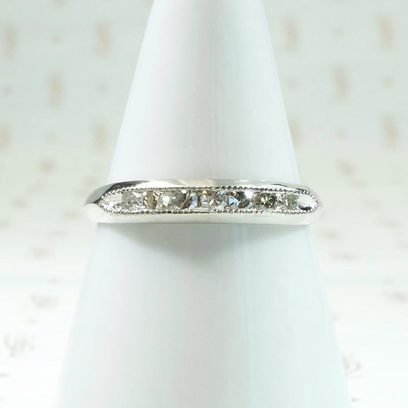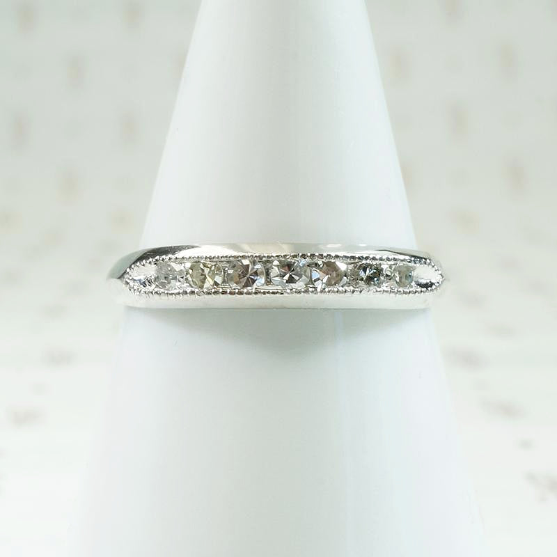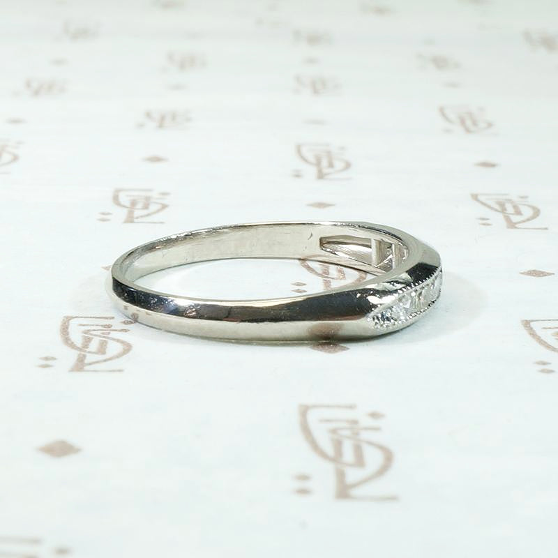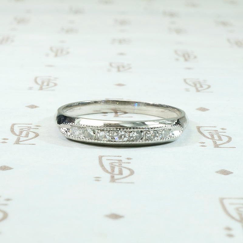 A crisp and lovely vintage platinum band with seven sparkling diamonds. The diamonds are channel set; the channel is framed in milgrain. The row of diamonds is flanked by a pointed design element. The shoulder taper gently into a knife edge band. A classic. Beautiful worn in a stack or paired with your vintage engagement ring. Circa 1940.