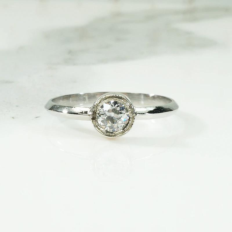 Our jewelers have paired a vintage bezel set old European cut diamond with a modern recycled platinum band to wonderful effect. The vintage bezel is engraved platinum layered over 14k rose gold, a subtle and very pretty detail. The sparkling old diamond has SI clarity with an H color, and the platinum band has a crisp knife edge detail. Clean, sleek lines give this solitaire engagement ring a timeless appeal. It will pair beautifully with many different styles of wedding bands.