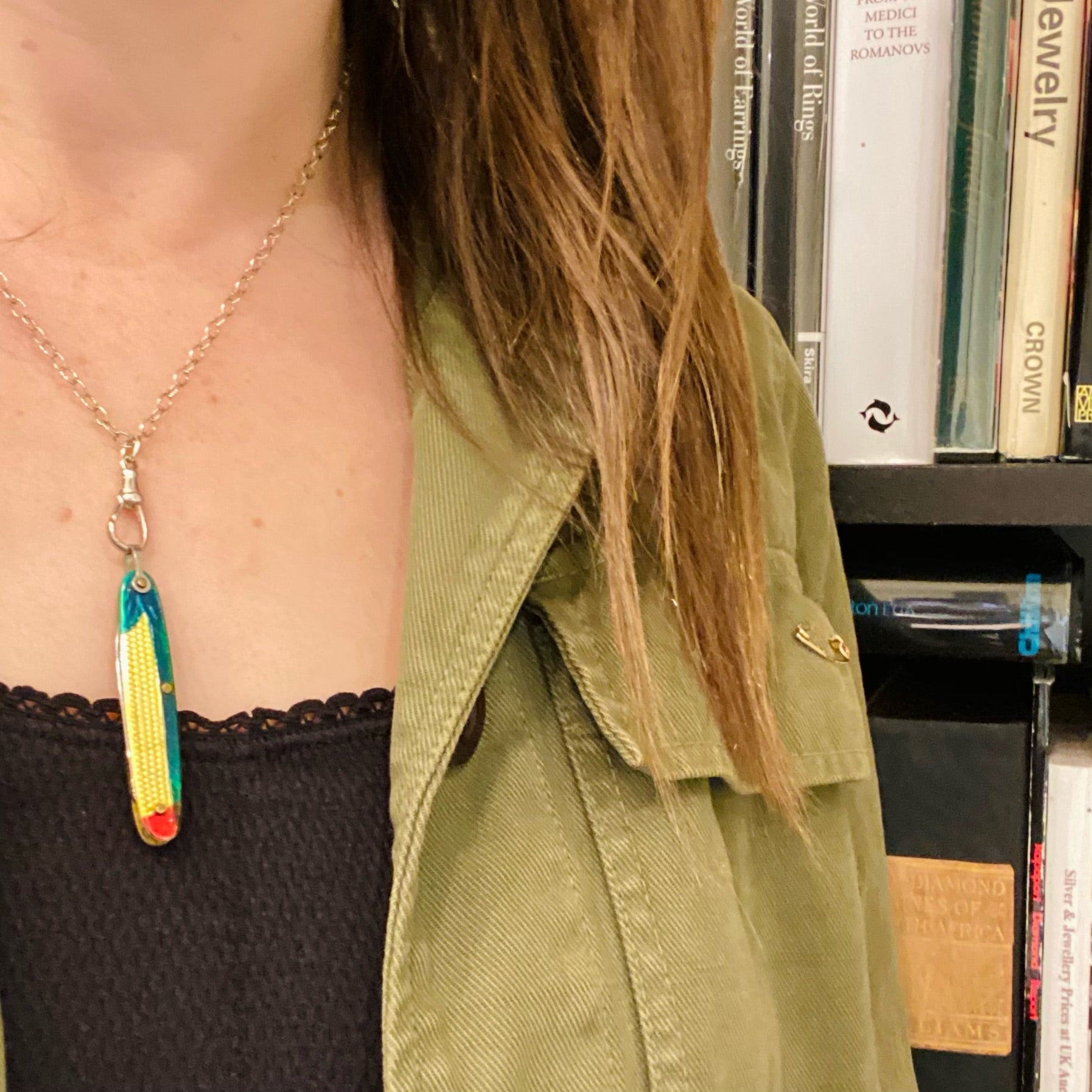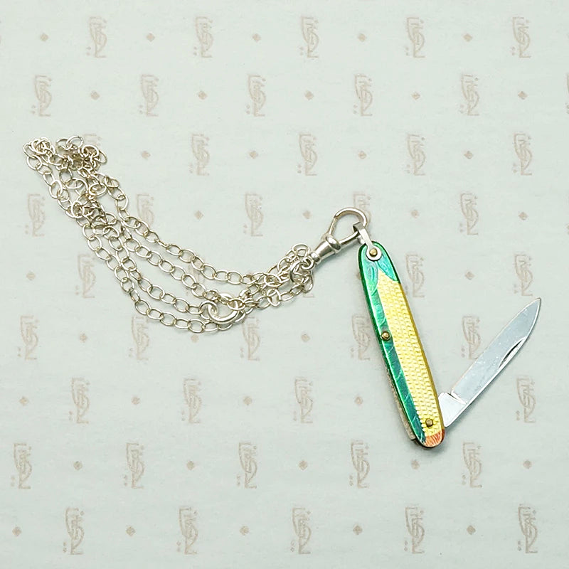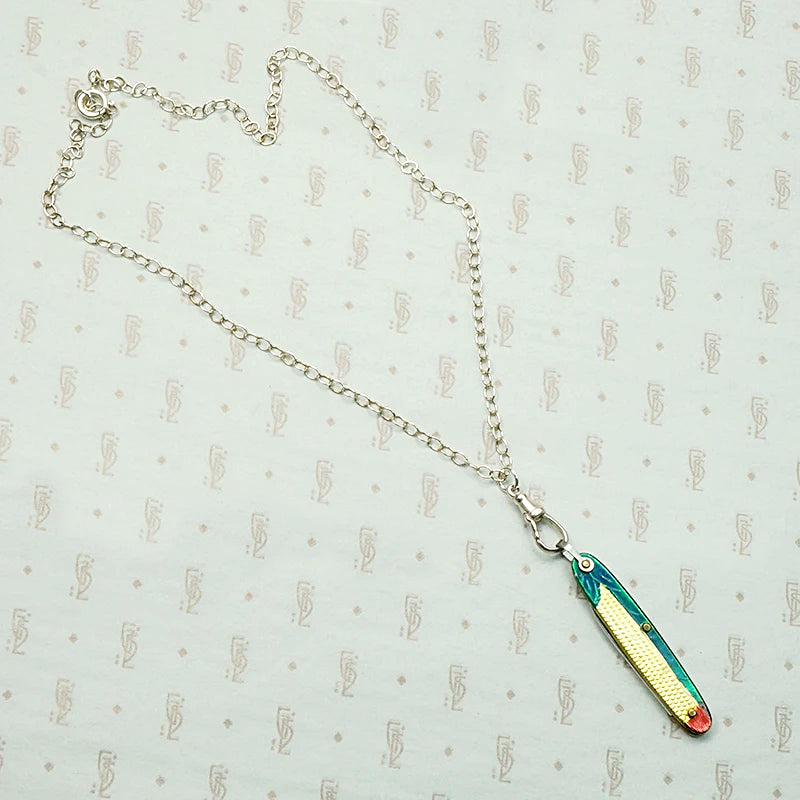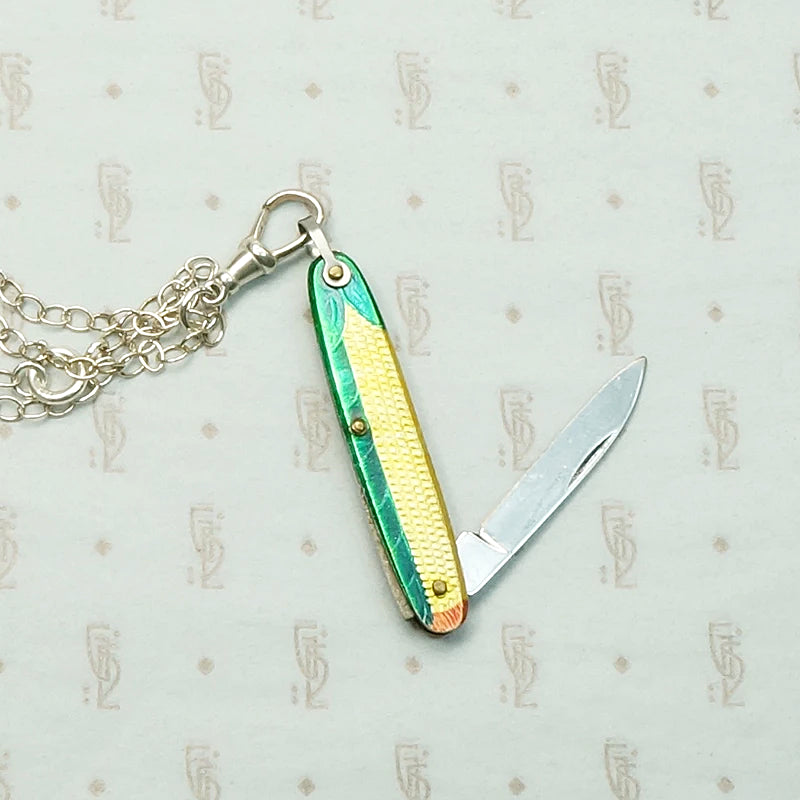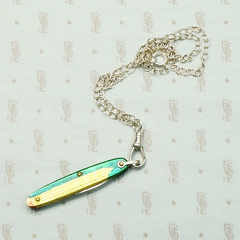 A charmingly kitschy necklace, with a tiny vintage folding knife painted to resemble an ear of corn. The brightly-colored and highly detailed case holds a single blade. The corny wee knife hangs from a recycled sterling silver chain with a sterling watch hook. You never know when you will need a useful little blade, and this one is playful and surreal along the lines of Schiaparelli. Circa 1930.