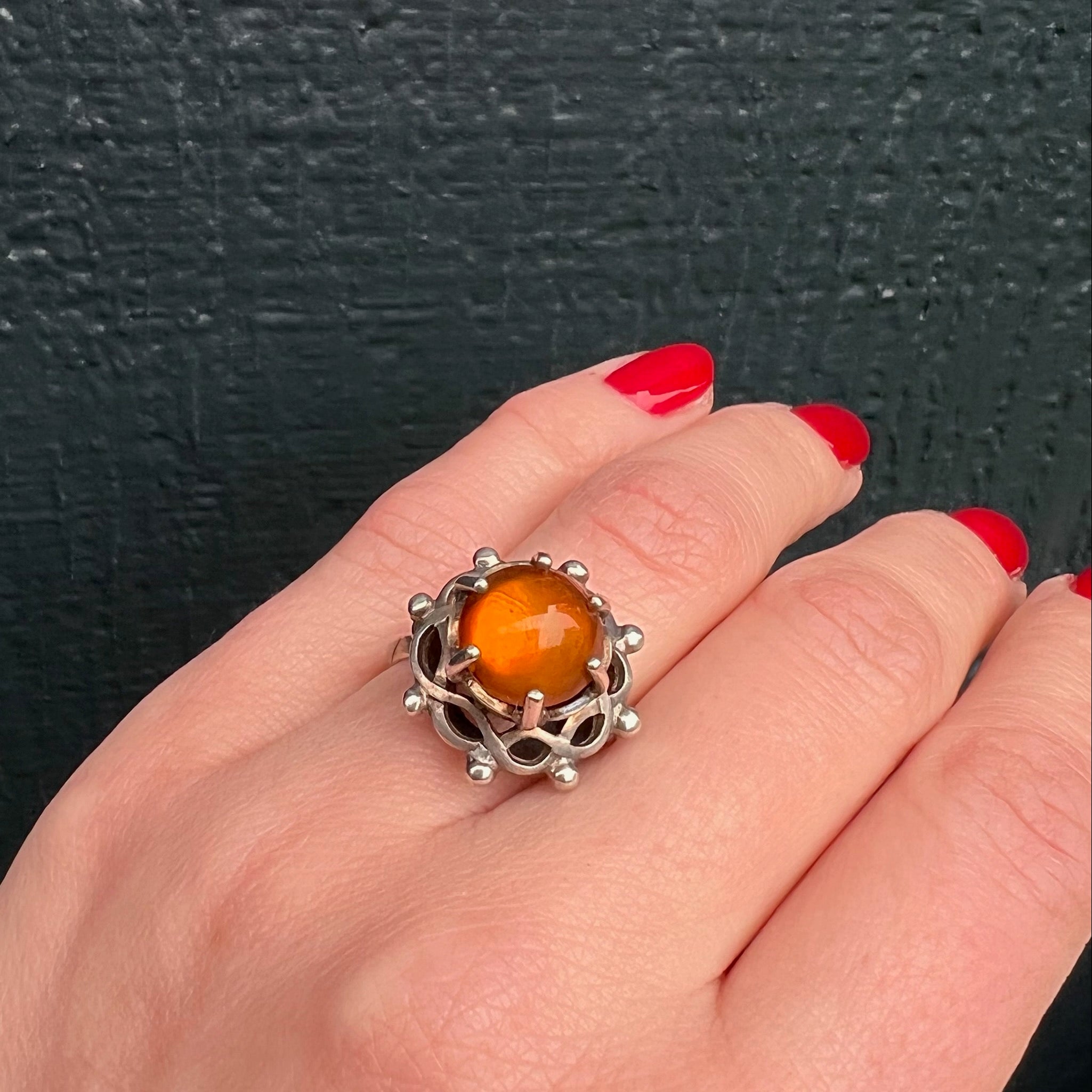 A powerful sterling silver and amber ring with a Brutalist aesthetic, it feels both ancient and futuristic. A cabochon of warm, glowing amber stands proudly, held in its bezel by six long prongs. The amber sits above a round silver dome with a scalloped openwork frame that recalls traditional Scandinavian design. Silver beads embellish the frame's interstices. The decorative top sits above a knife edge band that is engraved with a zig zag pattern. The interior of the band is engraved "STG.SILV" and is stamped with an unidentified kite-shaped cartouche. This ring feels like a potent talisman, waiting for its enchantress.