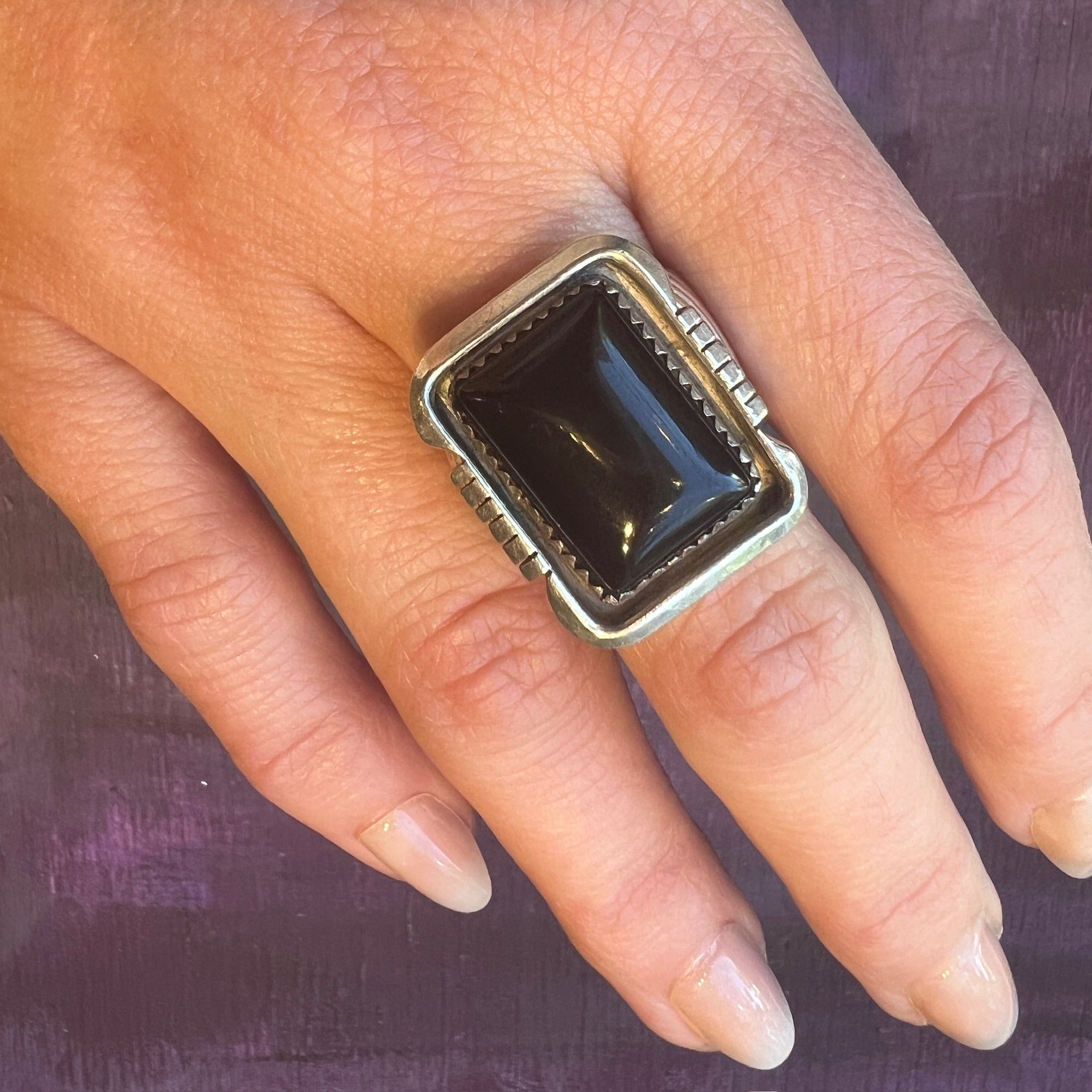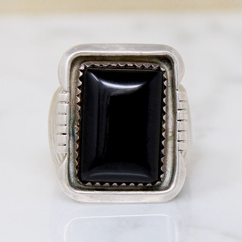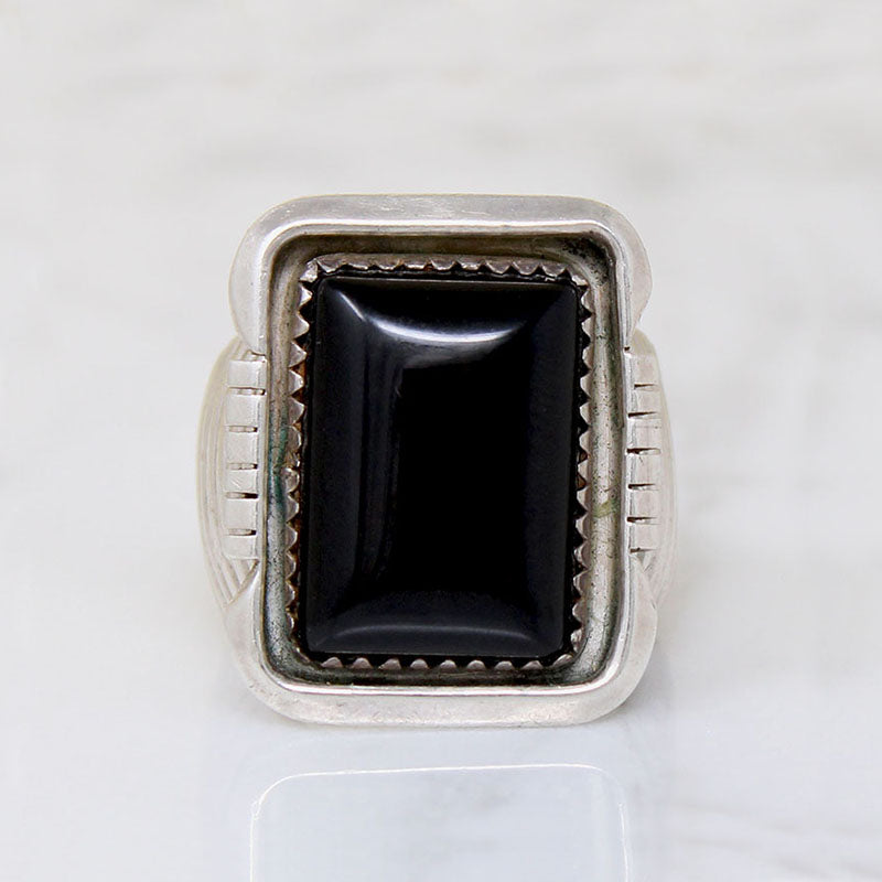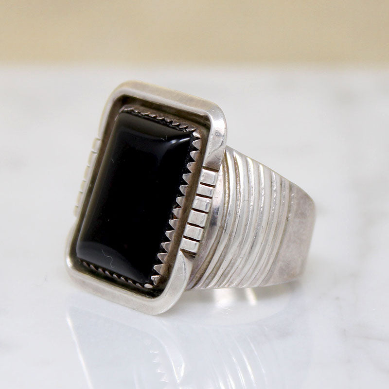 A big, bold Native American onyx and sterling silver ring with sophisticated Modernist design sensibility. The glossy black onyx sits in a hand-cut sawtooth bezel, inset in a rectangular shadowbox frame. The silver frame is slashed at each shoulder to create a ribbed effect. Very wide, vertically grooved shoulders taper into a thick band. A sizing band is soldered into the ring; it can be removed, making the ring a larger size. This handsome ring is powerful and potent, perfect if you are seeking a little dominion in your life. Circa 1970.