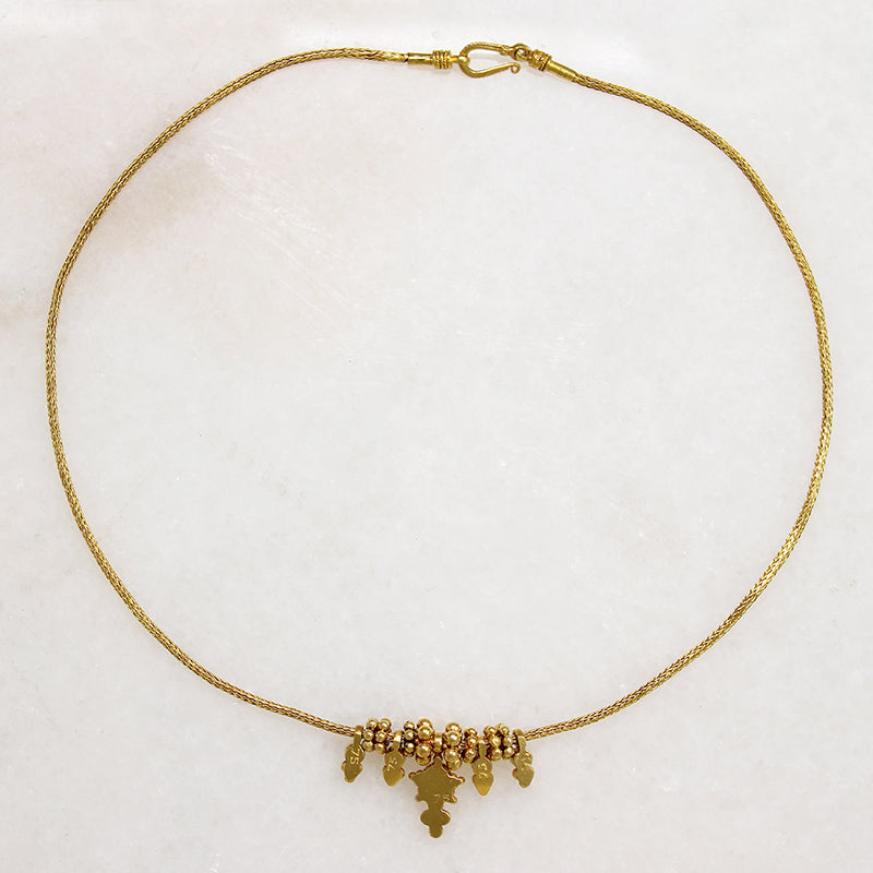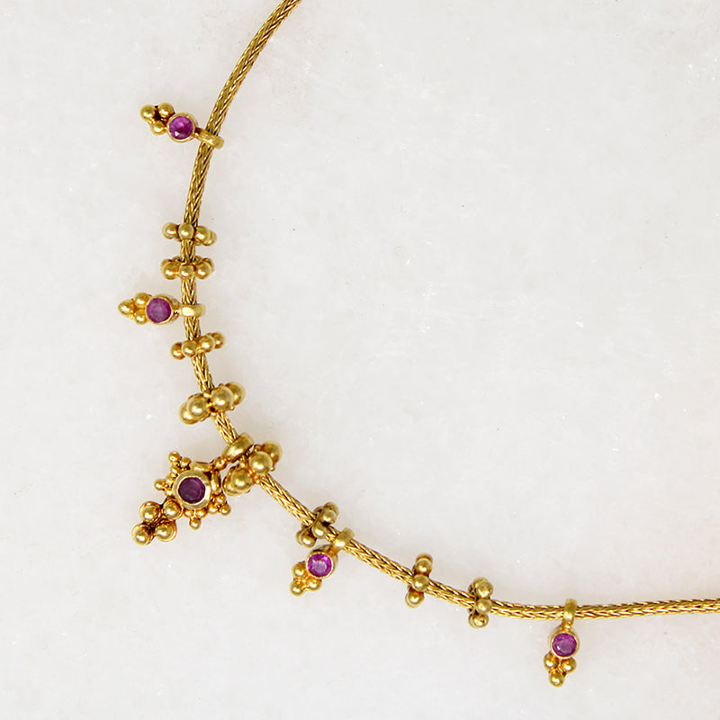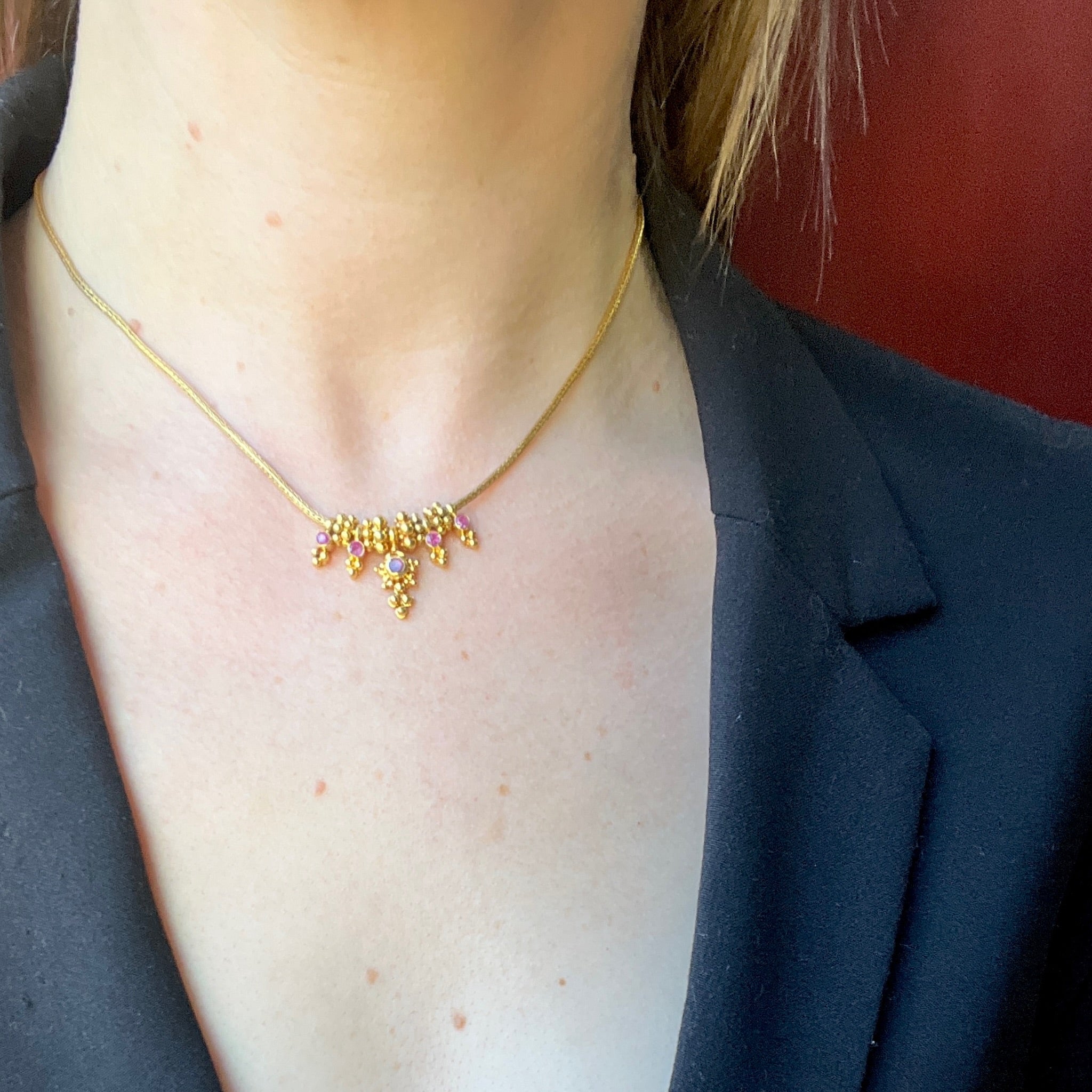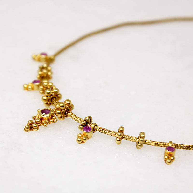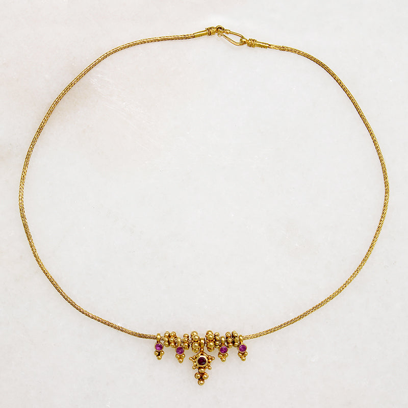 A gorgeous 18k gold and ruby necklace made in the Pradesh style. Ruby-set drops and beads of 18k gold slide freely on a choker-length chain of tightly woven gold. The drops and beads are embellished with applied gold balls. The chain is finished with a decorative hook and eye clasp. High-karat gold and rich, raspberry-red rubies are such a sumptuous combination that this necklace will make you feel like a queen. Circa 1970.