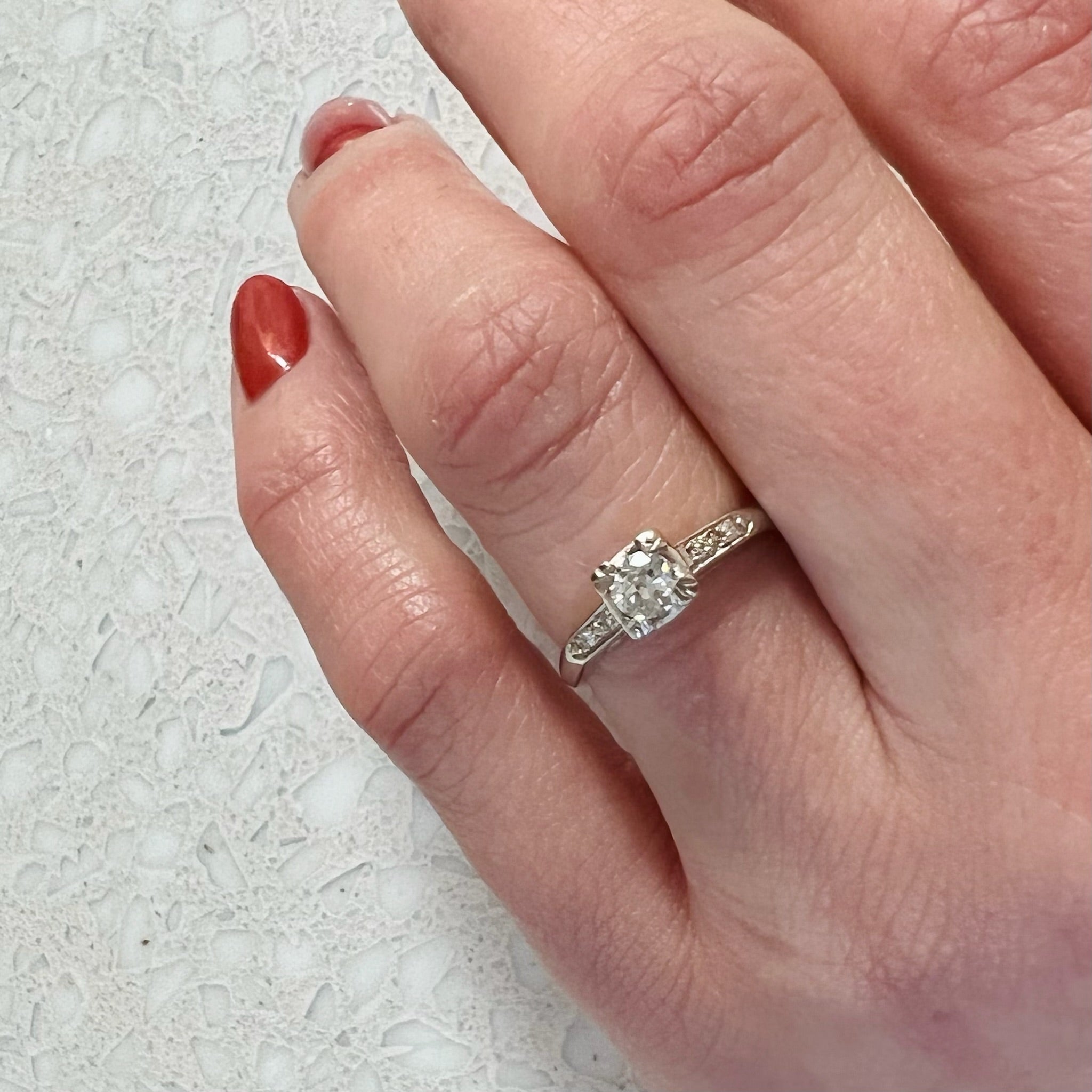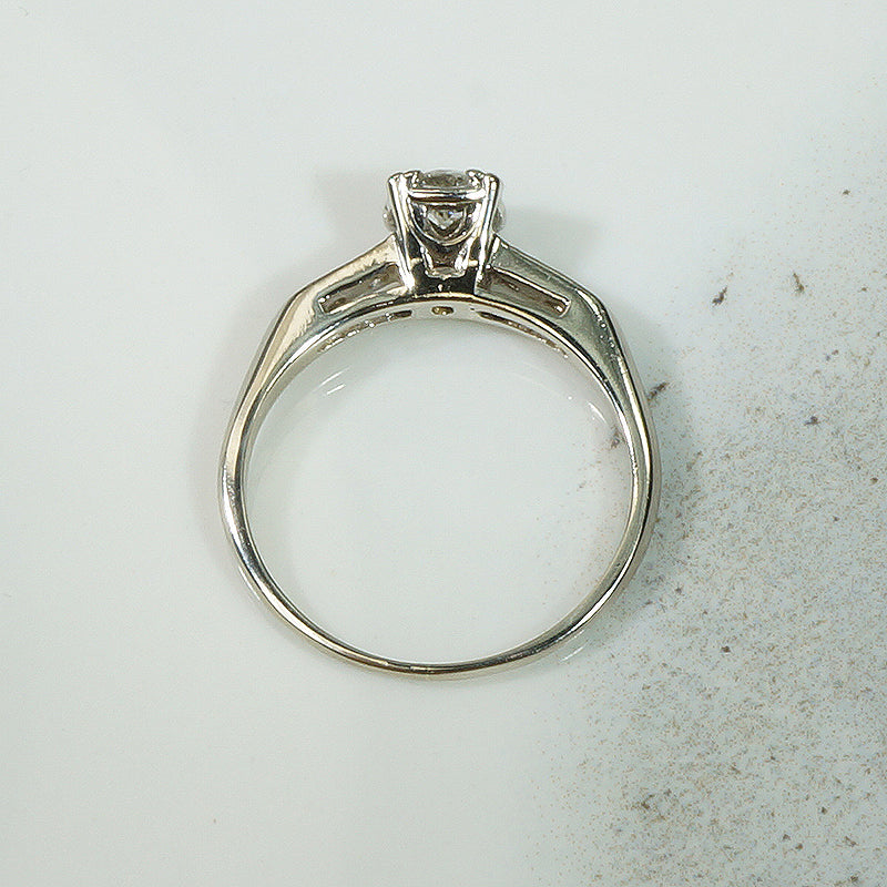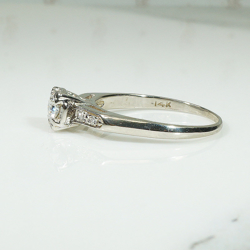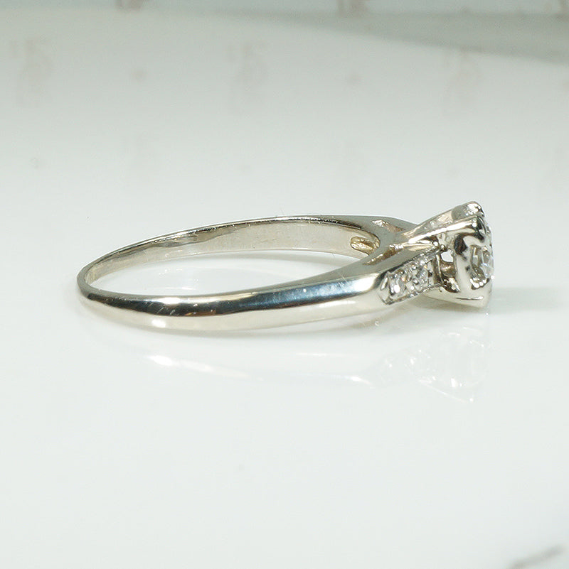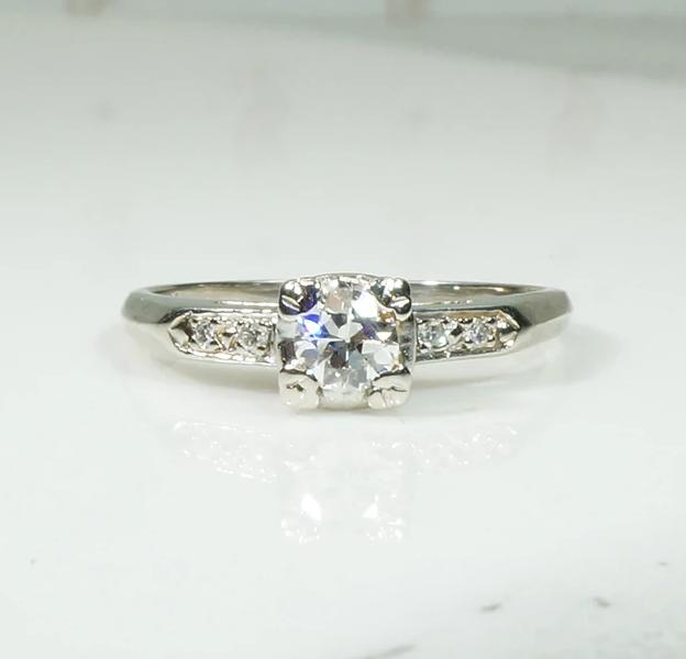 This is a lovely classic 1940's diamond engagement ring set with a .35ct Old European cut diamond, sparkly and white. The sides of this pretty ring are set with 2 tiny round diamonds which terminate in a softened knife edge band. 14k white gold. This will pair nicely with a band.