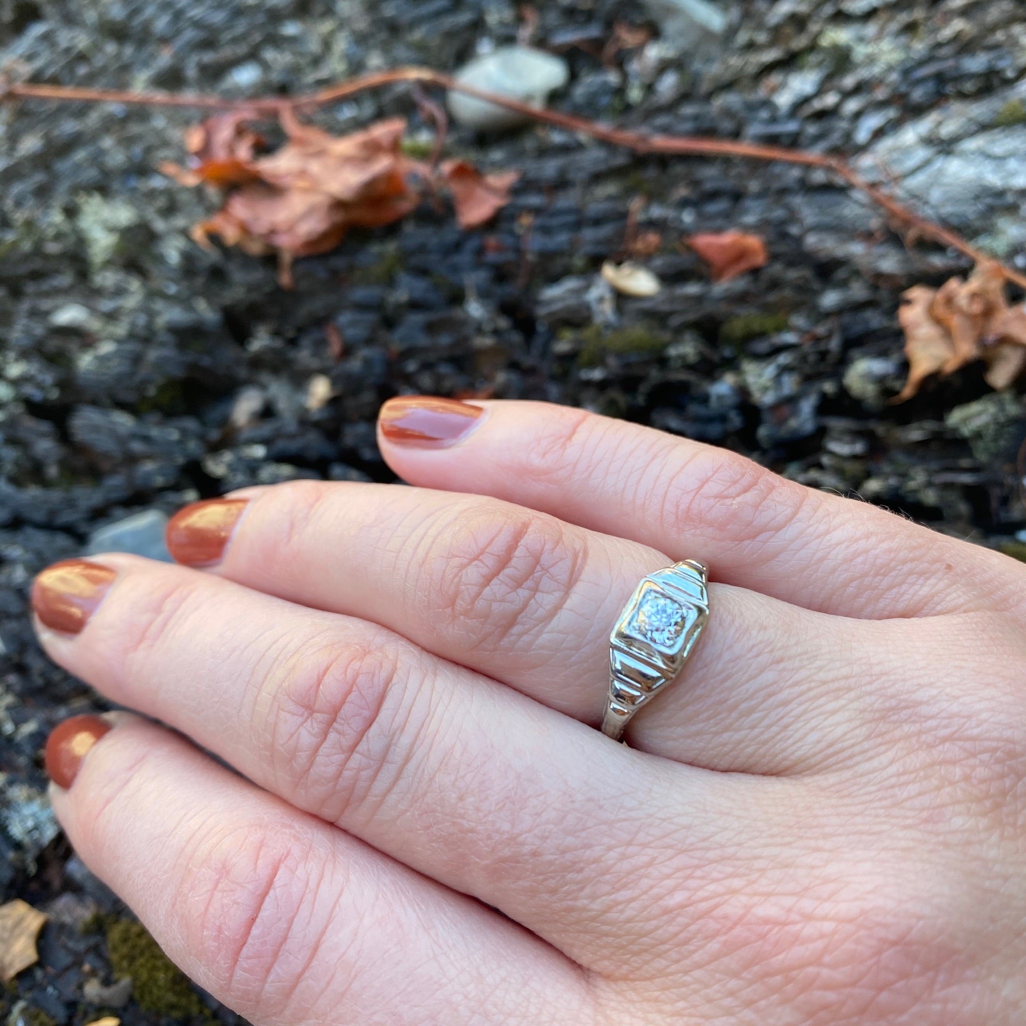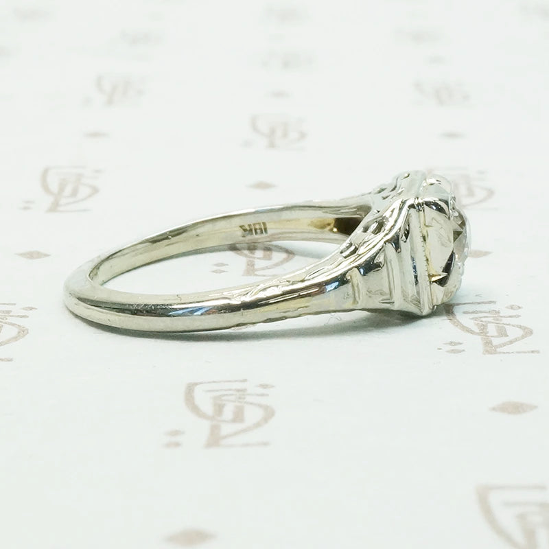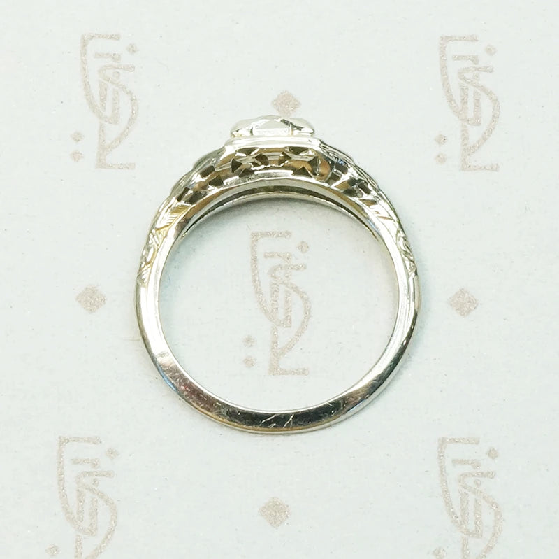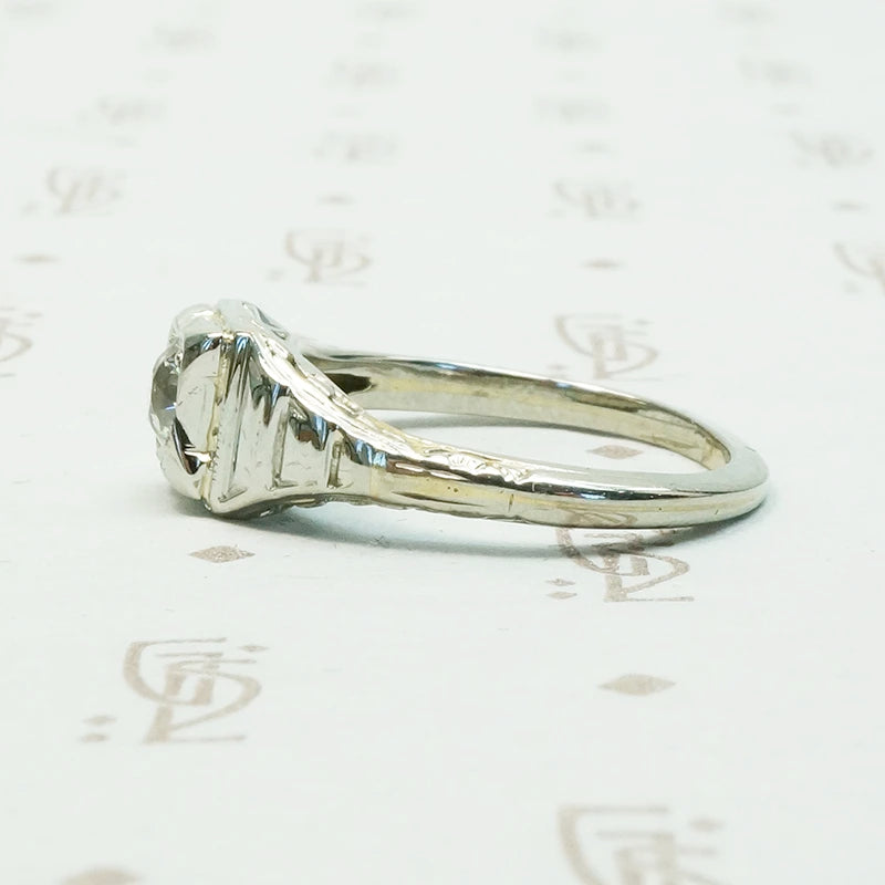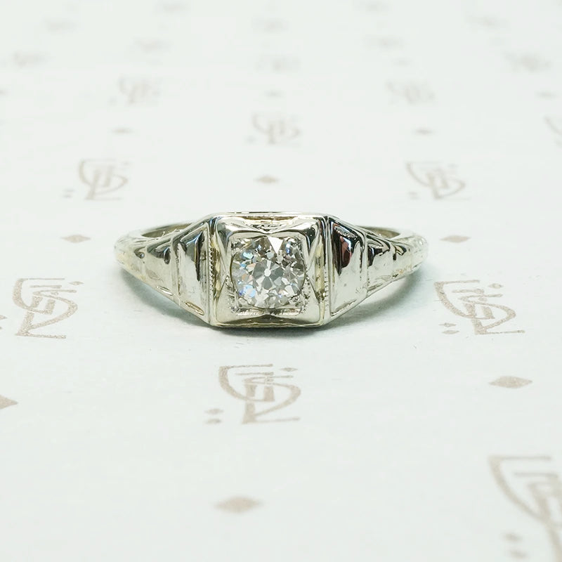 This 1930's 18k white gold diamond engagement ring has classic deco geometric step side designs and filigree decoration. The diamond is .30ct , white and clear old european cut.