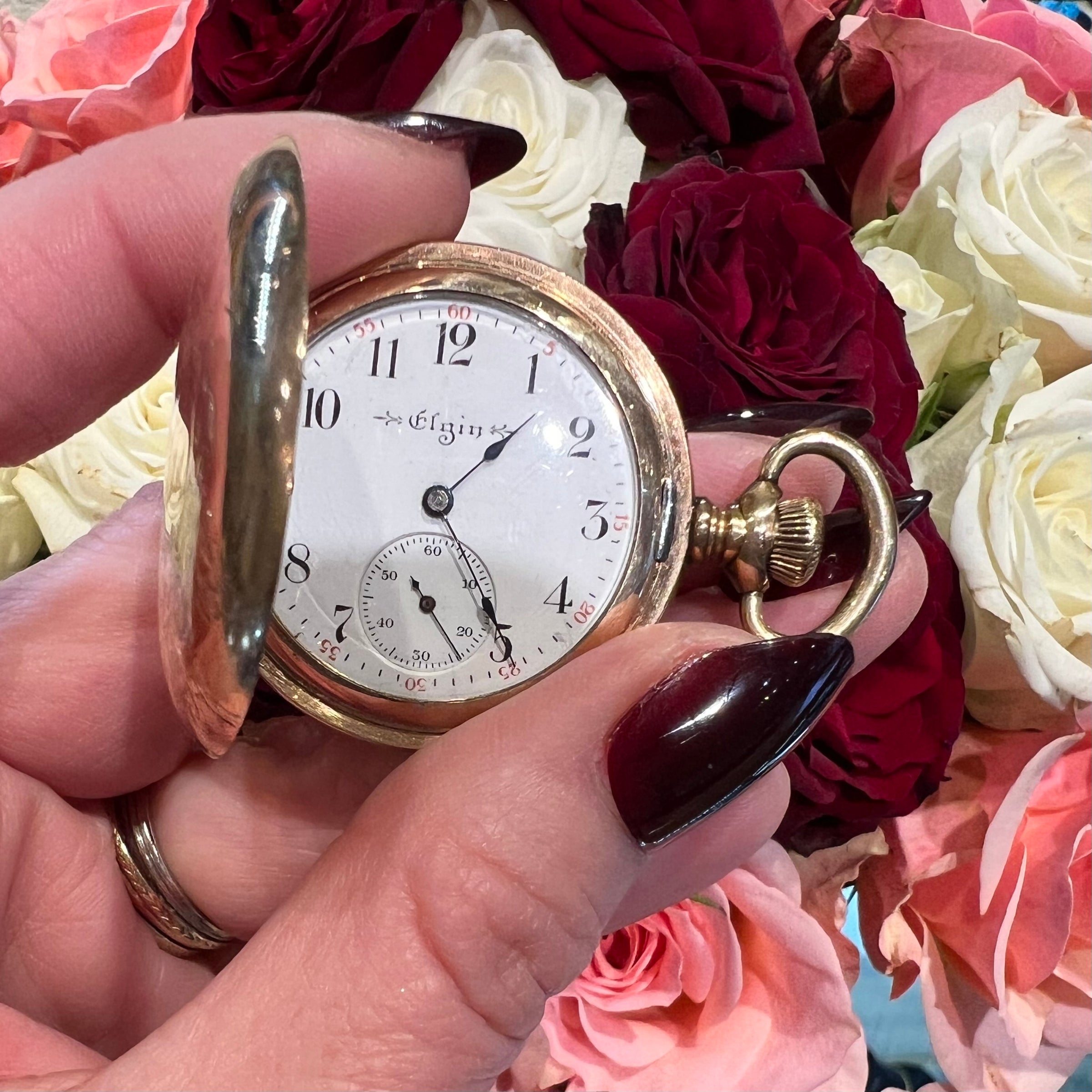 Hand engraving covers this pretty yellow gold-filled pendant watch. Dating from circa 1900; this beauty was designed to hang pendant style from a watch chain, but could just as easily tuck into your watch pocket. The movement is signed Elgin Natl Watch Co 15 jewels. The face is also signed Elgin. There is a sweet farm scene engraved on one side, complete with a silo. Although we can't guarantee our watches run perfectly, as we are jewelers and not watchmakers, I can tell you that in a 24-hour period, this watch only lost about 4 minutes and otherwise ran well.