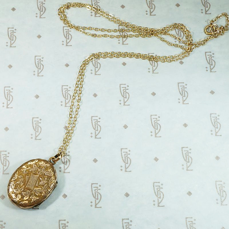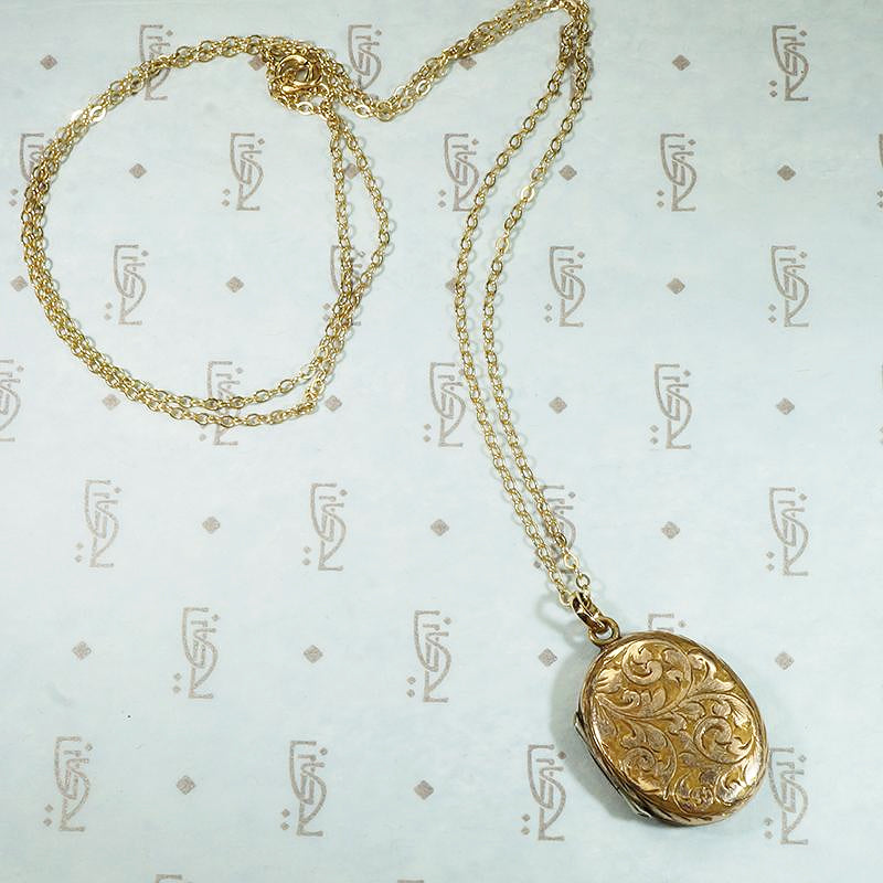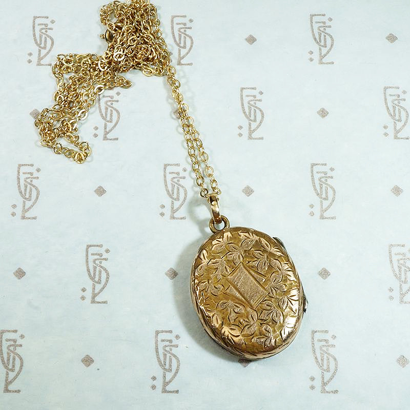 A pretty Victorian gold-filled oval locket engraved front and back. The front of the locket is engraved with acanthus leaves, and the back of the locket is engraved with a shield and ivy leaves. The interior glass and frames are intact. So sweet, this would make a charming Mother's Day gift. Circa 1860.