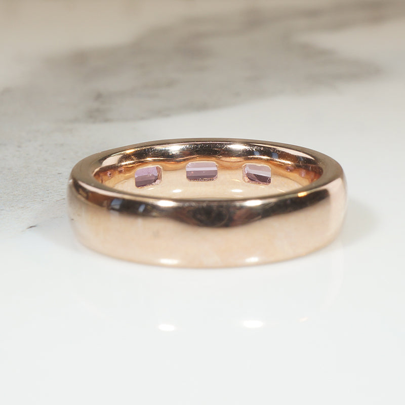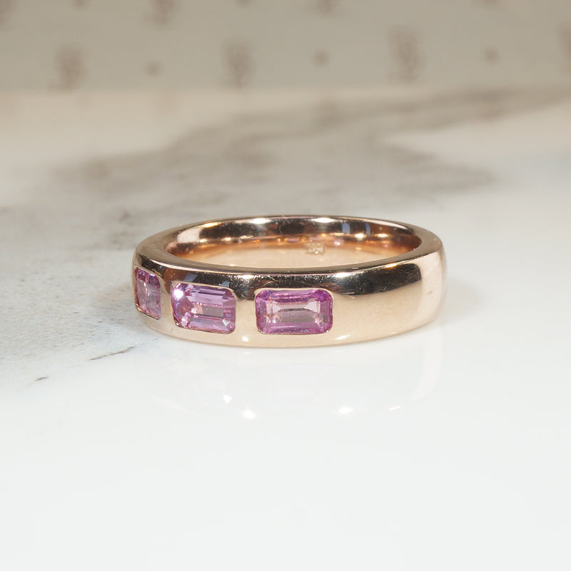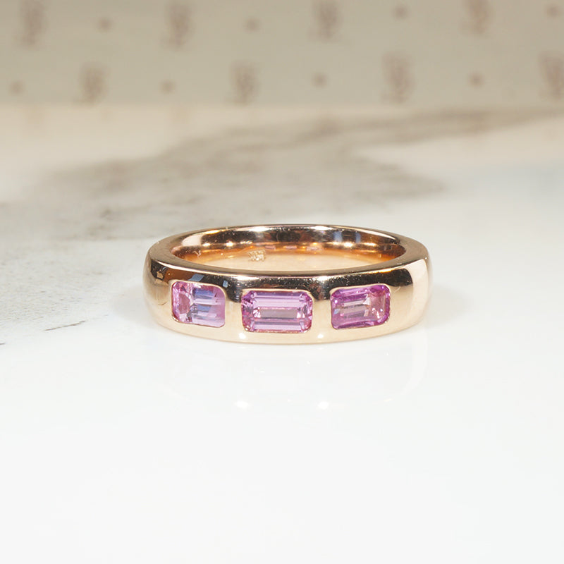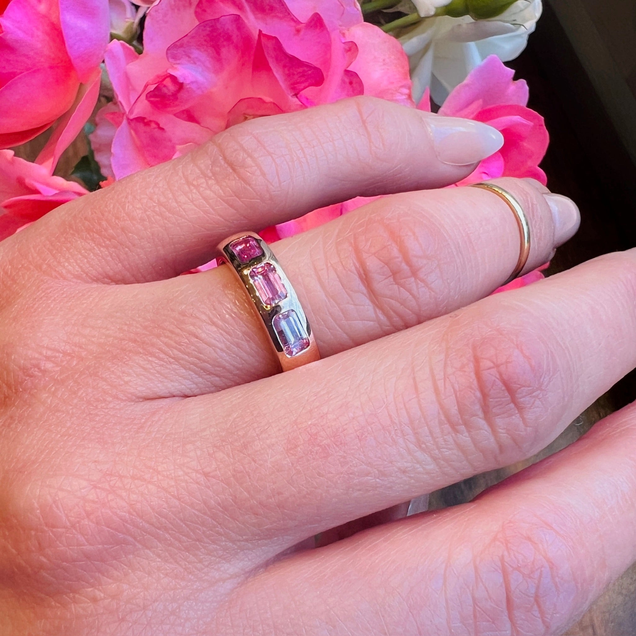 Pretty in pink ... three emerald-cut pink sapphires all in a row, inset in a curvaceous rose gold band. The blushing vintage sapphires are set horizontally across the top of the ring. The chunky 14k recycled gold band has a half-round exterior and comfort fit interior, giving it a substantial yet buttery soft feel on the finger. The use of ethically sourced materials, such as vintage gems and recycled gold, allows you to wear this charming ring with pride.