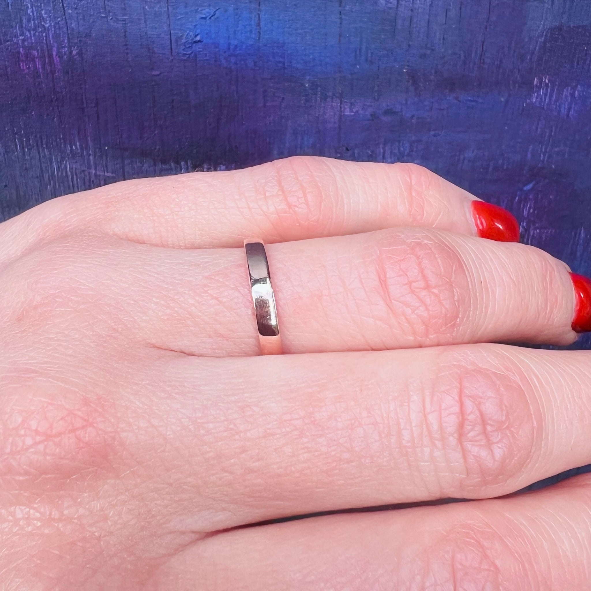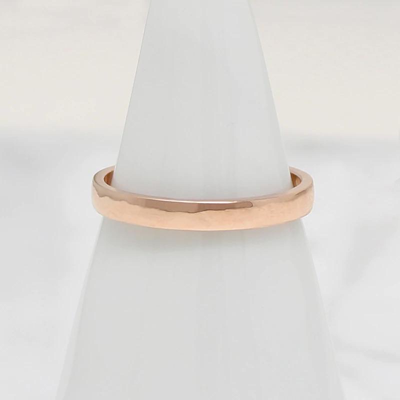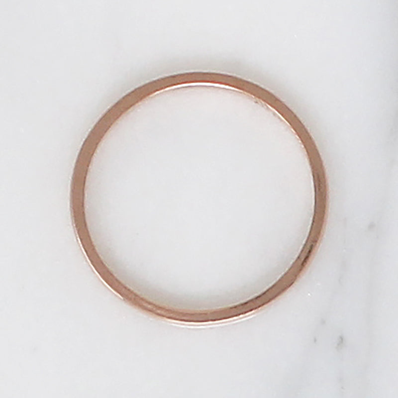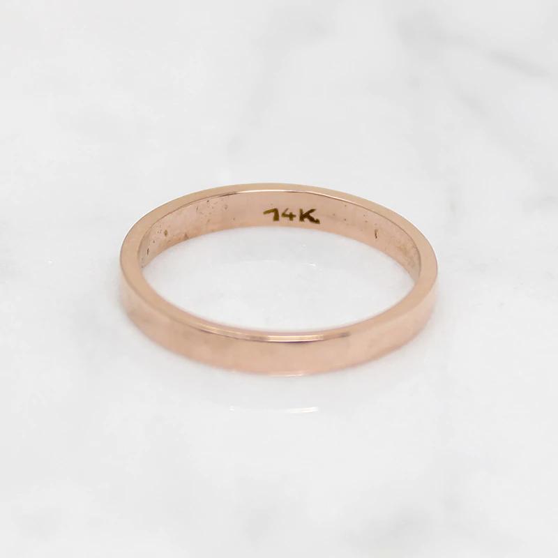 This 14k rose gold wedding band is a pretty pastel hue. The slim band has a very shallow half round exterior and a flat interior. Pair this band with your vintage engagement ring, or add it to your stack for a pop of blushing color. Circa 1980.