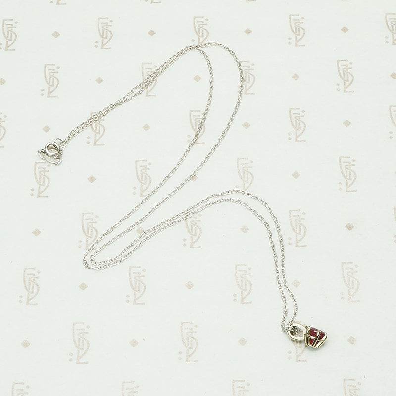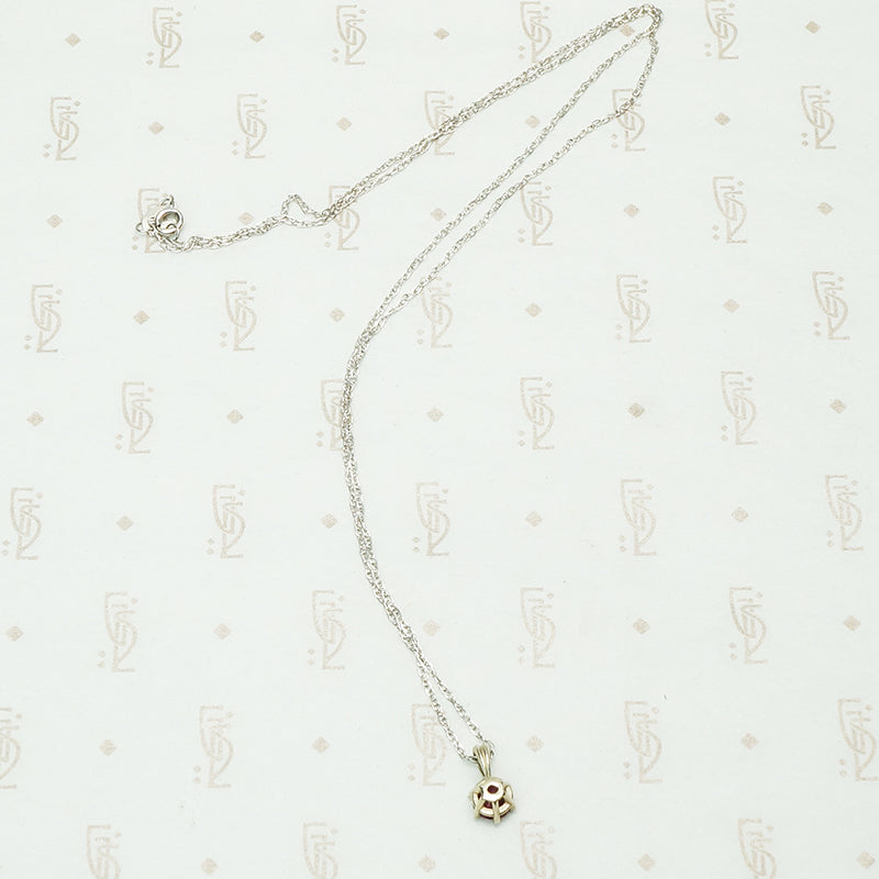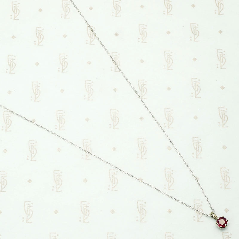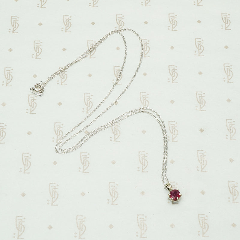 A .35ct vintage ruby is held in a 6 prong 14k white gold setting. The pretty red sparkling jewel is suspended from a white gold rope chain. A classic.