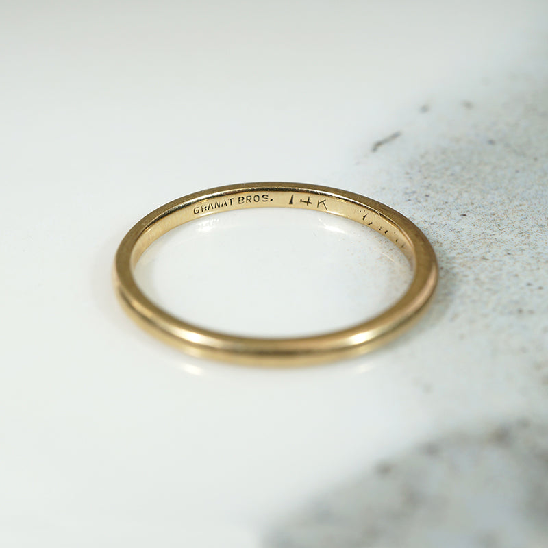 This vintage 14k yellow gold wedding band is signed by Granat Bros. The very slender band has deep, flat edges, a flat interior, and a subtle half-round exterior. This is the perfect band for when you want just a pretty slip of a thing. Circa 1940.