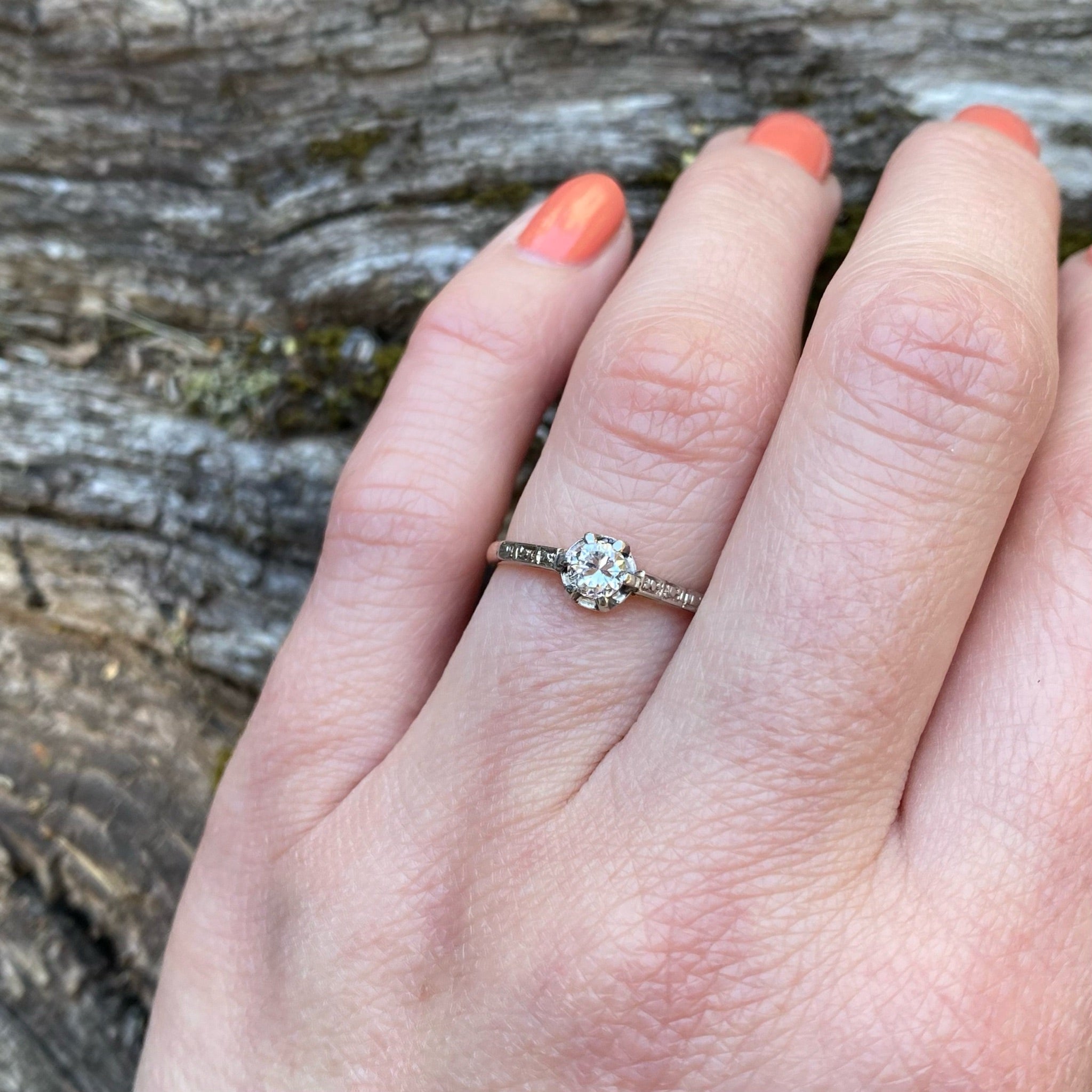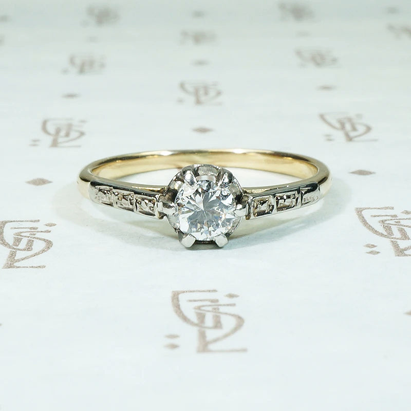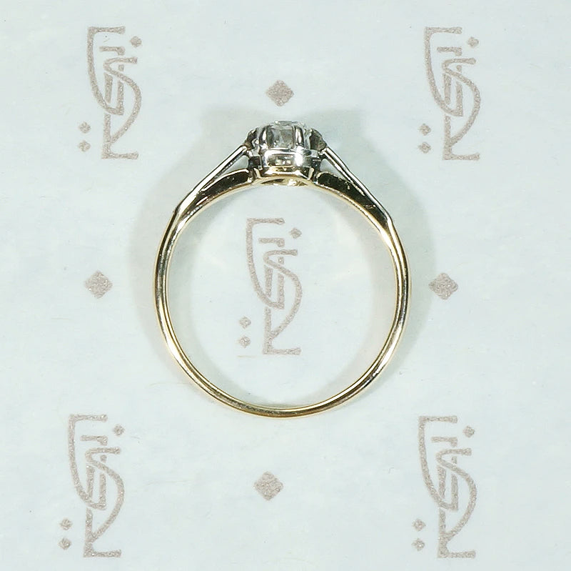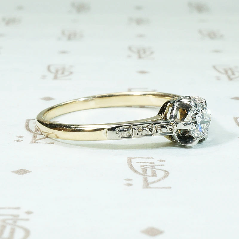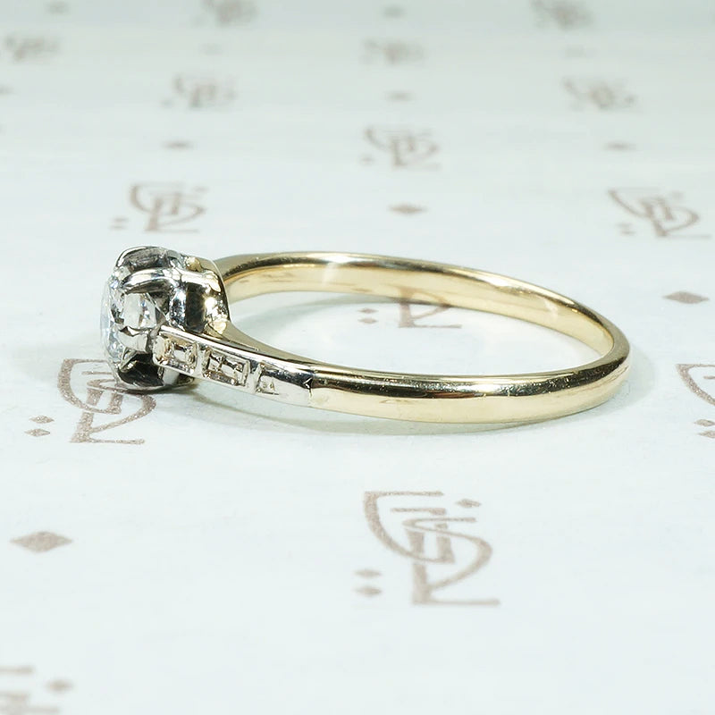 A lovely Art Deco diamond engagement ring with nice details and an easy-wearing low profile. The 0.25ct diamond nestles in a six-prong platinum head that accentuates its pretty sparkle. Engraved platinum overlays gold cathedral shoulders. The body of the ring is 18ct yellow gold, marking a luxurious contrast with the white platinum. The versatility of two-tone rings is fabulous, they go with all of your jewelry and pair beautifully with a wide variety of wedding bands. This solitaire engagement ring is the perfect choice for a vintage lover who appreciates practicality. Circa 1930.