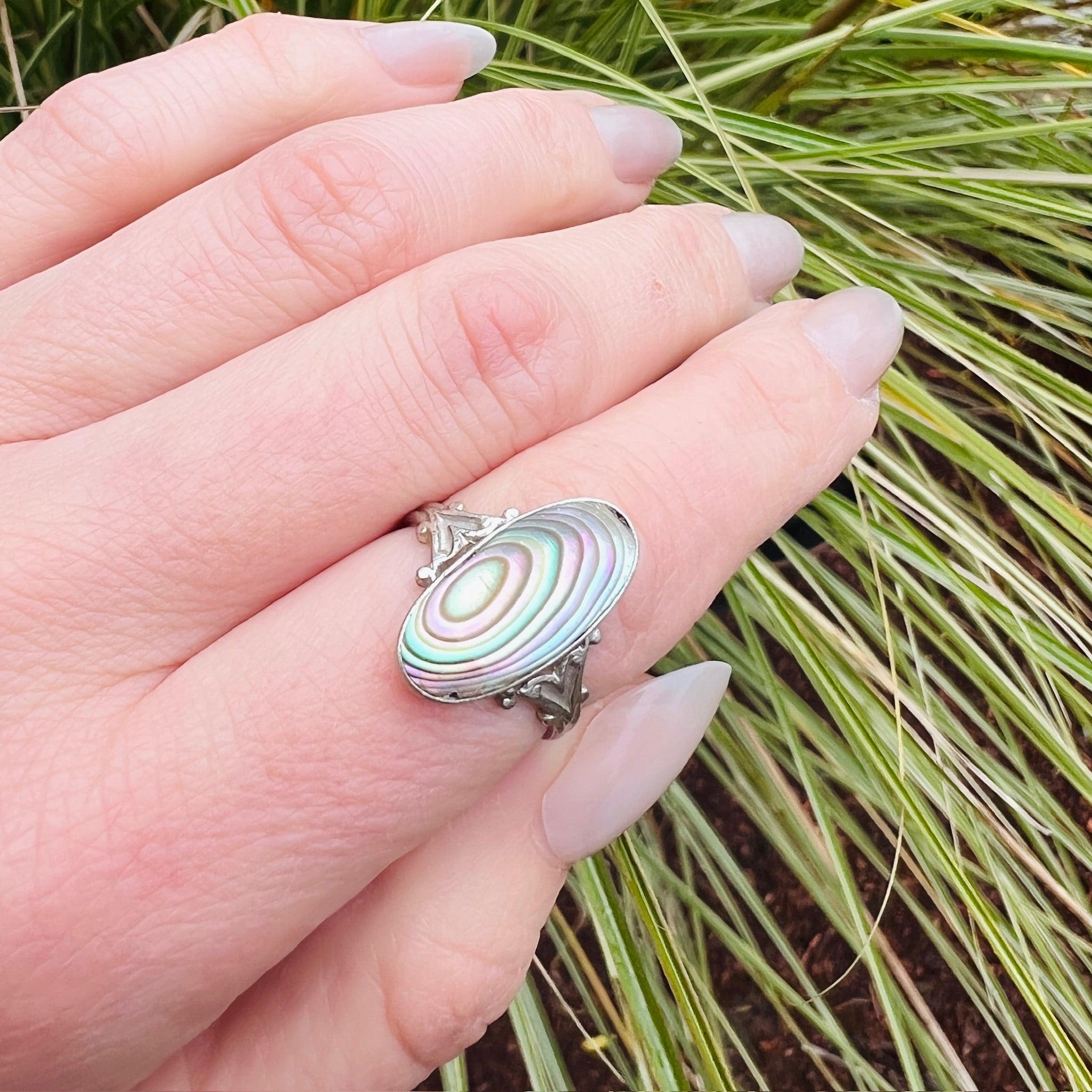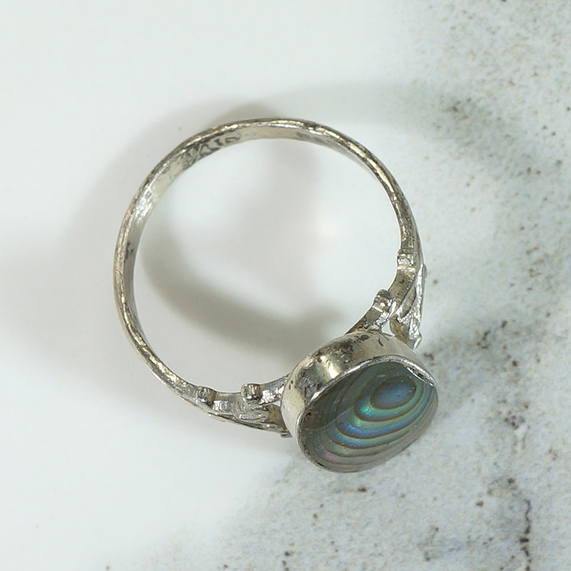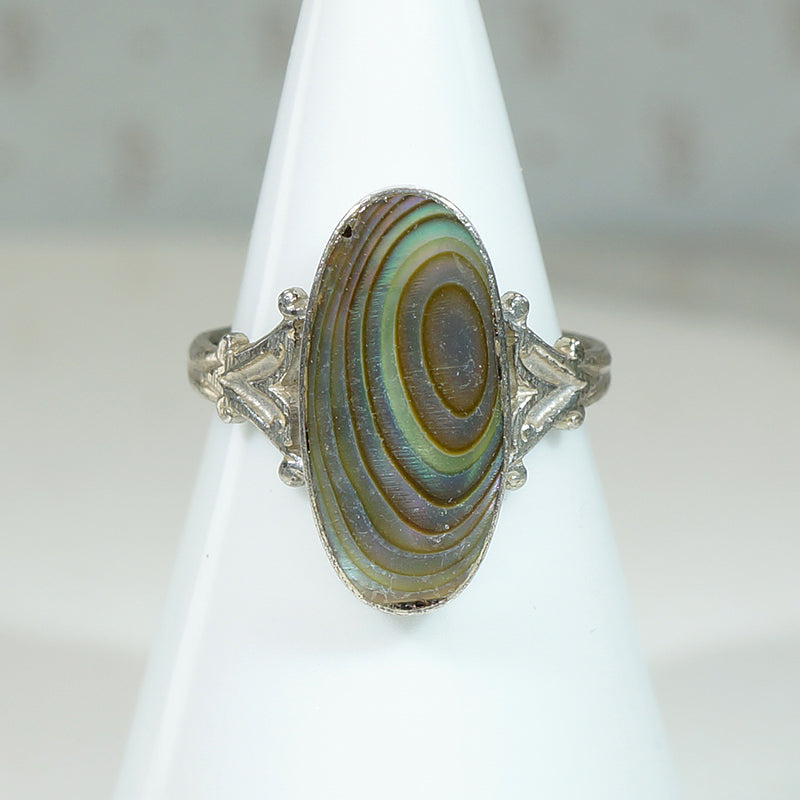 An oval slab of iridescent abalone is bezel set in an Art Deco sterling silver ring. The magical shell is richly colorful with greens, blues, pinks ... gorgeous. It's cut and positioned so its bands of color are off-center, giving the piece an almost psychedelic look. The top of the ring is marked "Sterling," it sits on decorative split shoulders over a slim band. Circa 1920.