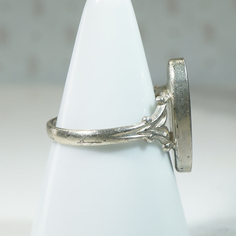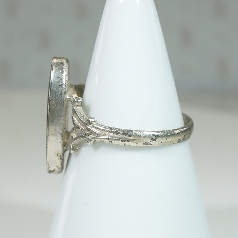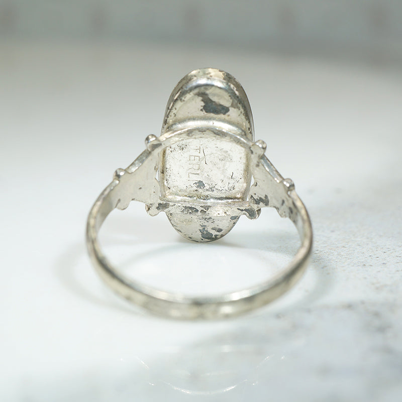 Details... Currently a size 7.75. The top of the ring measures 8.6mm by 18.4mm, and the band is 2.2mm wide. In Good Vintage Condition, the metal shows some wear. You should expect some wear on all vintage and antique jewels; we consider it part of the charm.