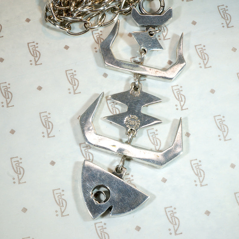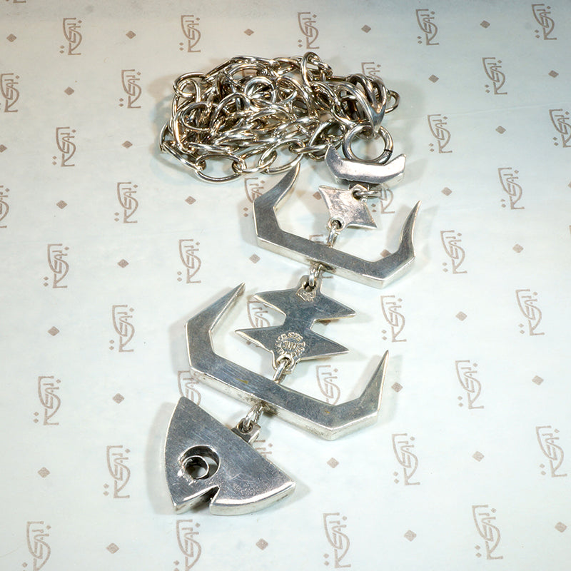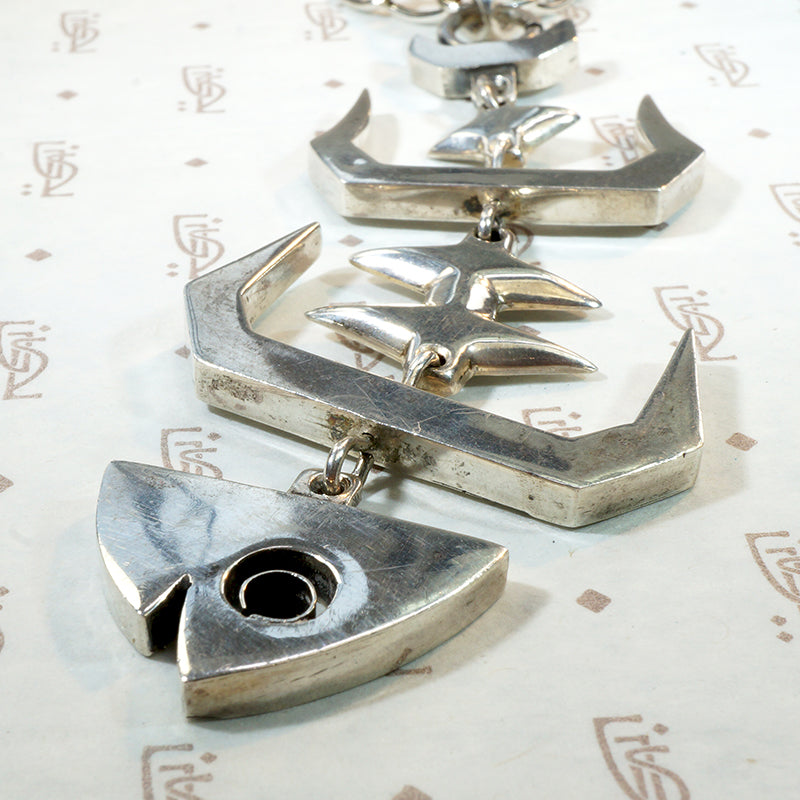 What. The. Heck. This fish skeleton necklace is completely awesome. The skeleton pendant is composed of six sterling silver segments, articulated to give them a lively wriggle. He's got it all: head, ribs, vertebrae, and tail. Stylized angles give the bones an edgy, cartoonish look. His face is everything, with big round eyes and a cute little mouth. His bony tail forms a clever bale. The dead fish hangs on a vintage sterling chain with heavy oval links. The back is marked "Taxco Mexico 925," "MMC," and it bears the Mexican eagle mark for sterling silver. This slippery fellow is large ... a big, dramatic necklace that feels awfully Punk Rock for the 1940s.