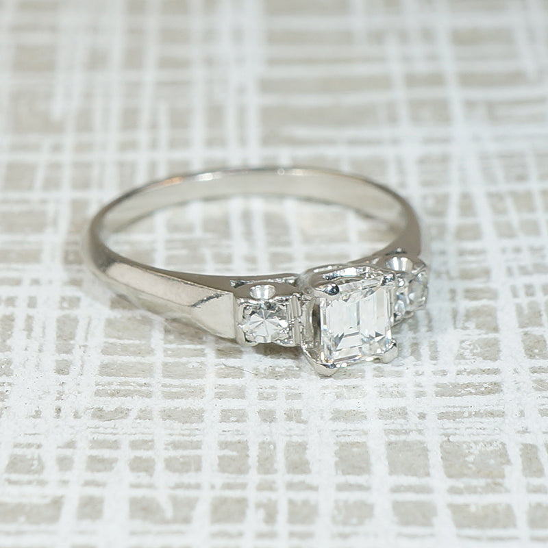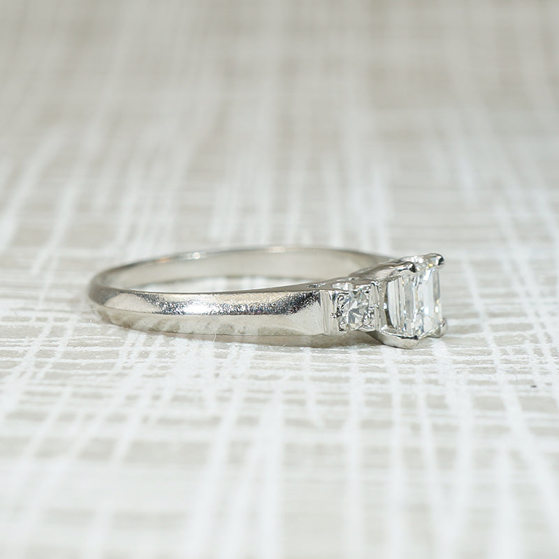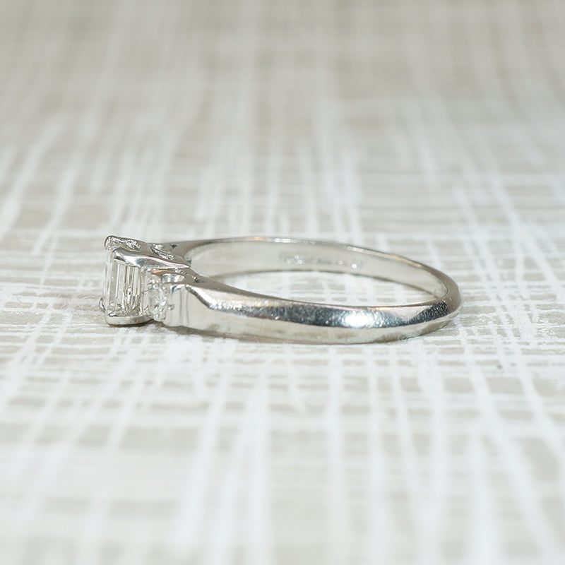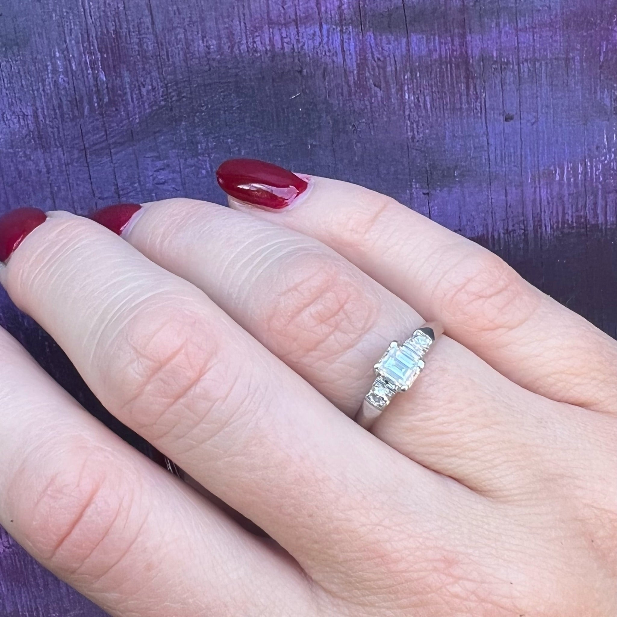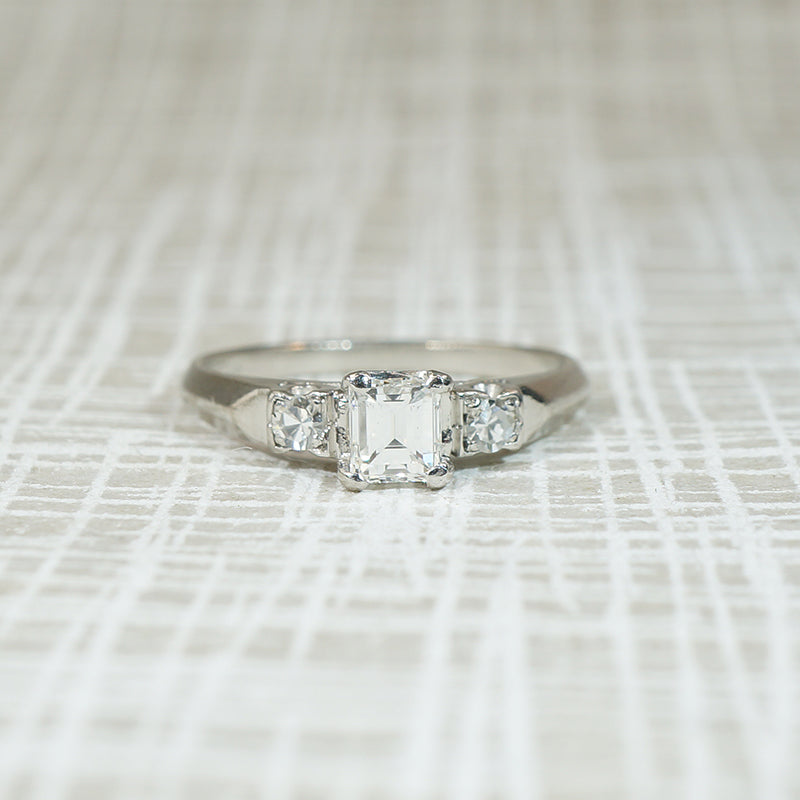 Retro is such an interesting style era, with architectural lines and industrial design elements. This Retro engagement ring is crisply elegant, with a beautiful and unusual center diamond. The 0.41ct Carré cut diamond, with VS clarity and I color, shimmers in its sleek platinum setting. Prongs hold the stone at its corners. Small round diamonds flank the raised center stone, with triangular shoulders that lead into a knife edge band. This ring is so refined and tasteful, it will always feel fashion forward. Circa 1940