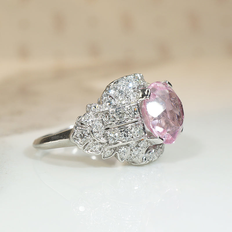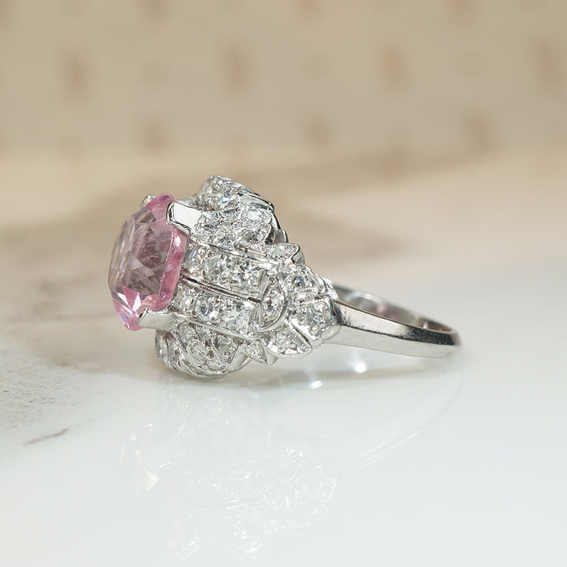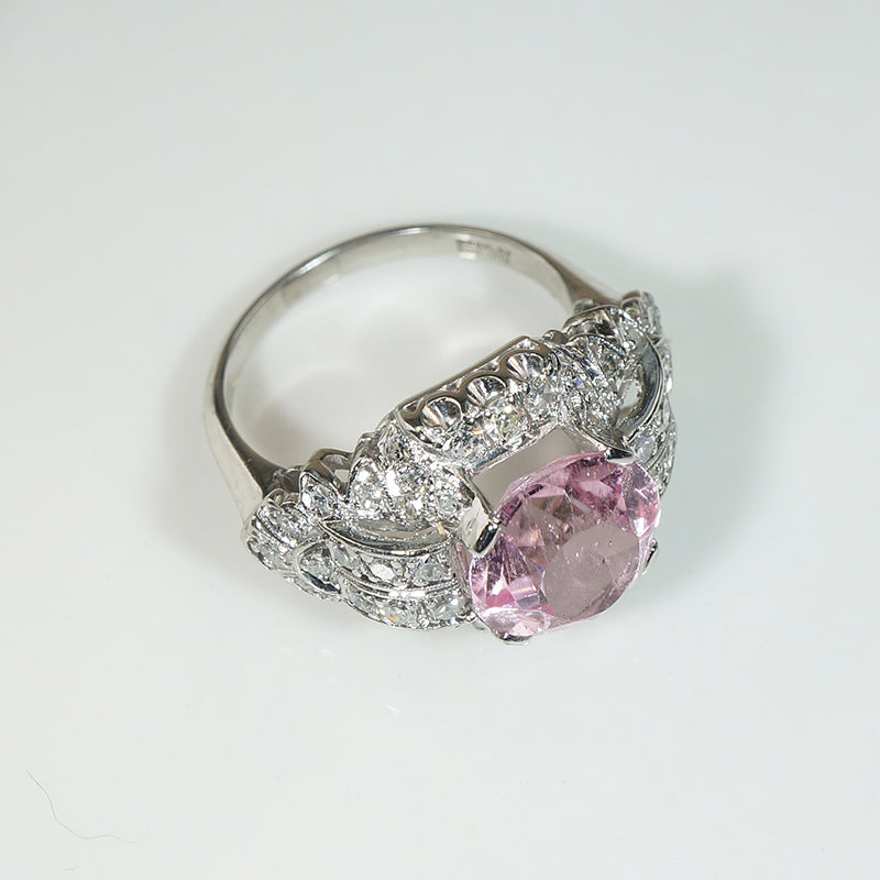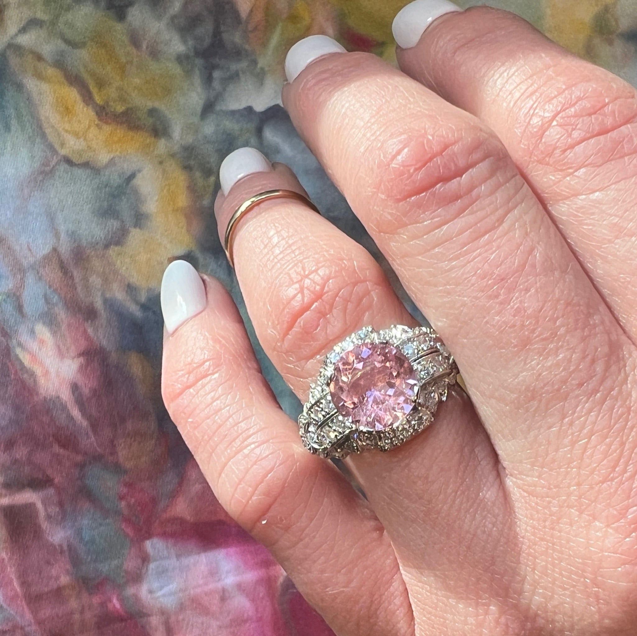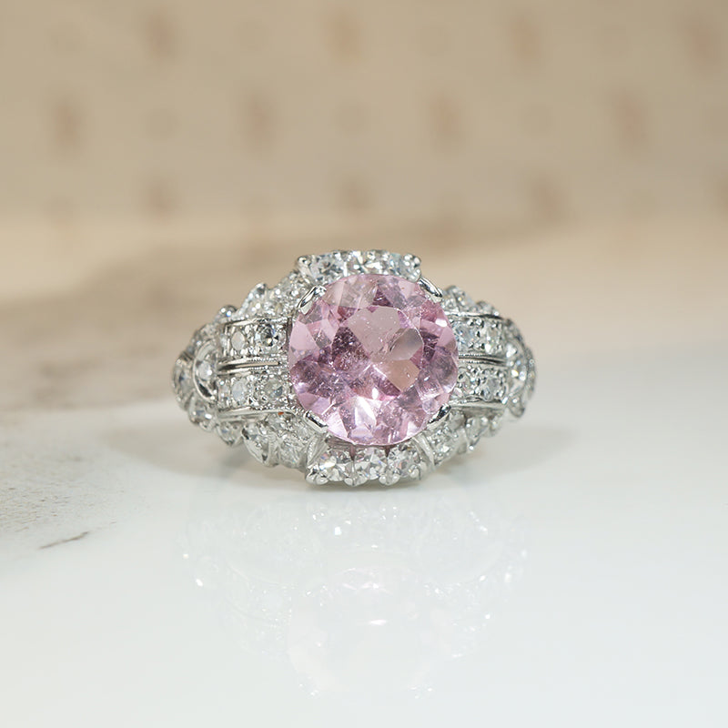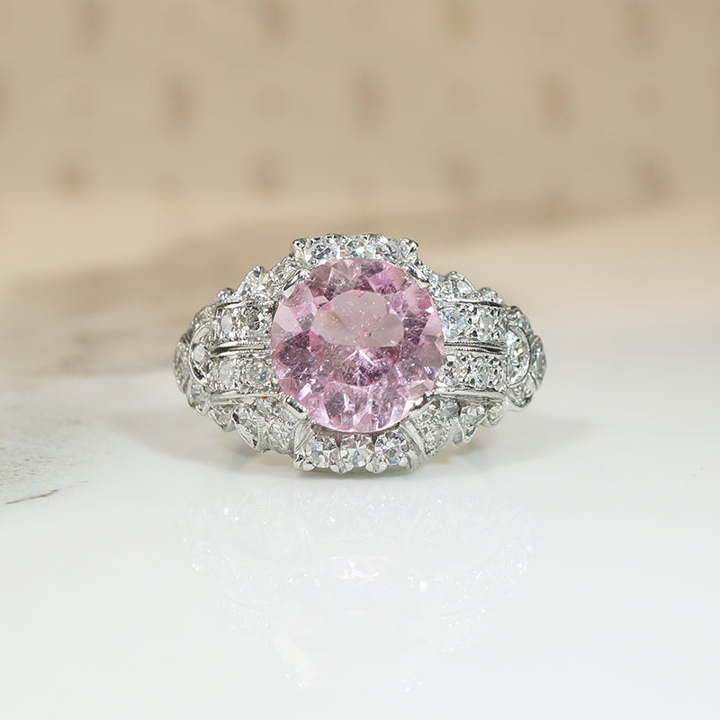 This ravishing Edwardian ring is a vision of dazzling pink and white gems set in icy platinum. A 3.43ct tourmaline of the softest, purest pink is tab set raised over a field of small round diamonds. The 1.25tcw of bright, sparkling white diamonds spangle the pierced and engraved ring, with exquisite geometry and impressive coverage that spans the finger horizontally. The opulent top of the ring sits over a tapered knife-edge band. So feminine, so delicate, with a presence that commands attention. Circa 1910.