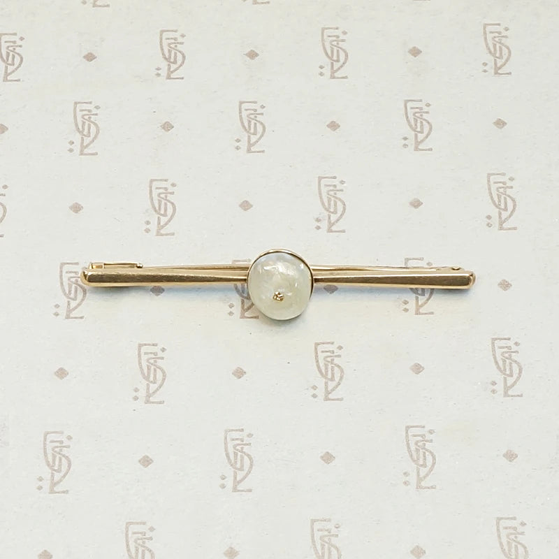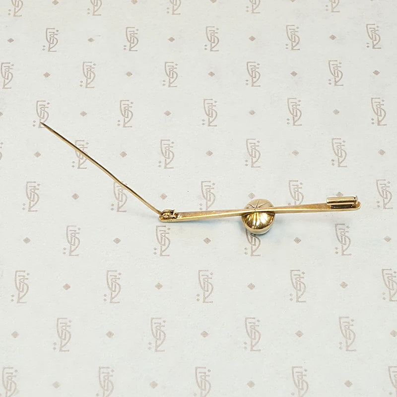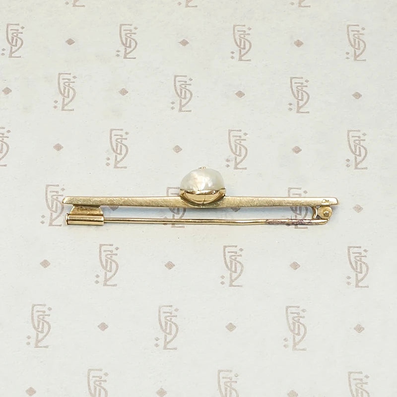 This pin may date to the Victorian era, but it is absolutely timeless in its elegant beauty. A lustrous natural baroque pearl is set in a 15k rosy gold basket, secured by a flower-headed pin to a rose gold bar. The pin closes with a trombone style clasp, the cutting edge in the technology of the era. Just exquisite, this is an exceptional example of Late Victorian design.