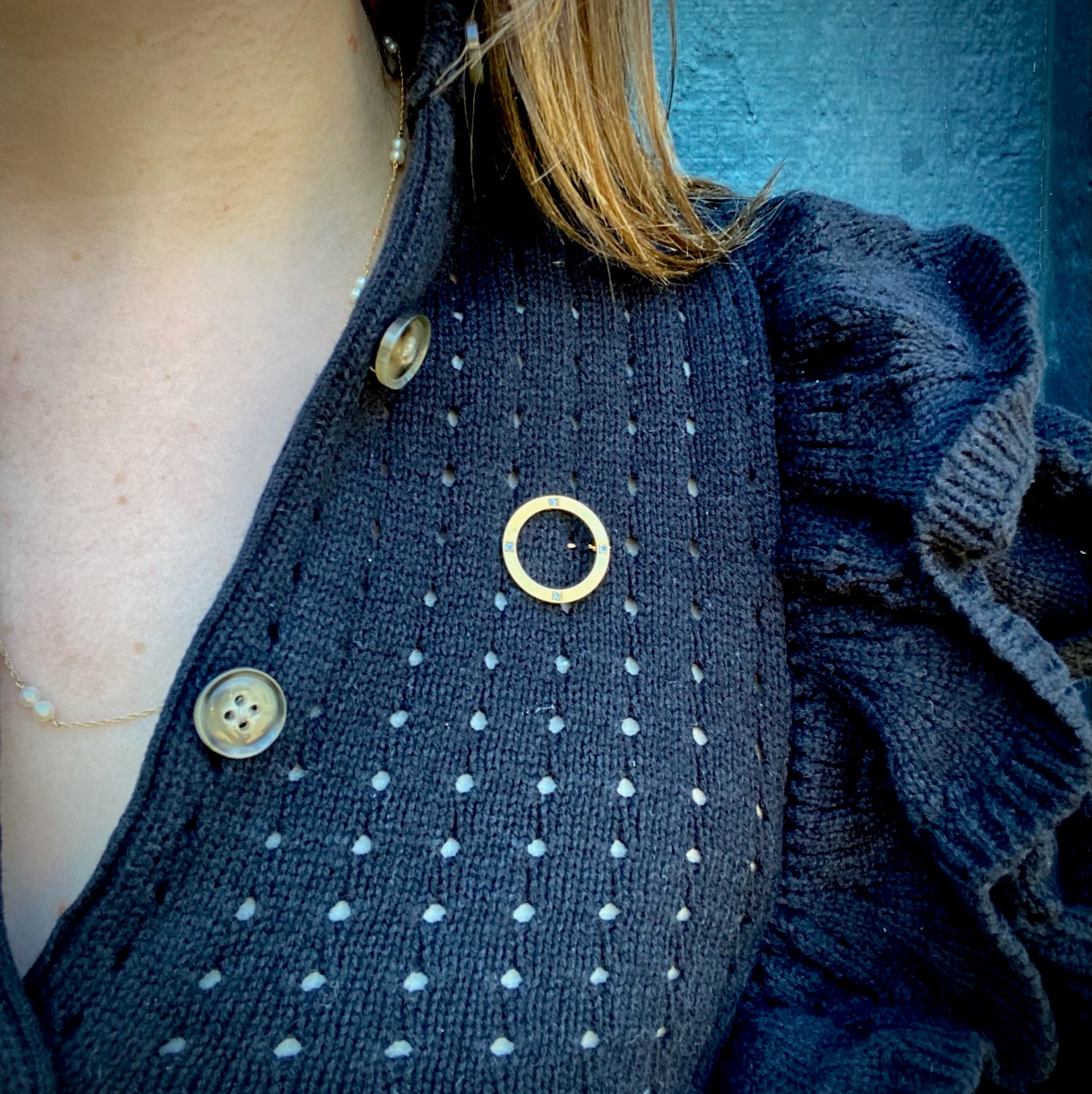 The sweetest little Edwardian pin. It is shaped as an open circle of 14k yellow gold, with four Montana sapphires set in tiny squares at its cardinal points. The ring of gold is beautifully engraved with concentric grooved circles and sawtooth edges. The engraving is delightfully refined. The little bright sapphires are a fresh cornflower blue color. This brooch is delicate and lightweight, perfect for wear on a scarf or collar. Circa 1910.