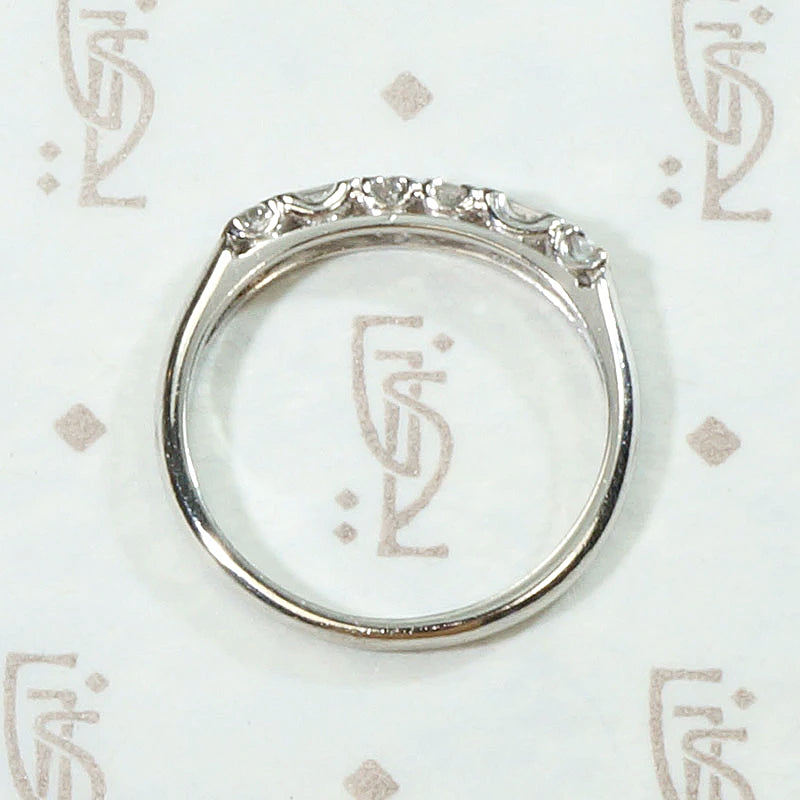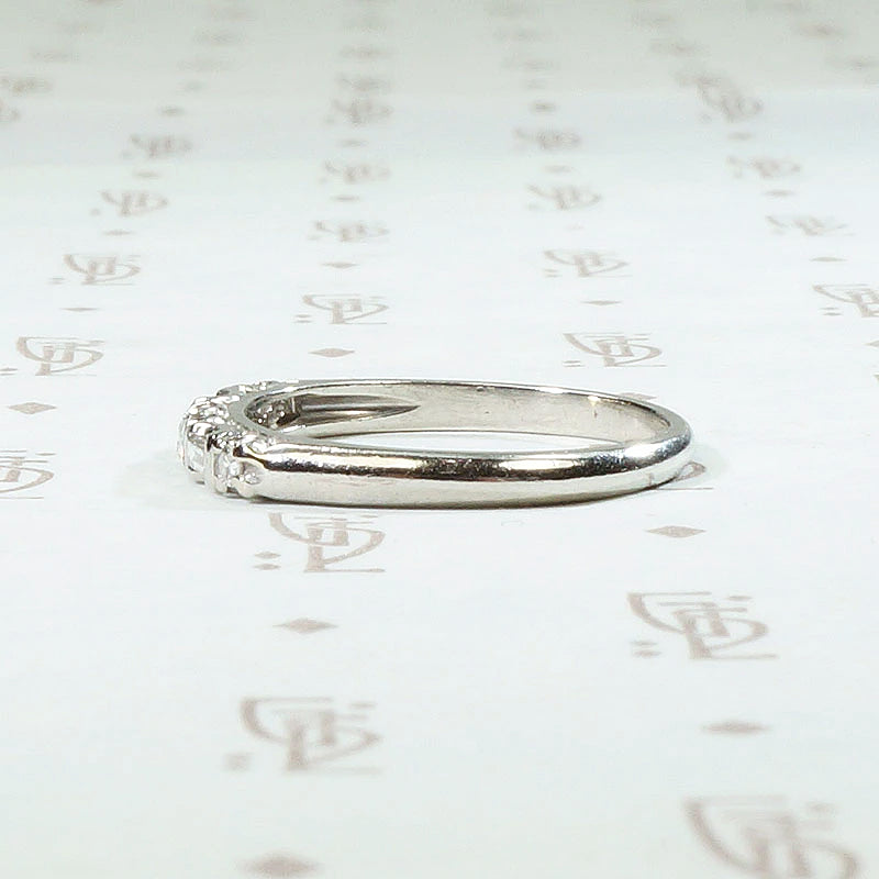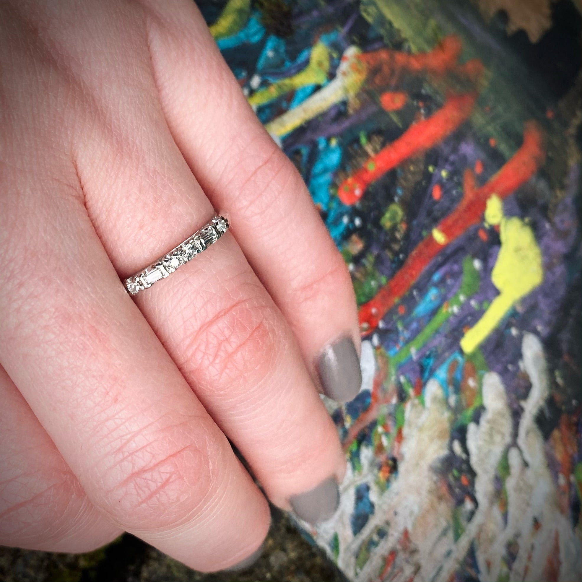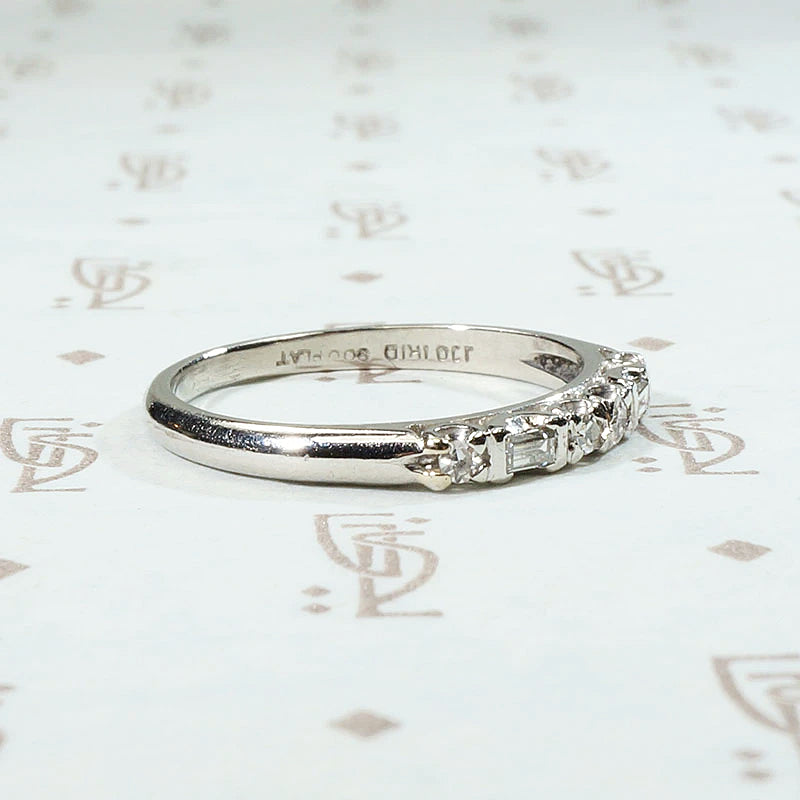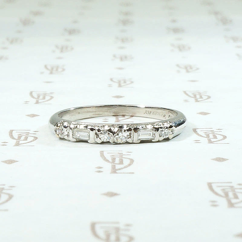 This beautiful diamond and platinum band will look fantastic with everything. Four round diamonds alternate with two baguettes, two of those rounds are set at the center of the band, with a 0.15 tcw. This refined ring is both elegant and versatile, it is always exciting to find a vintage wedding band that pairs baguettes and rounds. Circa 1930.