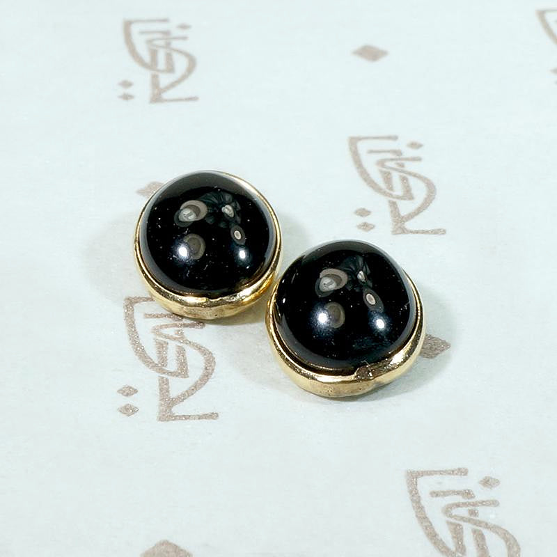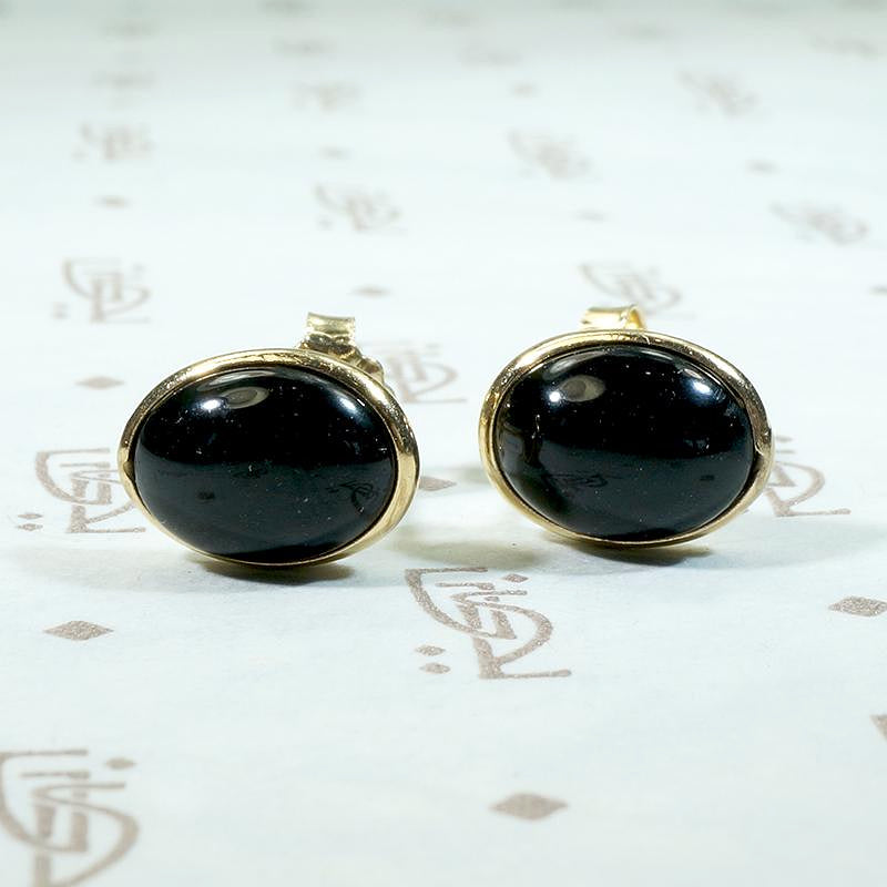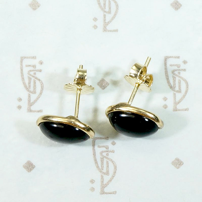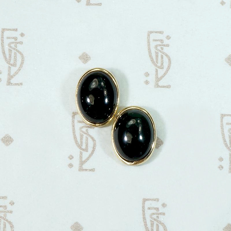 Knock them cold in black and gold. These vintage stud earrings are so sophisticated. Oval cabochon black onyx stones are set in 14k yellow gold bezels. The sleek, rounded stones and bezels make these stud earrings perfect for every day wear, they are comfortable and won't snag your hair or clothing.