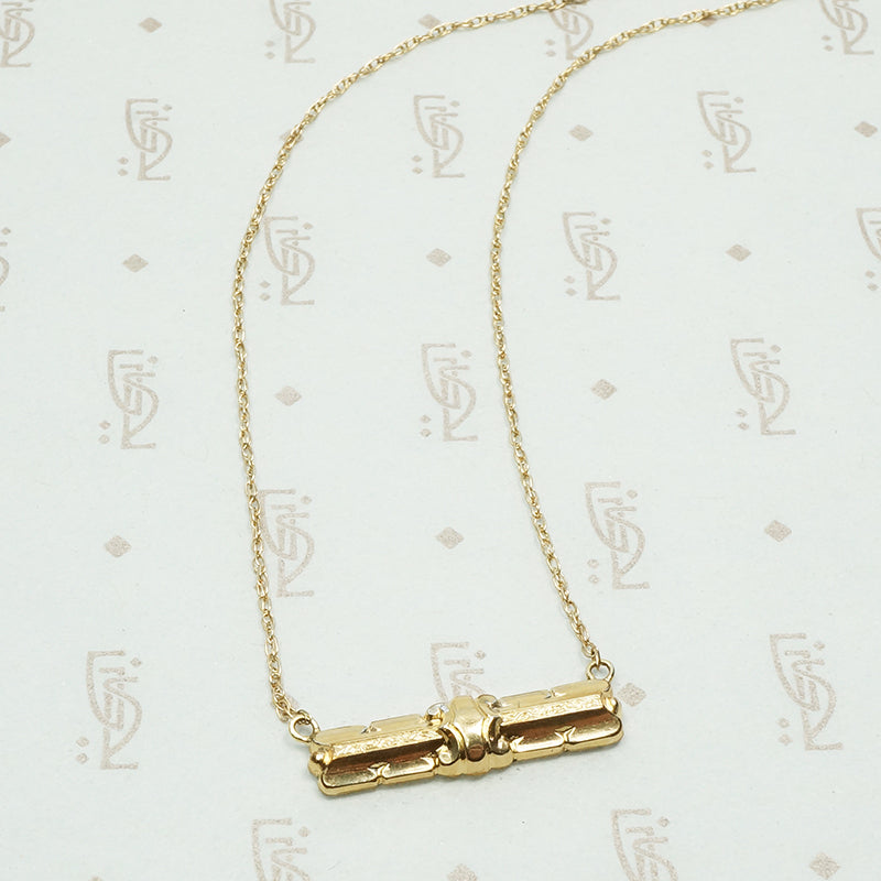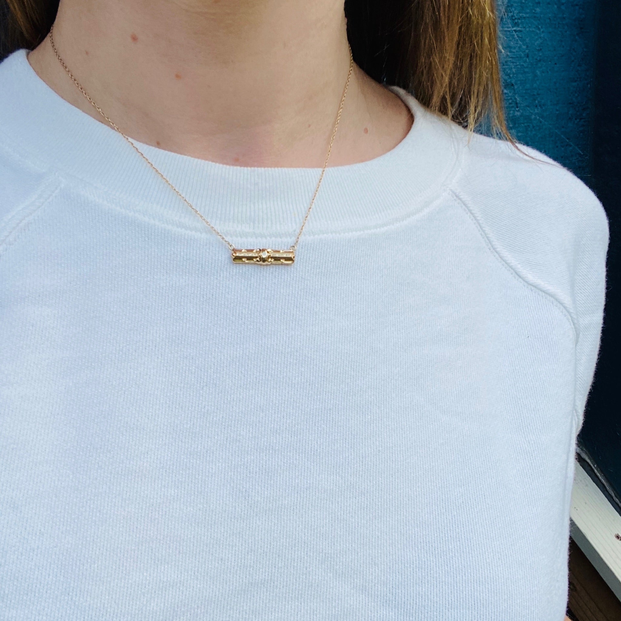 Details.....The bar pendant measures .91" x .24" The chain is new 14k recycled gold, 17" long. In Very good vintage condition.