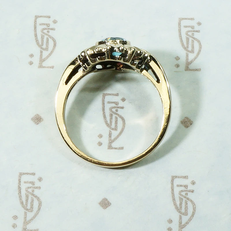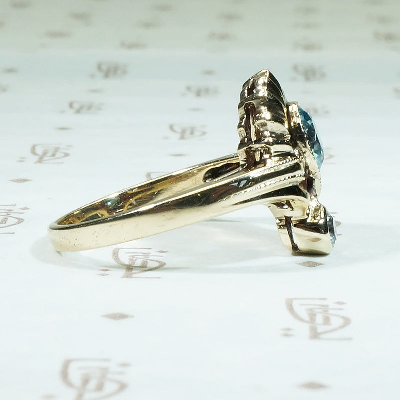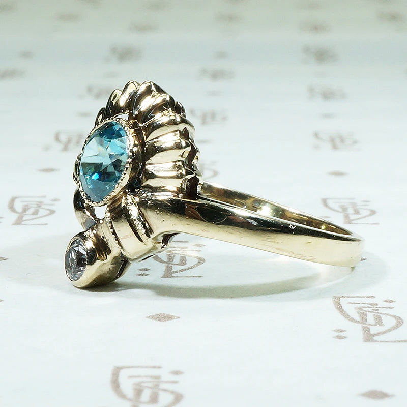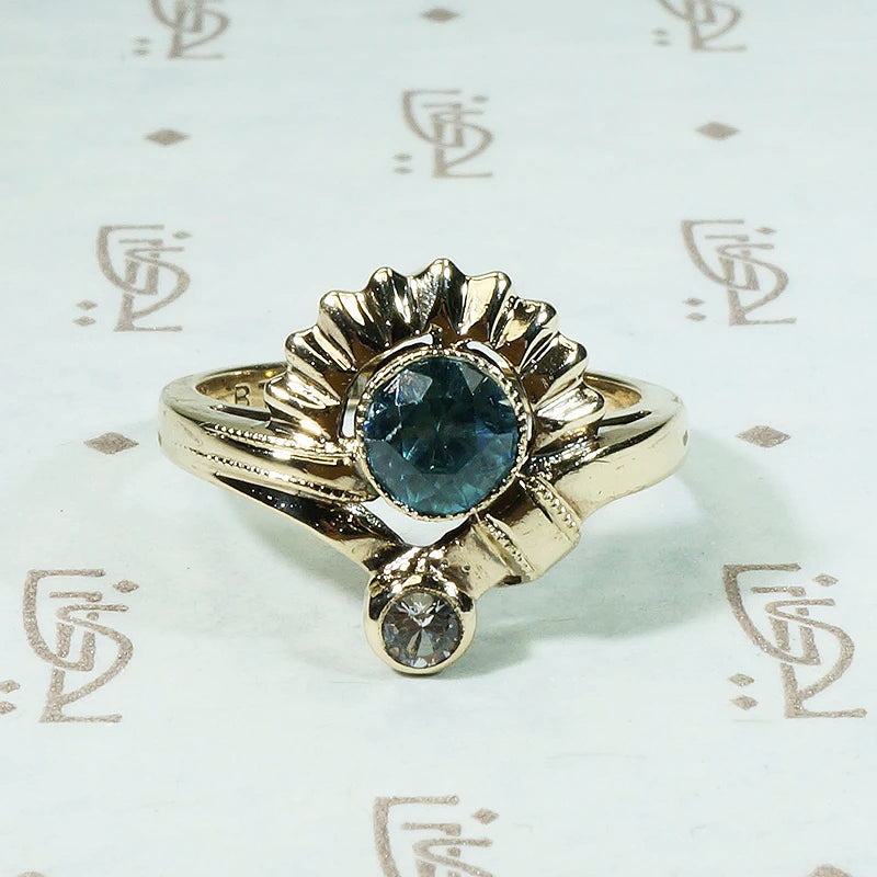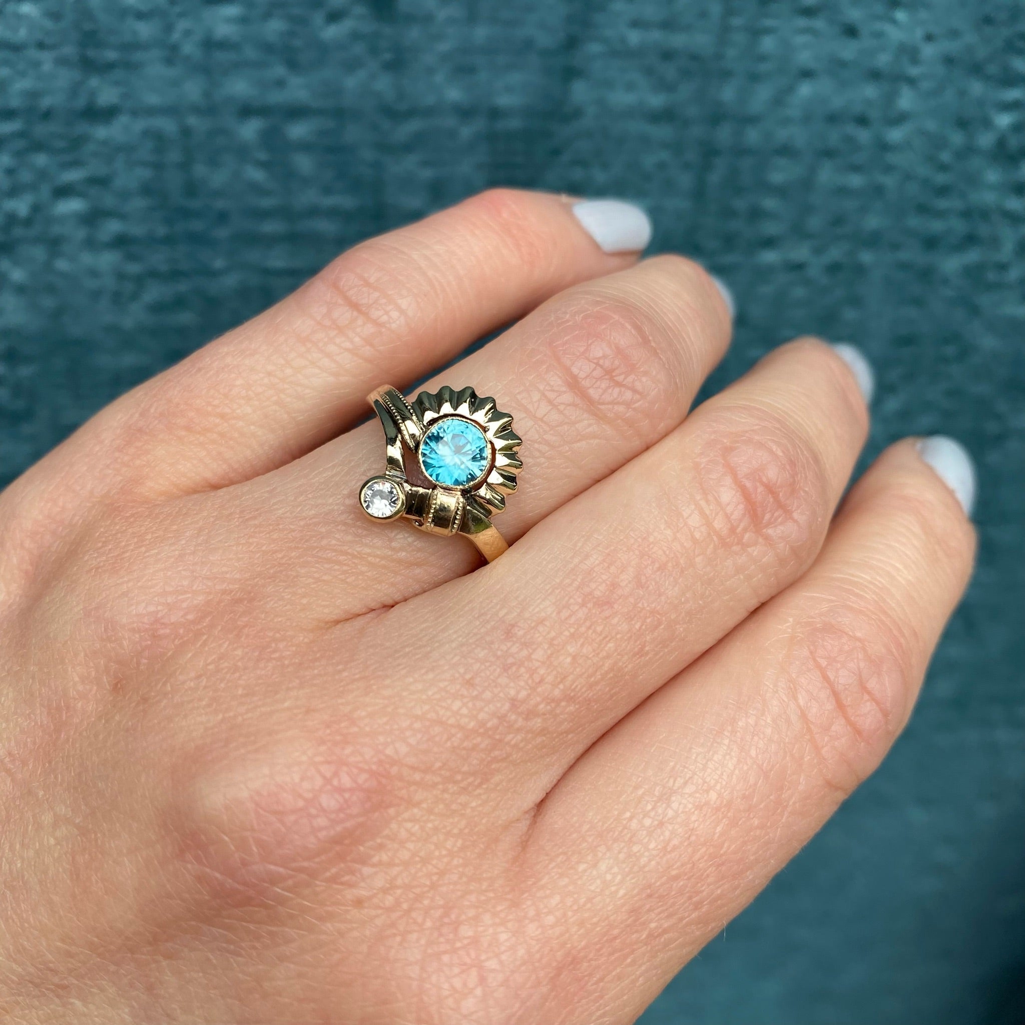 A fun example of whimsical Retro design sensibility. A fan of gold rays out from the top of a bezel set natural blue zircon. A band of 10k gold resembling a stylized belt girds the finger and terminates in a white sapphire. Engraved detail brings the piece to life. Cheerful and sparkling. Circa 1940.