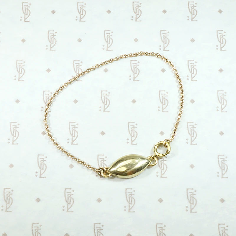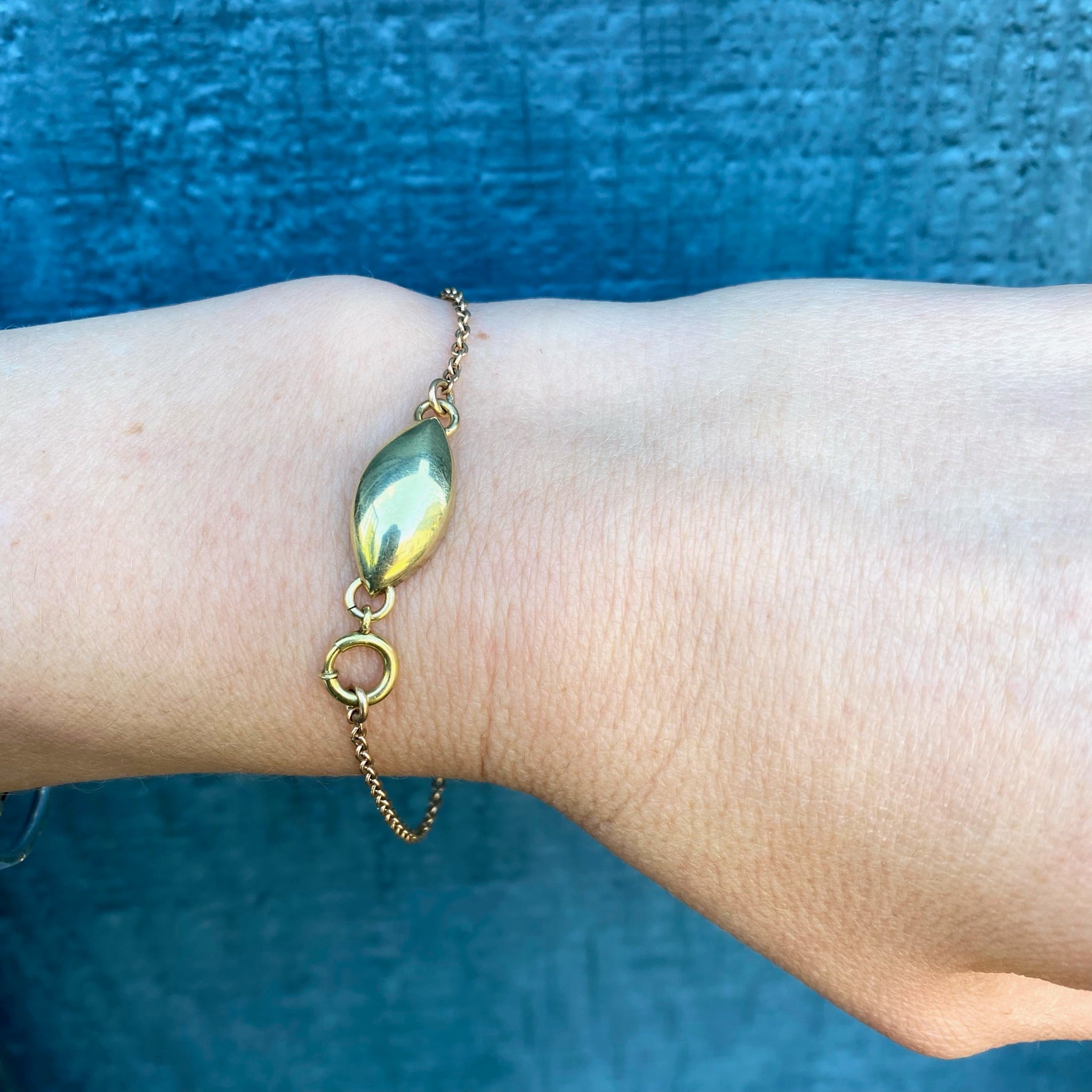 A cool Retro 14k gold cable chain bracelet accented with a shiny, three-dimensional gold navette element. The hollow navette is attached to the chain by swiveling rings, making the bracelet lightweight and giving it supple movement. The bracelet secures on one side of the navetter with a spring ring. The back of the navette is marked "14k" and signed by prominent artist M.C. Mossalone. So pretty, with the Machine Age flair that makes Retro jewels so fascinating. Circa 1940.