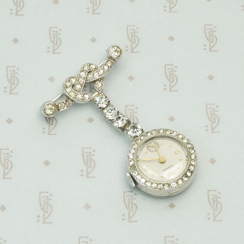 This elegant vintage watch brooch sparkles and shines. The pin is shaped like a knot and studded with rhinestones. The watch hangs from the brooch by a strand of rhinestones. Its pretty face is marked Sussex, and its Swiss movement is in good running condition. A lovely piece that reflects the romance of the era. Circa 1940.