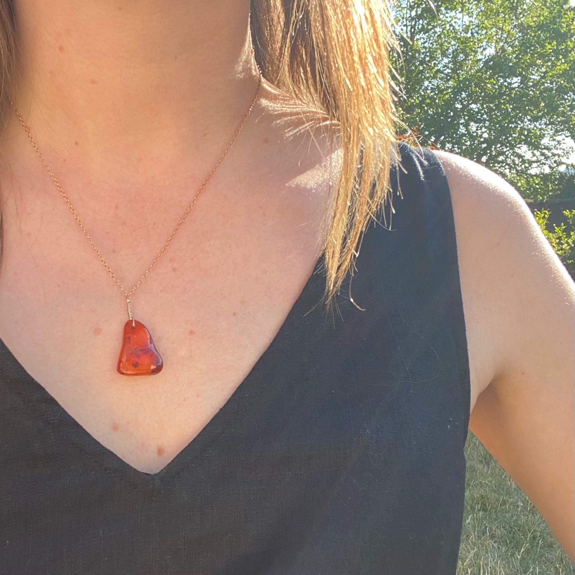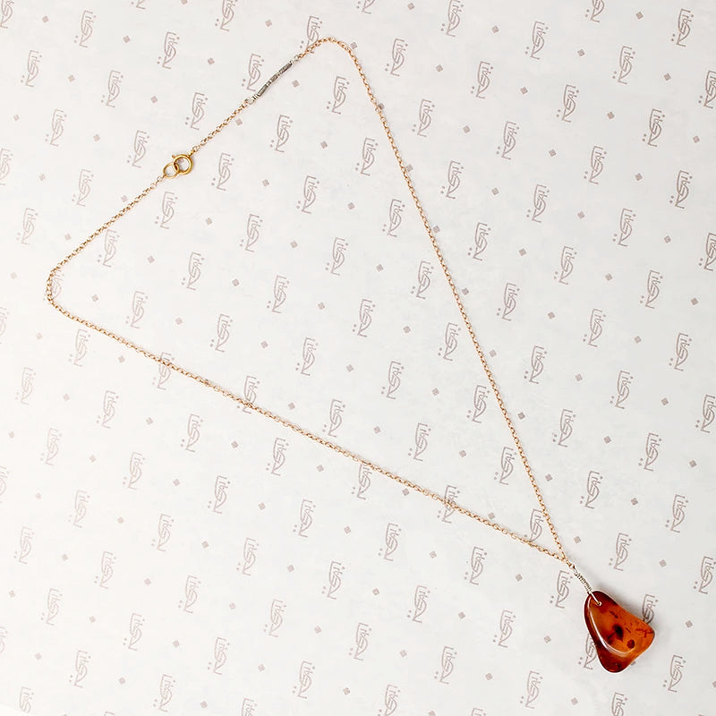 In the depth of winter I long for the bright sun. This inspired me to make a small collection of jewelry featuring vintage amber that looks like frozen sunlight. This necklace features a pendant of vintage amber with the colors of bourbon and honey, filled with fascinating inclusions. The pendant has a bale of wrapped sterling silver wire, it hangs from a rose gold filled chain. A jaunty accent of vintage sterling silver beads completes the piece. The beads are all from my personal collection.