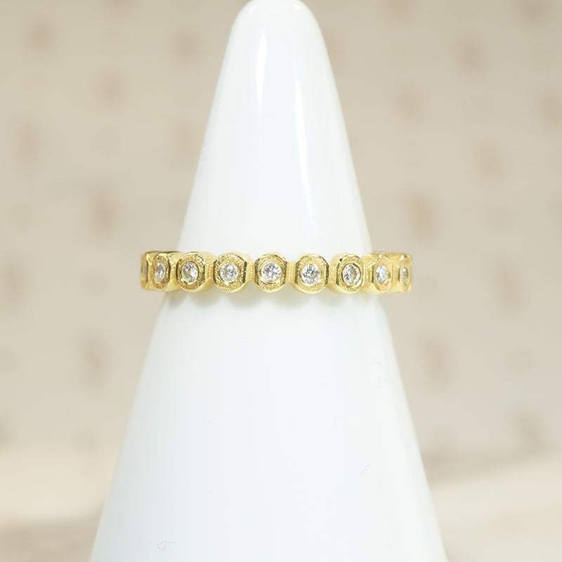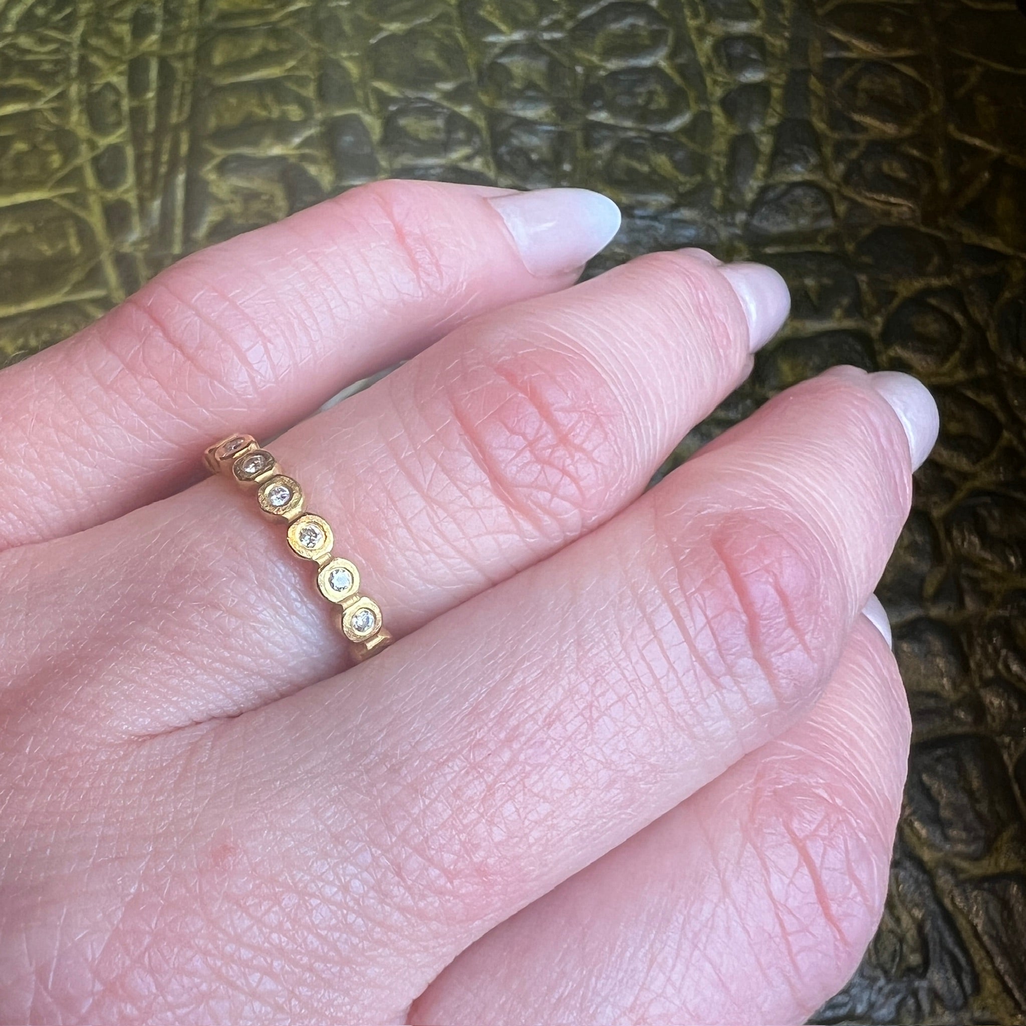 So many fabulous Estate pieces are coming to the shop! This beauty is a matte 18k yellow gold eternity band of tiny sparkling natural diamonds. This luxe band will look great in a stack, alone, or with your engagement ring. The fun of a modern jewel with the joy of knowing you're treading lightly on the planet.