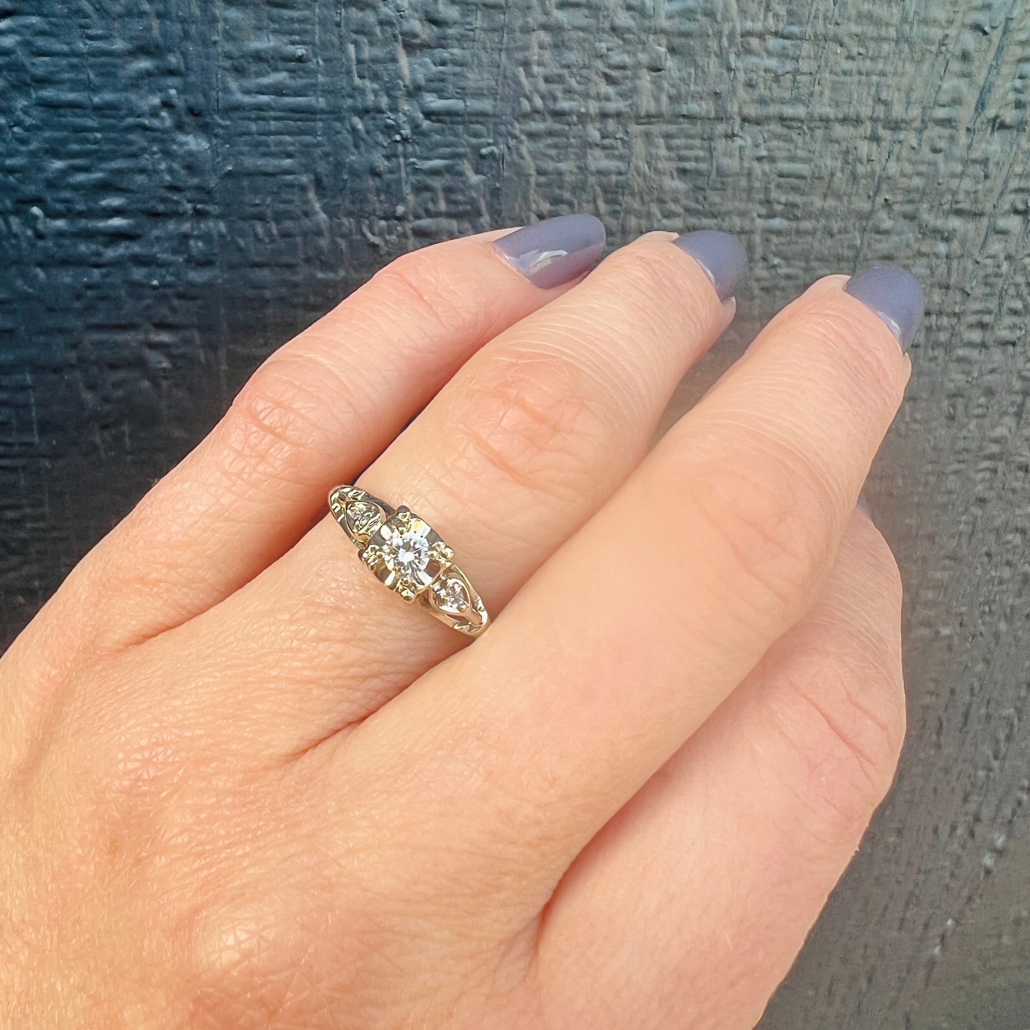 This romantic diamond engagement ring features a subtle heart motif. A pretty little 0.15ct diamond twinkles in a fancy fluted square head. The shoulders of the bright 14k white gold ring are softly sculpted into raised heart shapes, each set with a wee accent diamond. Cathedral shoulders taper gently into a slender band. Sweet hearts for your sweetheart, what could be better? Circa 1940.