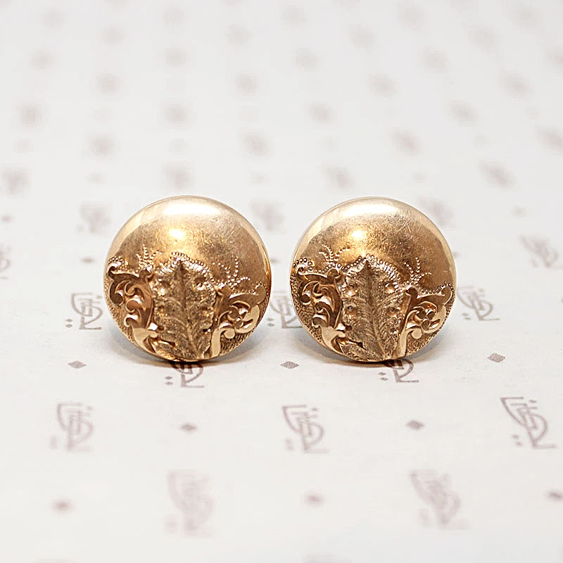 Very fancy antique cufflinks, these beauties make quite a statement. The button style links are rosy gold filled metal, shiny domes with an with applied and engraved foliate design. These cufflinks are just the thing when you feel like puttin' on The Ritz. Circa 1920.