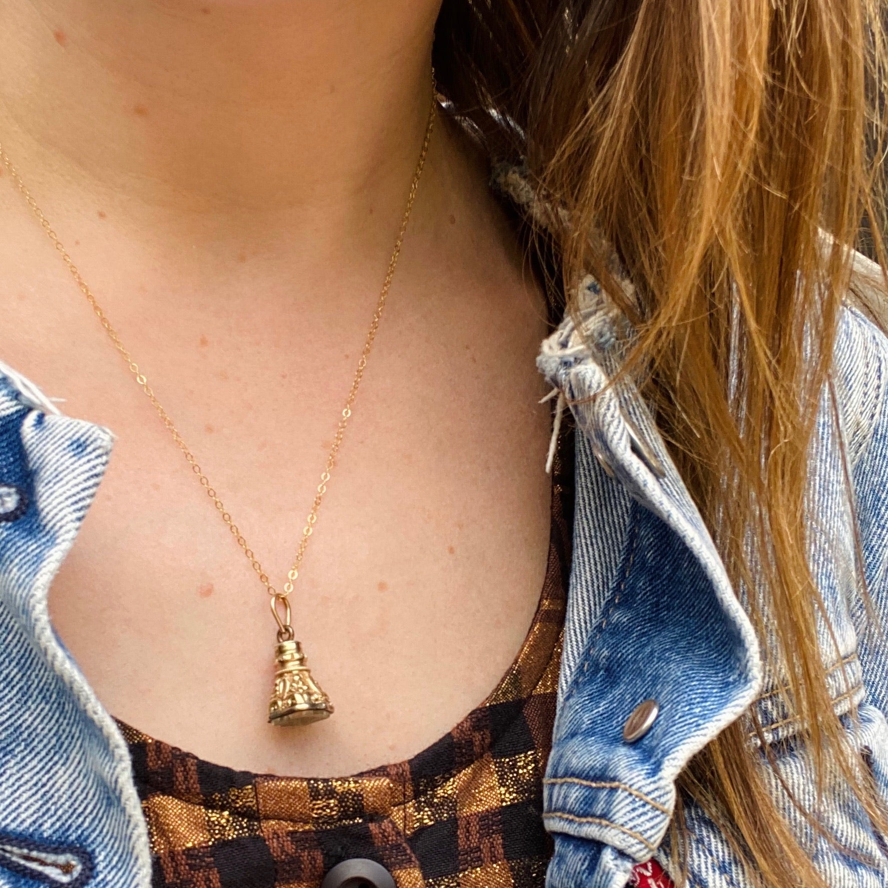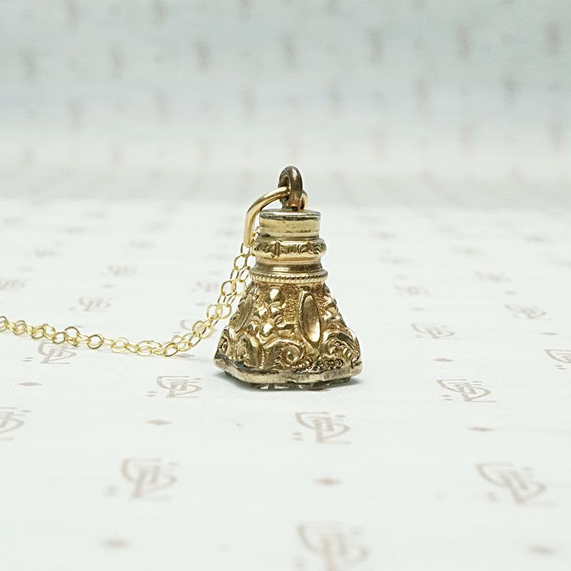 This ornate gold filled fob dates to the mid 19th century. It is set with a shield-shaped natural rock crystal. Pretty and petite, it is the perfect size for a pendant. The fob comes on a modern gold filled chain, many great chains will pair beautifully with it. Circa 1850.