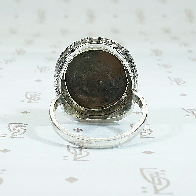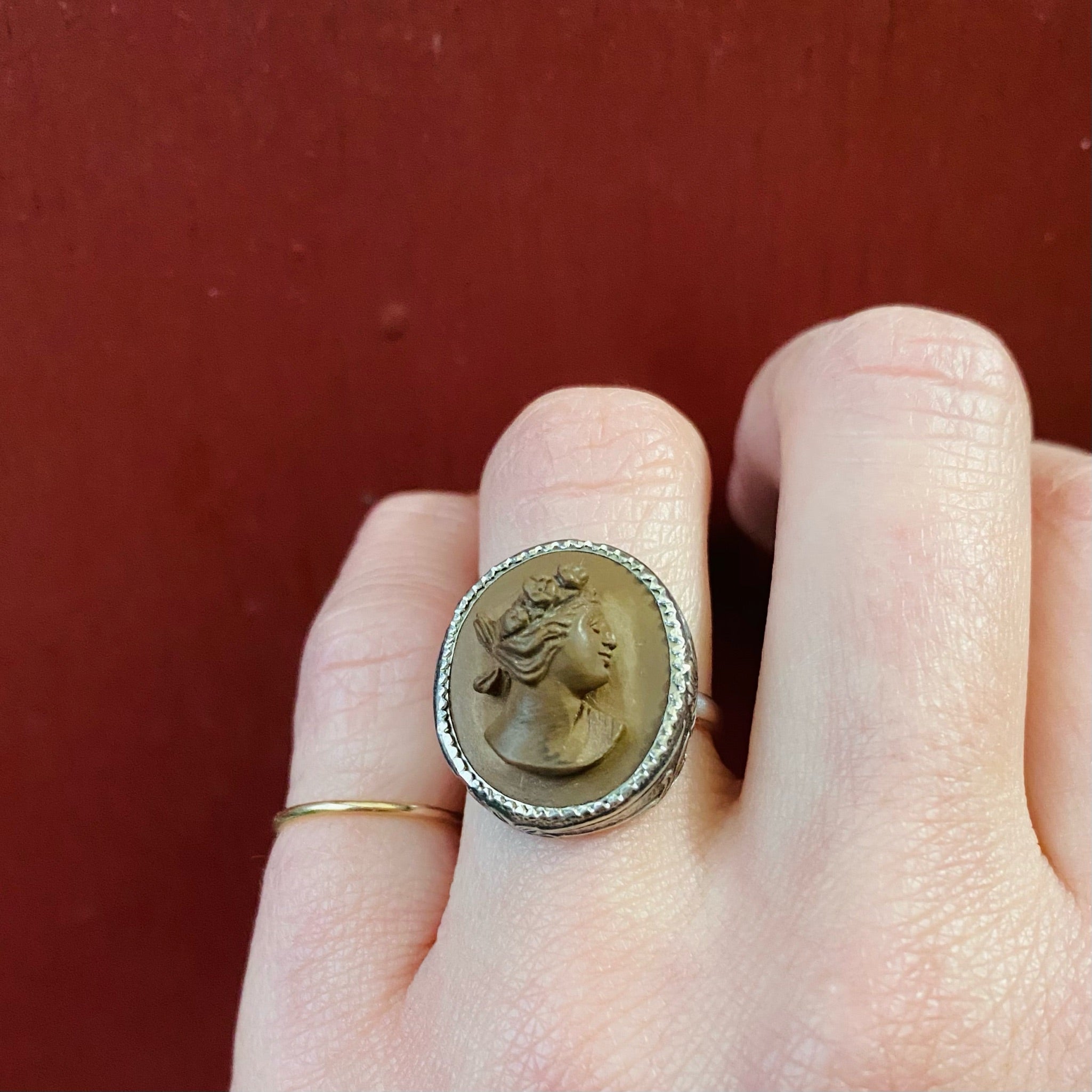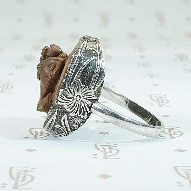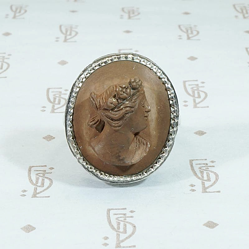 This ring is wonderful, with poetic elements that spark the imagination. A Victorian era cameo depicting a Roman woman wearing a crown of flowers in her beautifully coiffed hair is set in a sterling silver ring, framed in a sawtooth bezel. An engraving of chrysanthemums in the Art Nouveau style encircles the top of the ring. This piece has a certain mystique about it, a Pre Raphaelite flavor that marries Classical motifs with late 19th Century romance. The cameo dates from circa 1880.