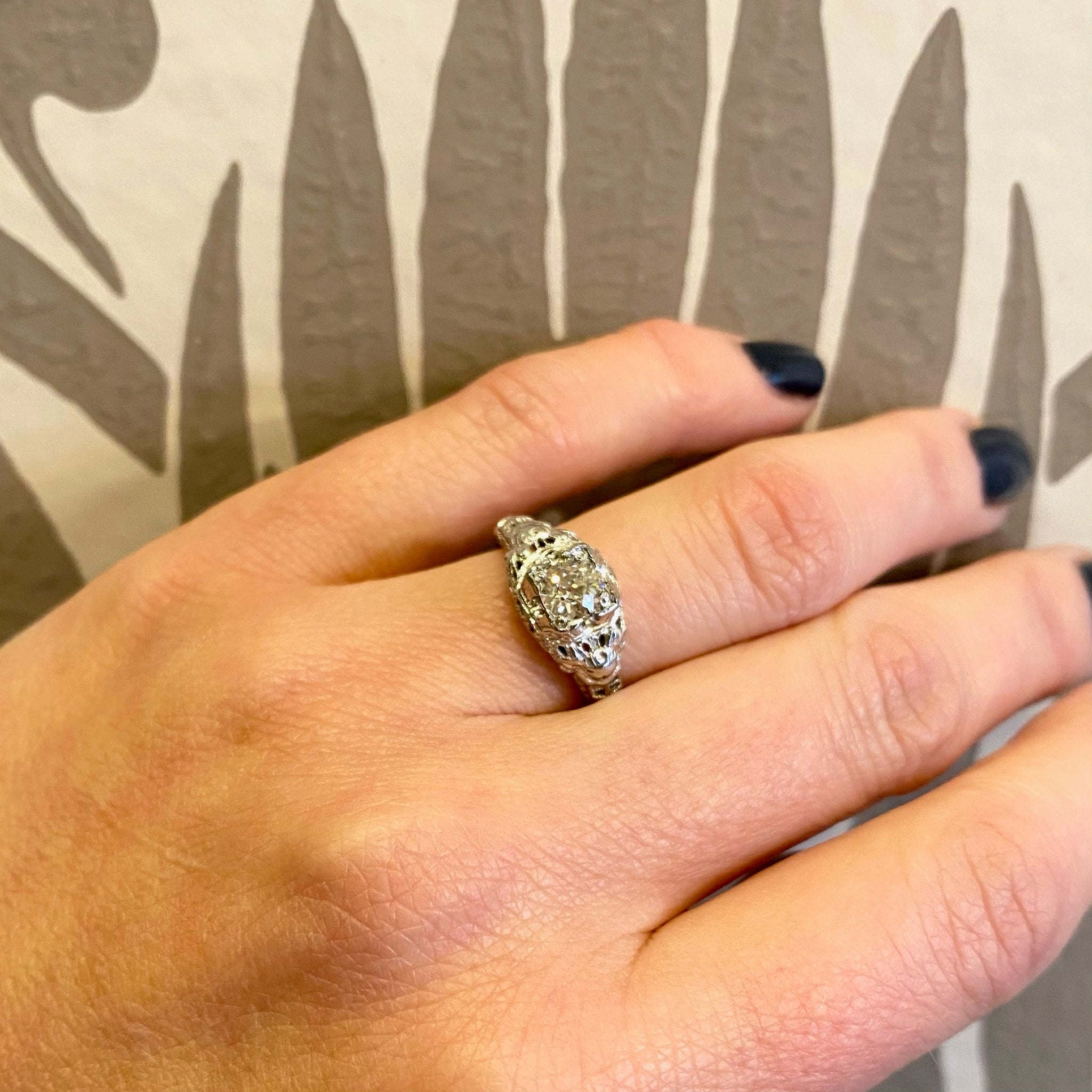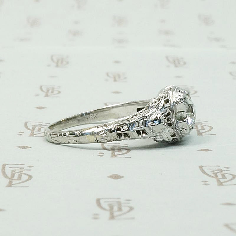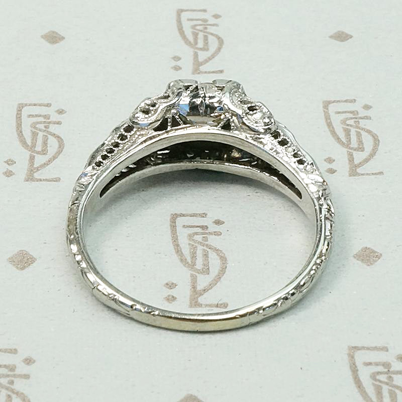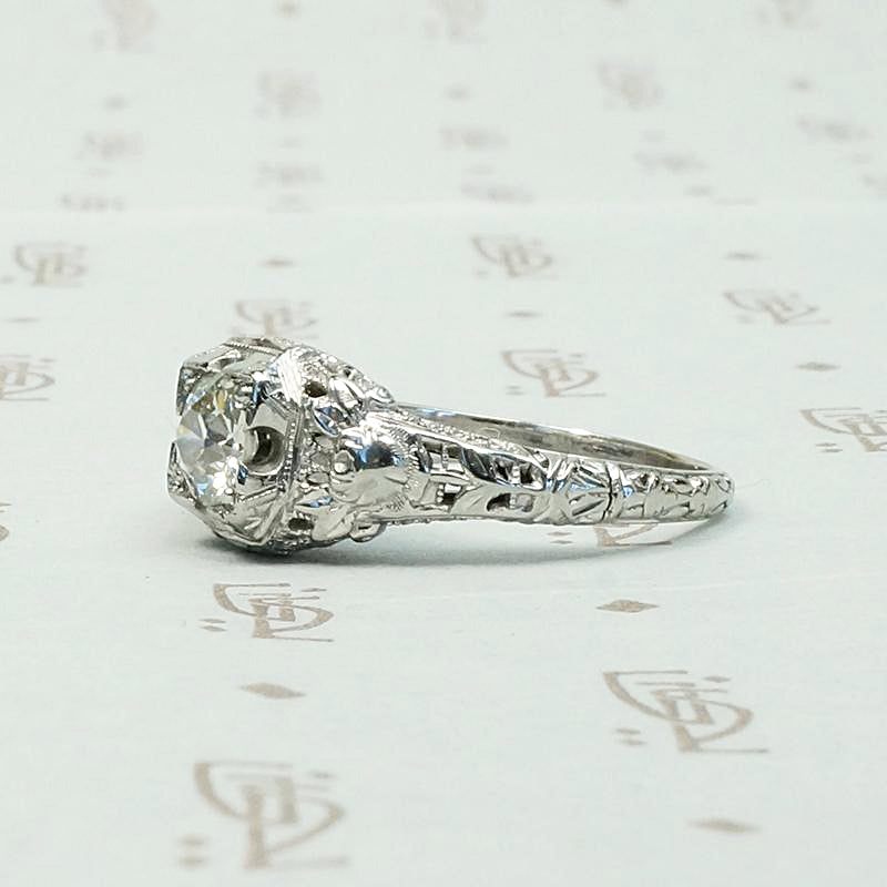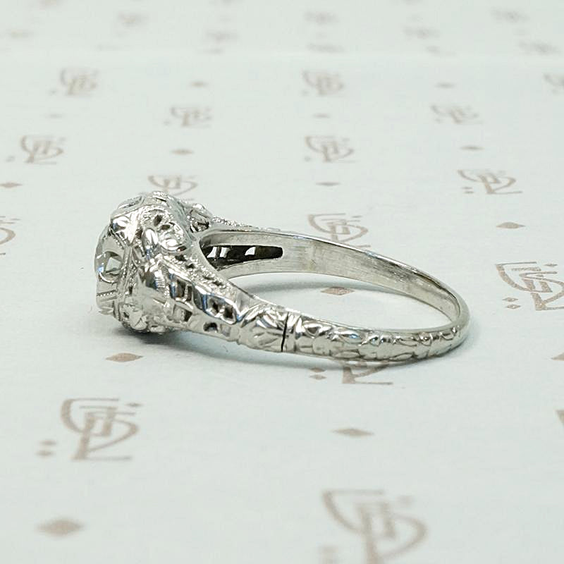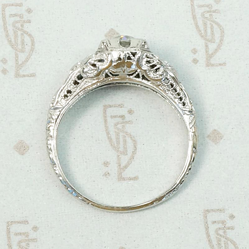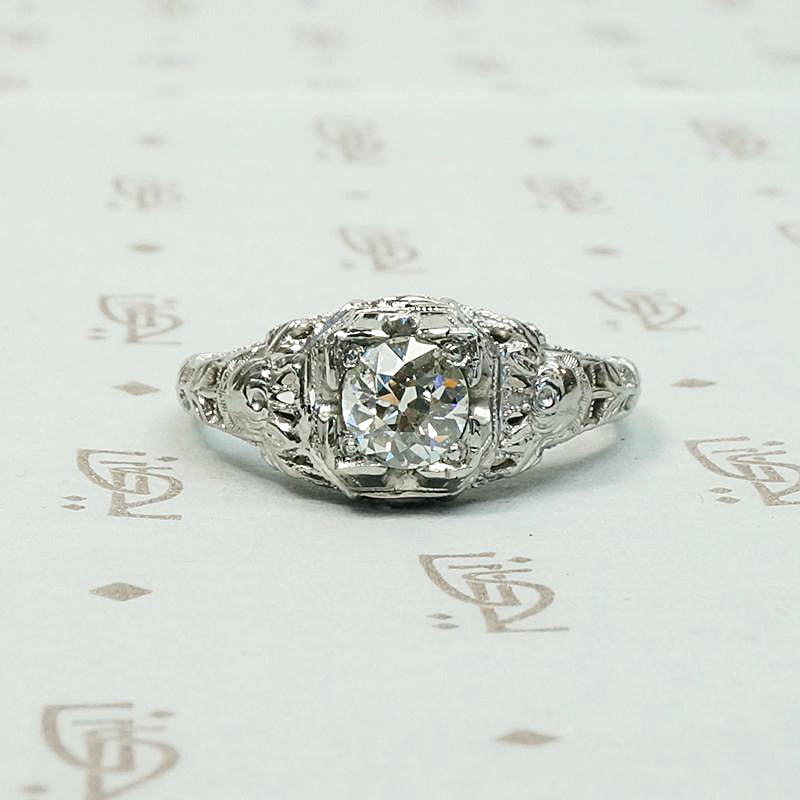 Wonderful vintage details make this Art Deco engagement ring special. A sparkling 0.45ct old European cut diamond sits at the top of the ring, flanked by exquisite roses modeled on each shoulders. Lacy 18k white gold filigree forms the sides and the band is elaborately engraved. This unusual and romantic engagement ring dates from the 1920s.