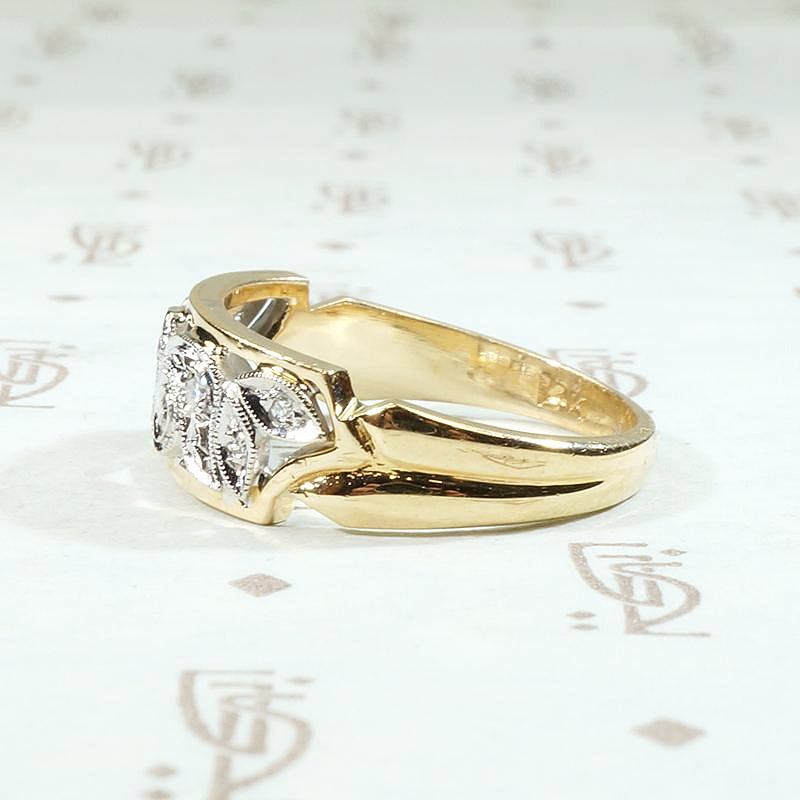 A gorgeous 14k two tone gold Retro wedding band depicting roses in lovely, crisp detail. A pierced panel of white gold displays two diamond set rose buds, surrounded with swirling leaves set with four more tiny diamonds and embellished with plenty of crisp milgrain. The white gold panel curves over the yellow gold body of the ring. Pinched, grooved shoulders taper back to a narrow band. Two roses representing two true hearts, this exquisite wedding band makes a bold romantic statement. The ring is New Old Stock, true vintage that has never before been sold to the public. You can be the first person to enjoy this wonderful vintage band. Circa 1940.