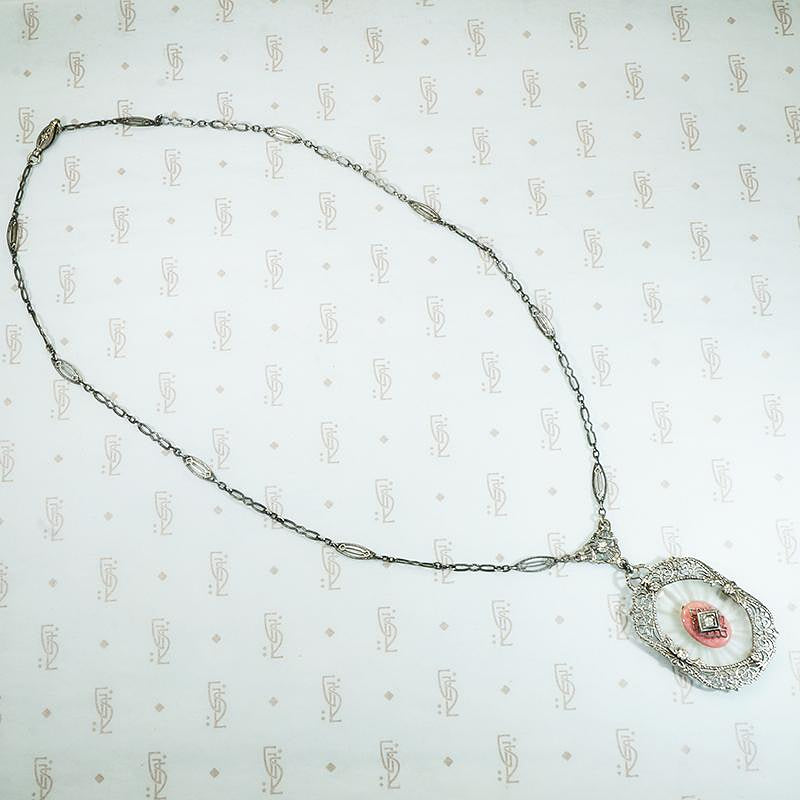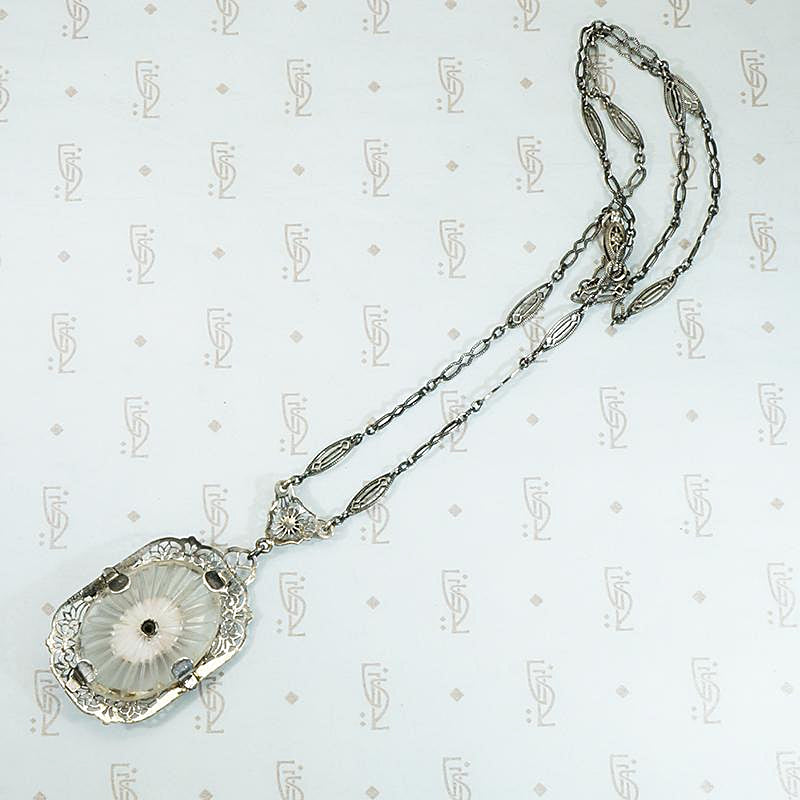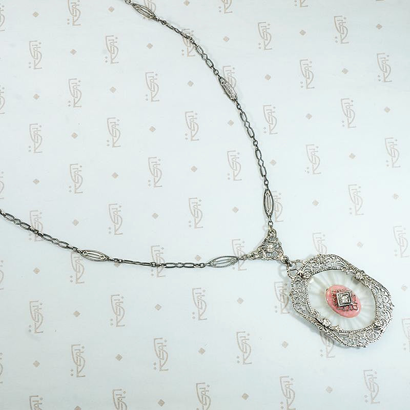 The romantic side of Art Deco. A delicate necklace of camphor glass in lacy sterling silver filigree.The panel of ribbed and frosted camphor glass sits in an exquisite frame of silver flowers. An oval of pink glass ornaments the center of the camphor glass, and the pendant is studded with glittering rhinestones. The pendant hangs from a fancy sterling filigreed chain. Circa 1920.
