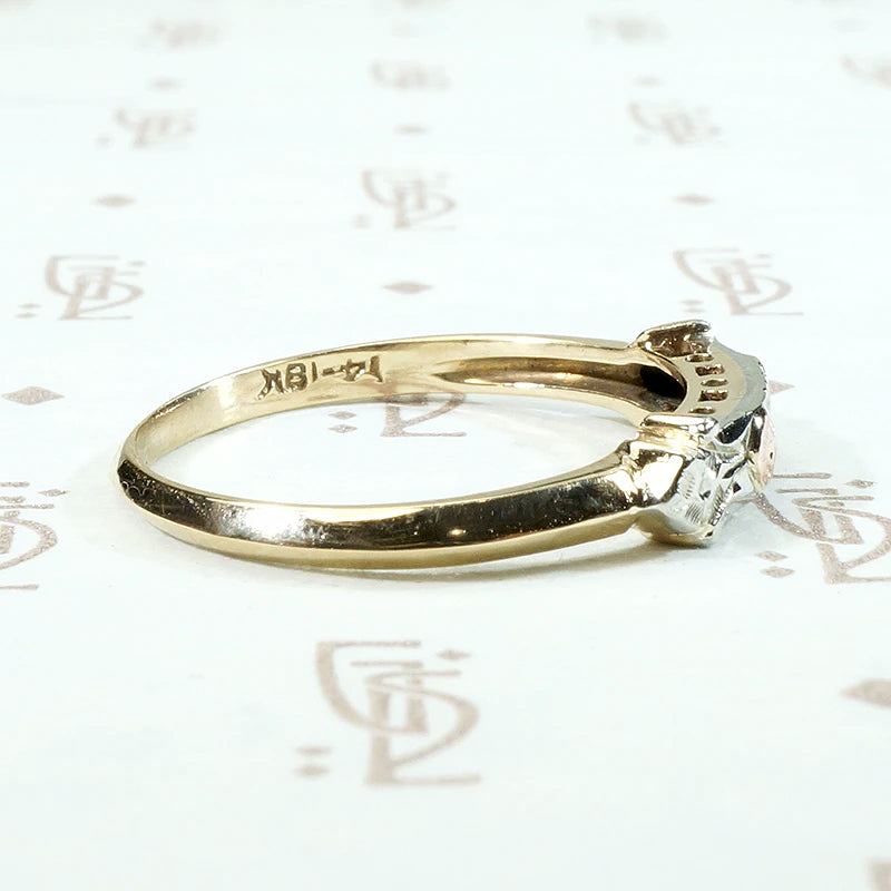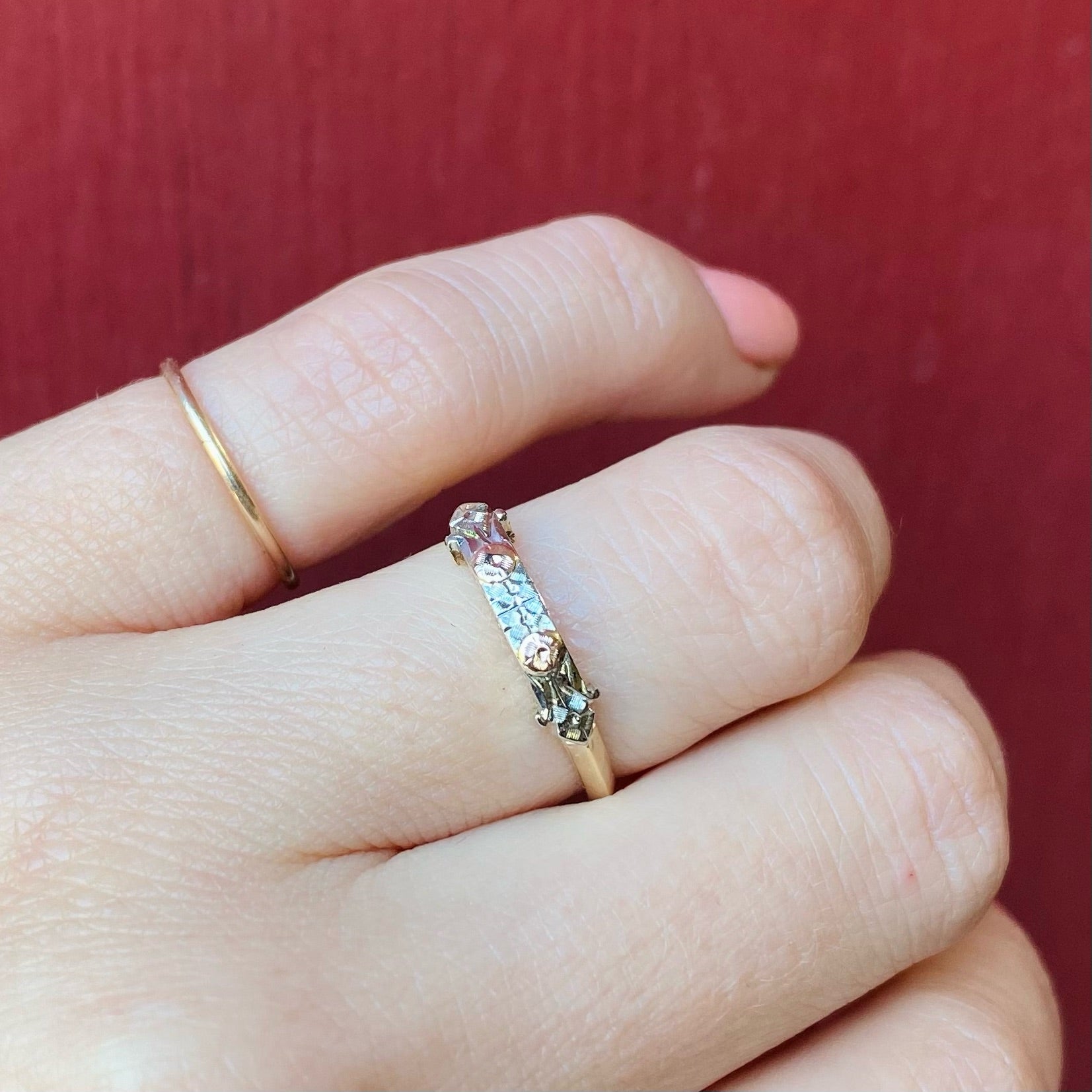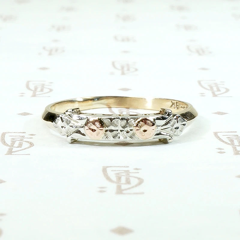 Absolutely charming tri-tone gold wedding band with the sweetest details in lovely condition. The decorative 14k white gold top of the ring features tiny engraved flowers; white gold forget me nots alternate with rose gold roses. This white gold panel sits between elegantly scrolled shoulders sculpted in 18k yellow gold. A narrow band with a very pronounced knife edge completes the piece. Delightful on its own or paired with a vintage engagement ring. Circa 1940.