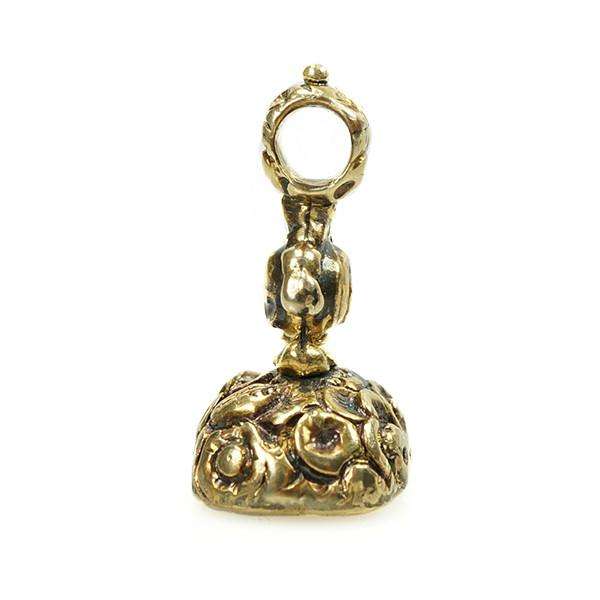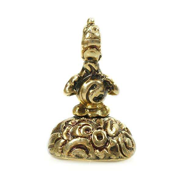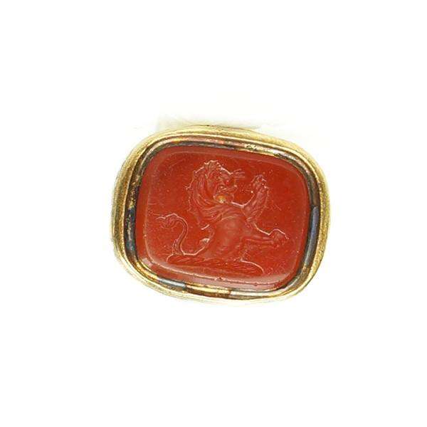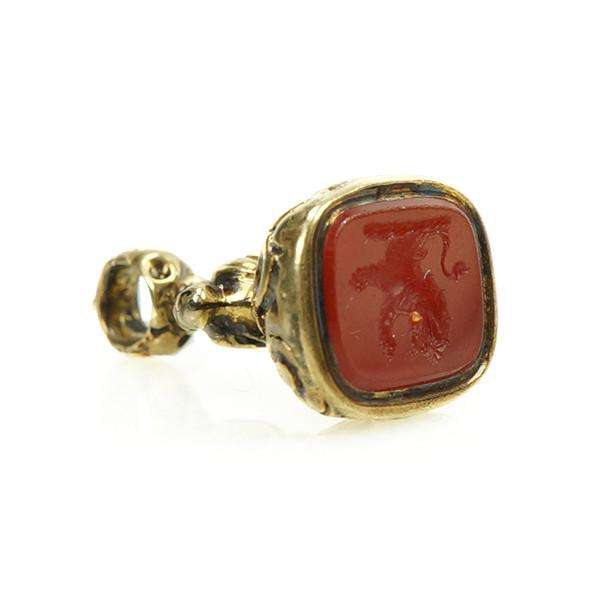 A tangle of Roses adorns the metalwork of this fob seal. The carnelian seal is carved with a Lion Rampant, as a crest. The Lion was a popular image in Heraldry, used as a symbol for many things, including Bravery, Royalty, and Strength.