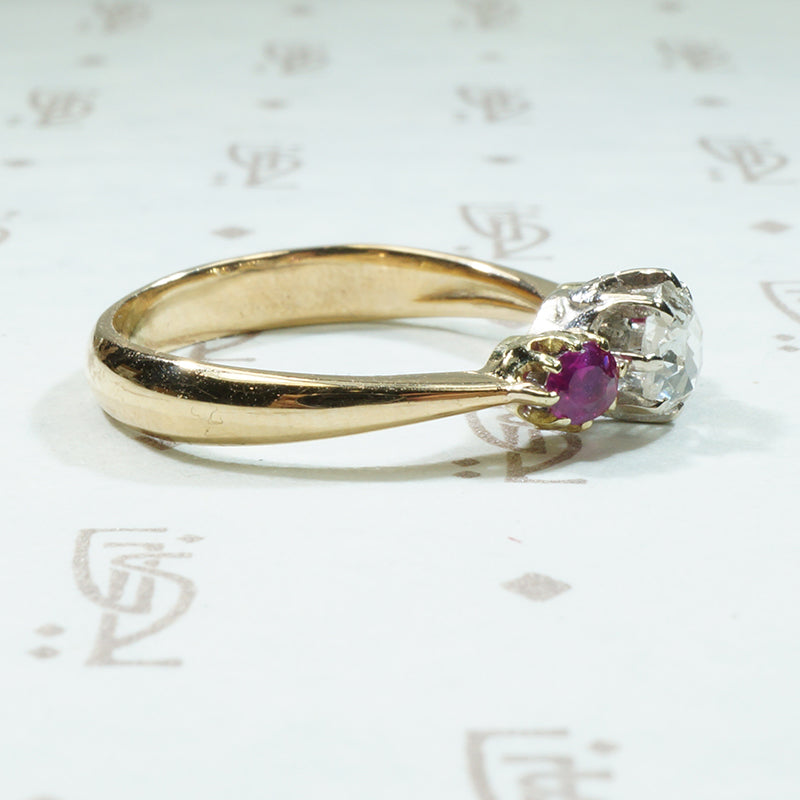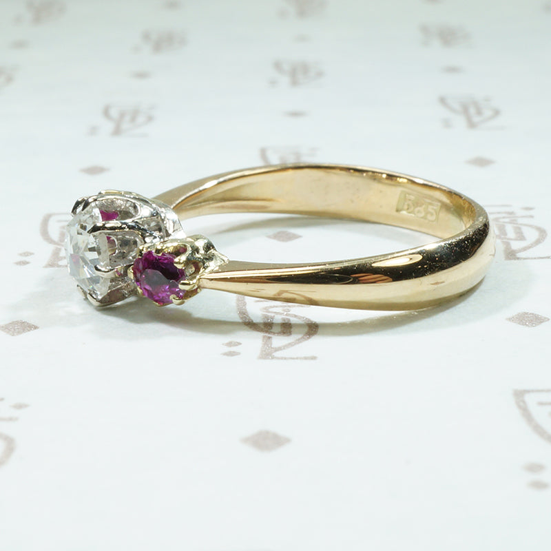 Set in the center with a rose cut diamond with lovely red rubies to the sides. The .40ct diamond is set in white gold with the .20tcw of oval rubies and the rest of the ring in yellow gold. This beauty would make a delightful and unique engagement ring. Marked 585, the European mark for 14k gold, circa 1930.