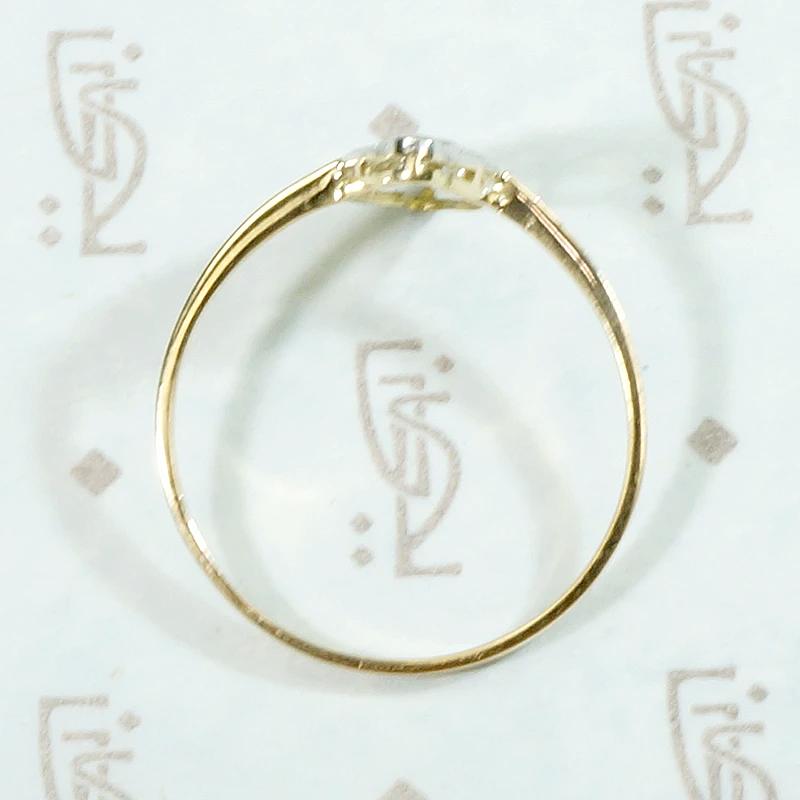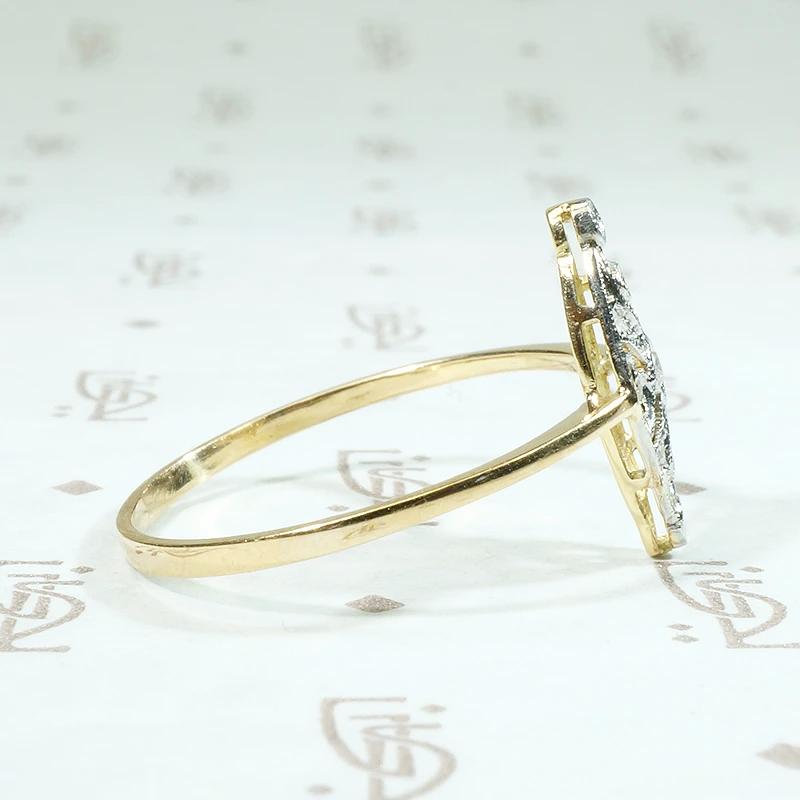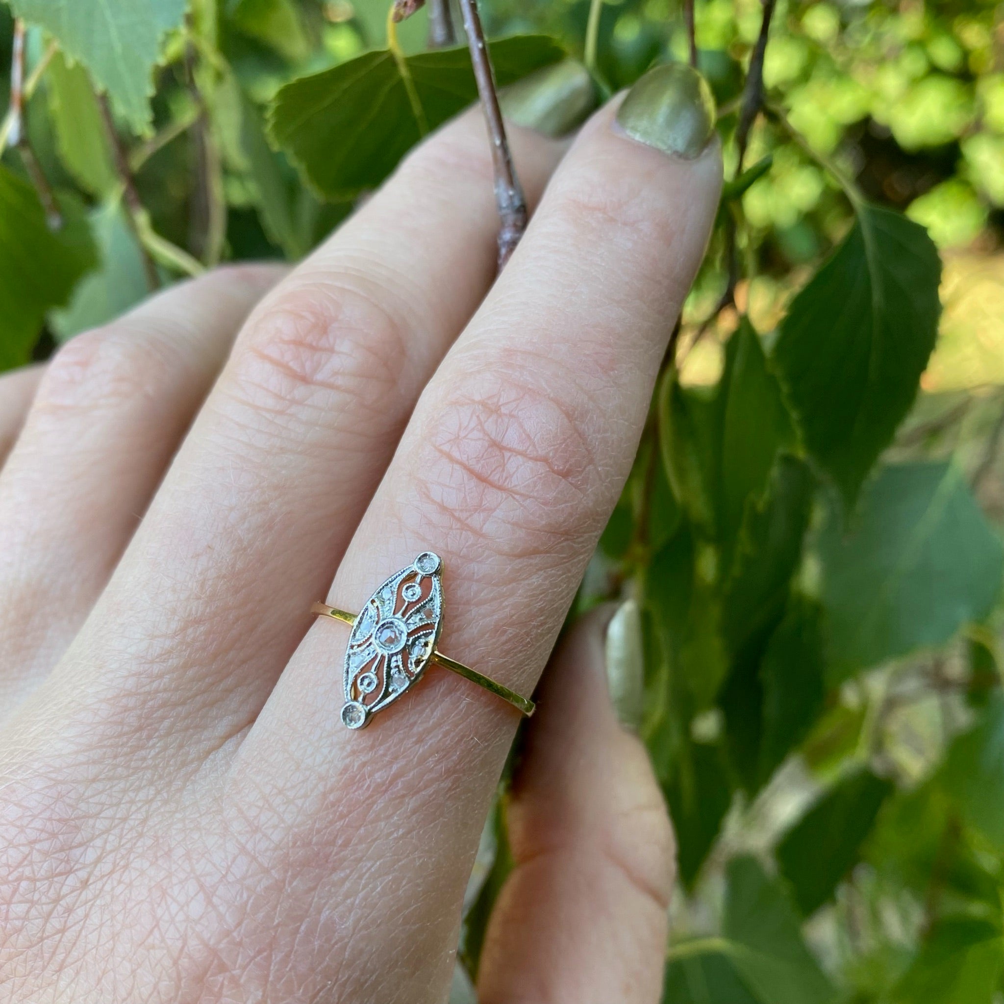 This delicate navette of lacy diamond-set platinum sparkles like a dewdrop spangled cobweb. Nine glittering rose cut diamonds are set in exquisitely engraved, open work platinum layered over an 18k yellow gold ring. The decorative diamond-shaped top of the ring sits between pinched shoulders that widen into a slim band. Utterly charming and so very feminine, this ring will make a most romantic love token. Circa 1920.