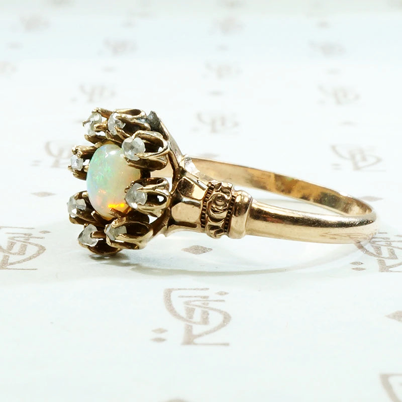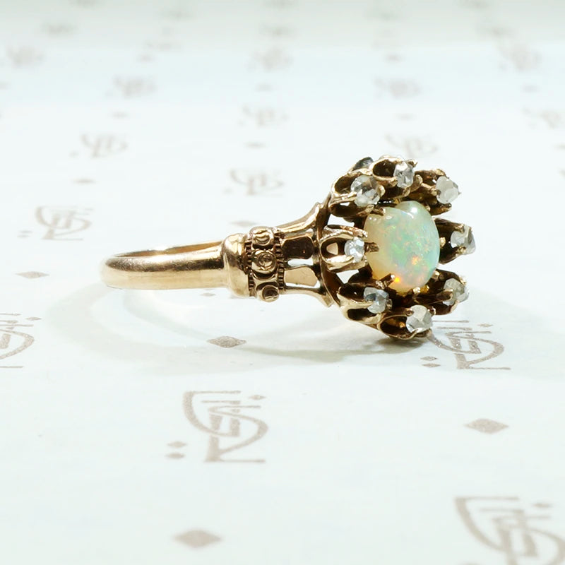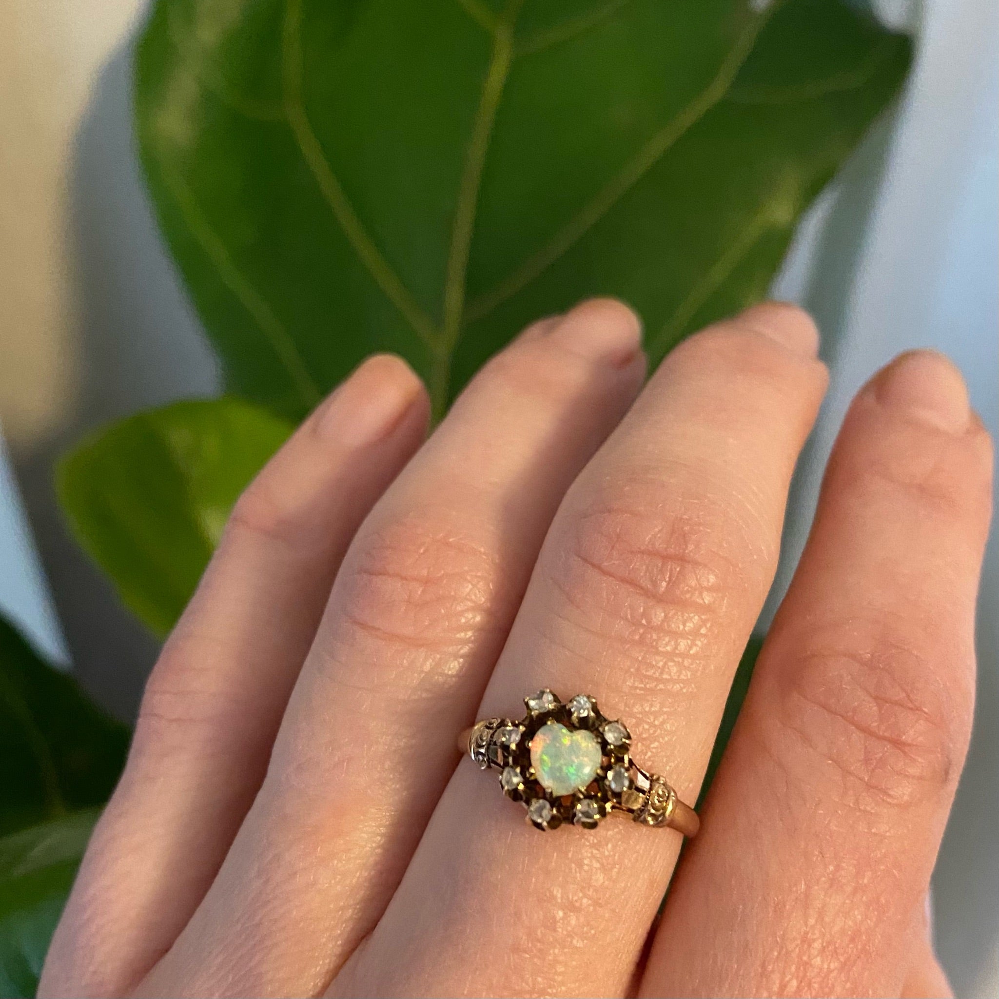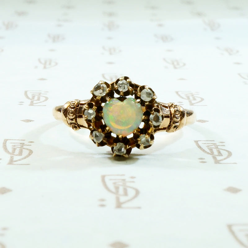 The sweetest delicate opal heart shaped gem is prong set in the center of a halo of chunky rose and mine cut diamonds. The band of this Victorian beauty has curved open shoulders and a band of chubby cabbage roses engraved deeply meeting with wrapped detail at the sides. This ring is lovely and delicate, not for everyday wear, if you choose to own this rare treasure you agree to treat it delicately. Circa 1880 10k gold.