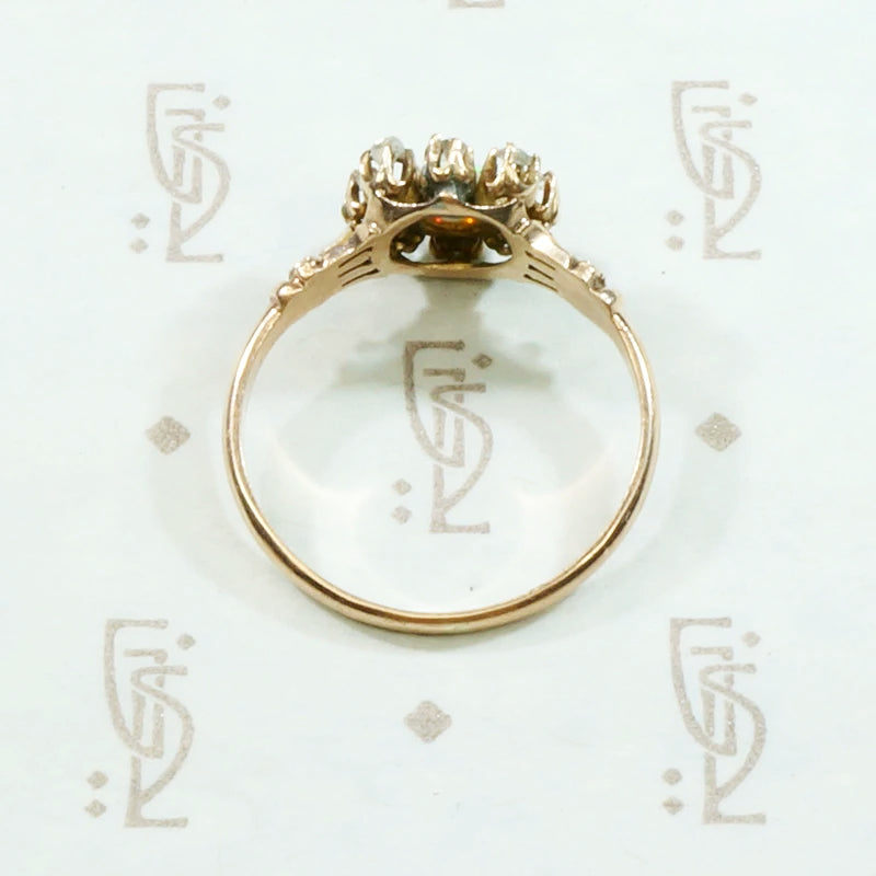 Details.....Currently a size 7.5 The ring may be sized up or down two sizes free of charge. Please contact us if you need this ring sized more than two sizes, it may be possible and will have a small fee. The ring measures 10.2mm x 9.5mm at the front and 2.2mm wide at the back of the band. In Good antique condition, there is evidence of an old repair underneath, it cannot be seen when worn. You should always expect some wear on vintage and antique jewels, we consider it part of the charm.