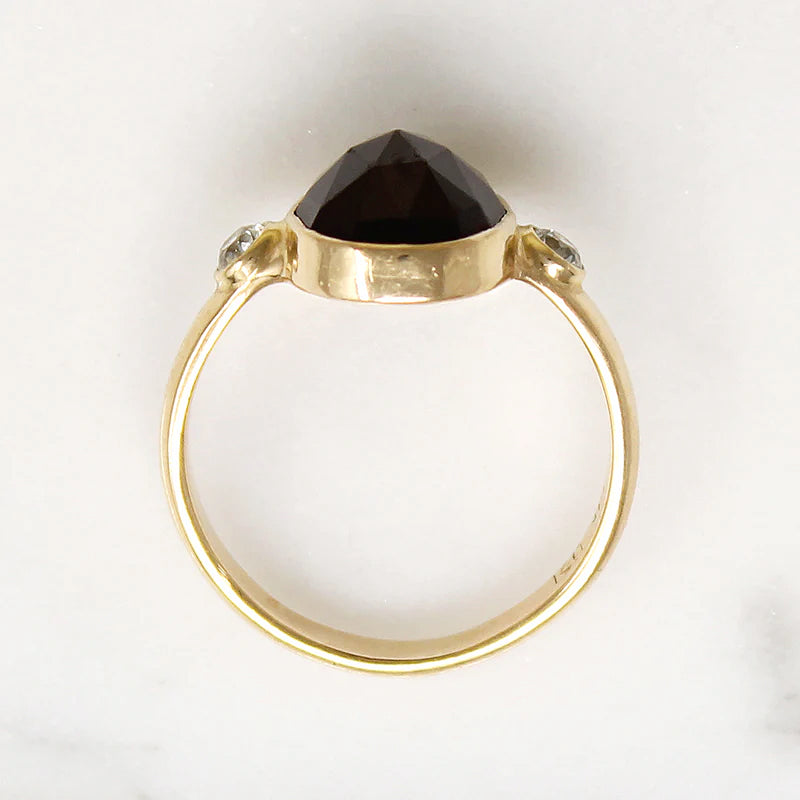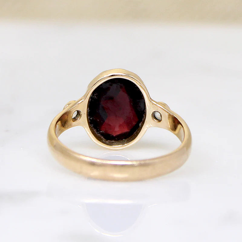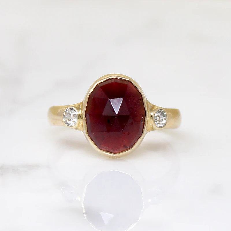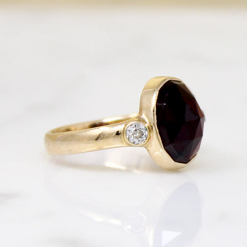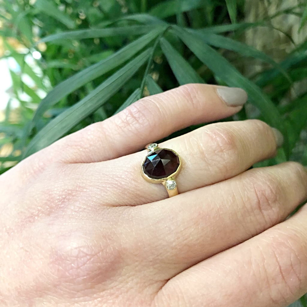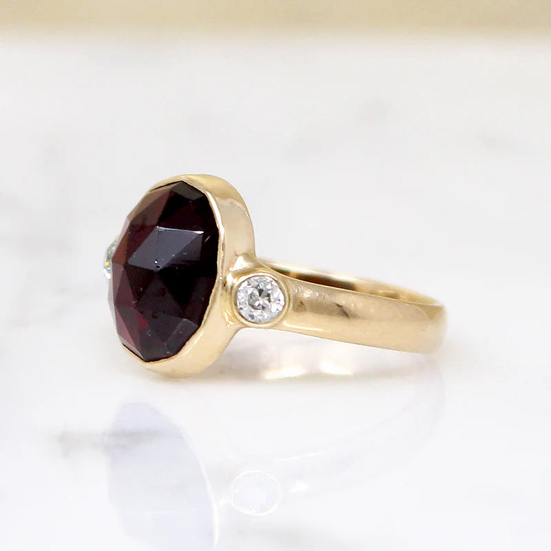 A 3.27ct rose cut garnet is bezel set at the center of this gorgeous artisan ring. Old European cut diamonds flank the garnet, inset in the shoulders of the ring's gently tapered 14k gold body. Garnets are the most romantic of stones, long having been associated with passionate love. This would make a wonderful engagement ring.