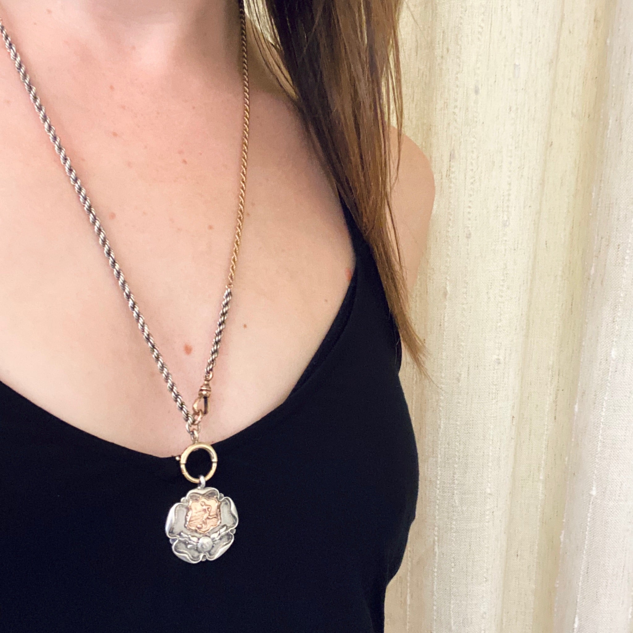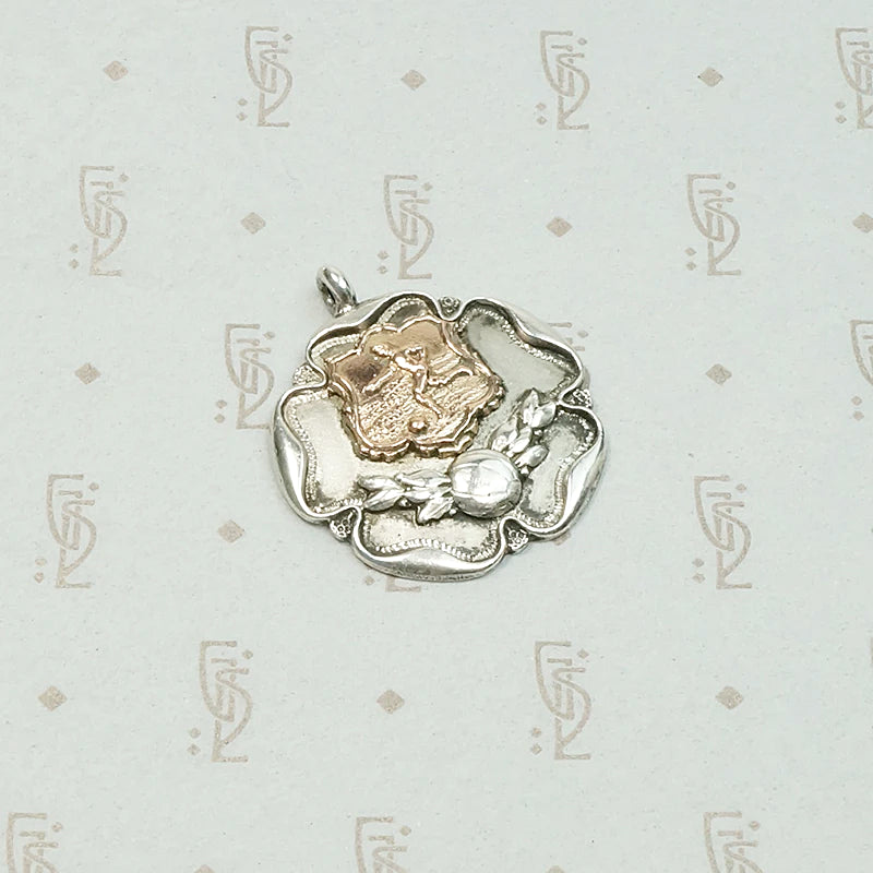 This English gold on sterling silver fob is an interesting football medal. A gold shield with a football (soccer) player sits above a football and laurel wreath. The  medal is shaped like a rose. This traditional rose shape could refer to the White Rose of Yorkshire, the Red Rose of Lancaster or the Tudor Rose. The back of the medal is engraved: S.S.P DEPT. K.O. 1931-2. The piece is hallmarked for Birmingham, sterling silver and the years 1931-32. It is also marked T.F and Thomas Fattorini Limited Birmingham. This fob is both sporty and pretty, it makes a wonderful pendant. It will look great worn on one of our Ancient Influences married chains. A perfect gift for your favorite footie star. And remember, football is soccer in America!