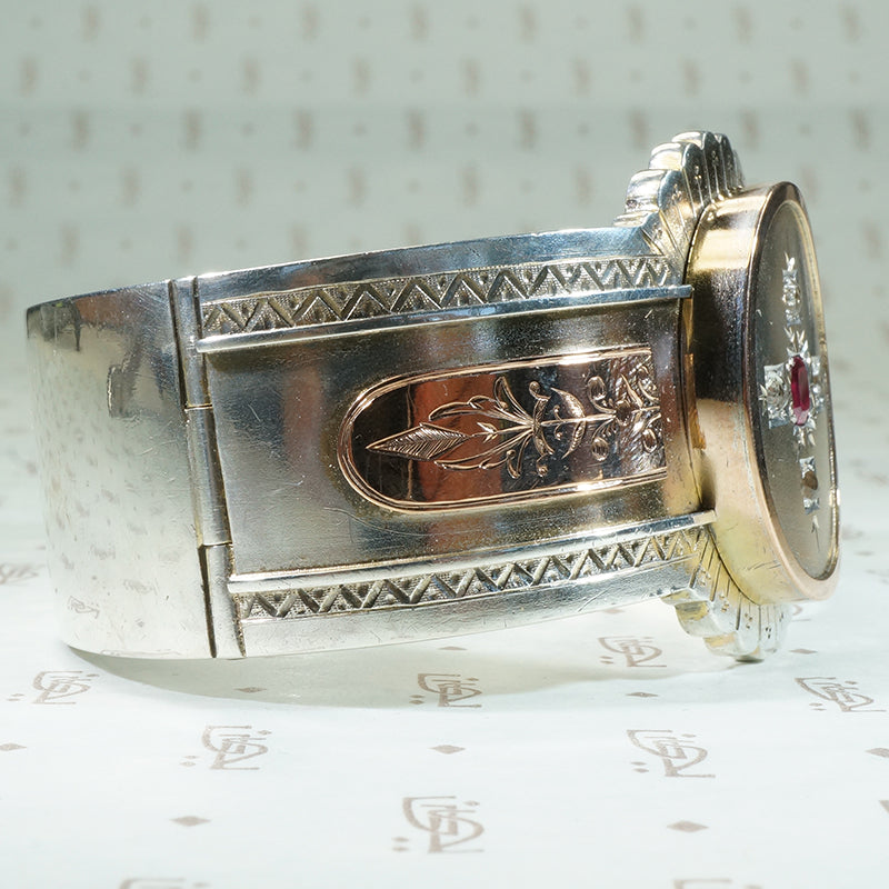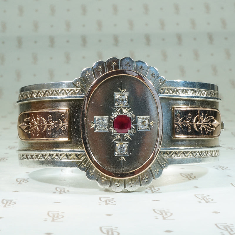 The front of this unusual 19th century hinged bangle is detailed with engraving and gold plaques. The oval front is set with chunky mine cut pastes surrounding a ruby red cushion cut paste gem. A nice wide width and a comfortable fit for an average wrist. The back of the bangle is free of design. Fully Hallmarked Birmingham, Sterling, 1882-83.