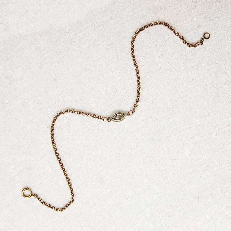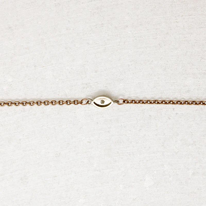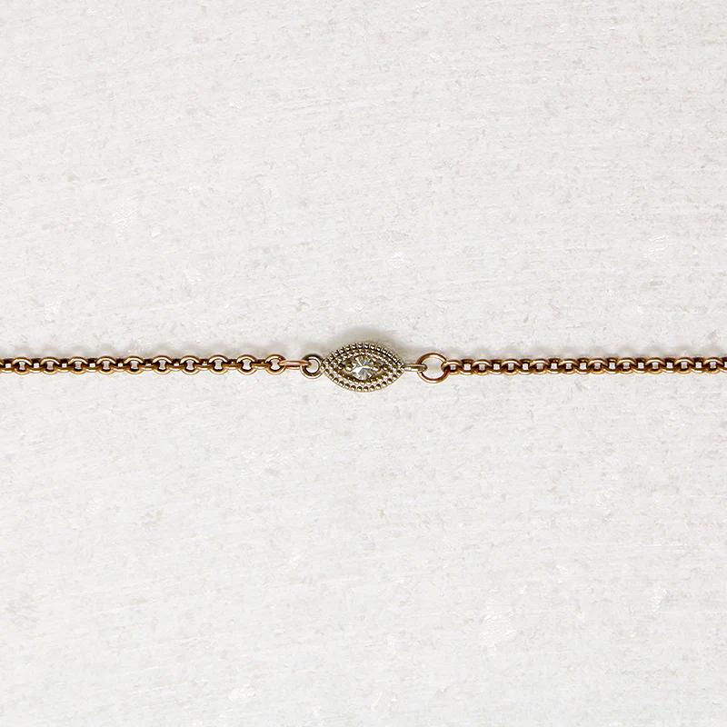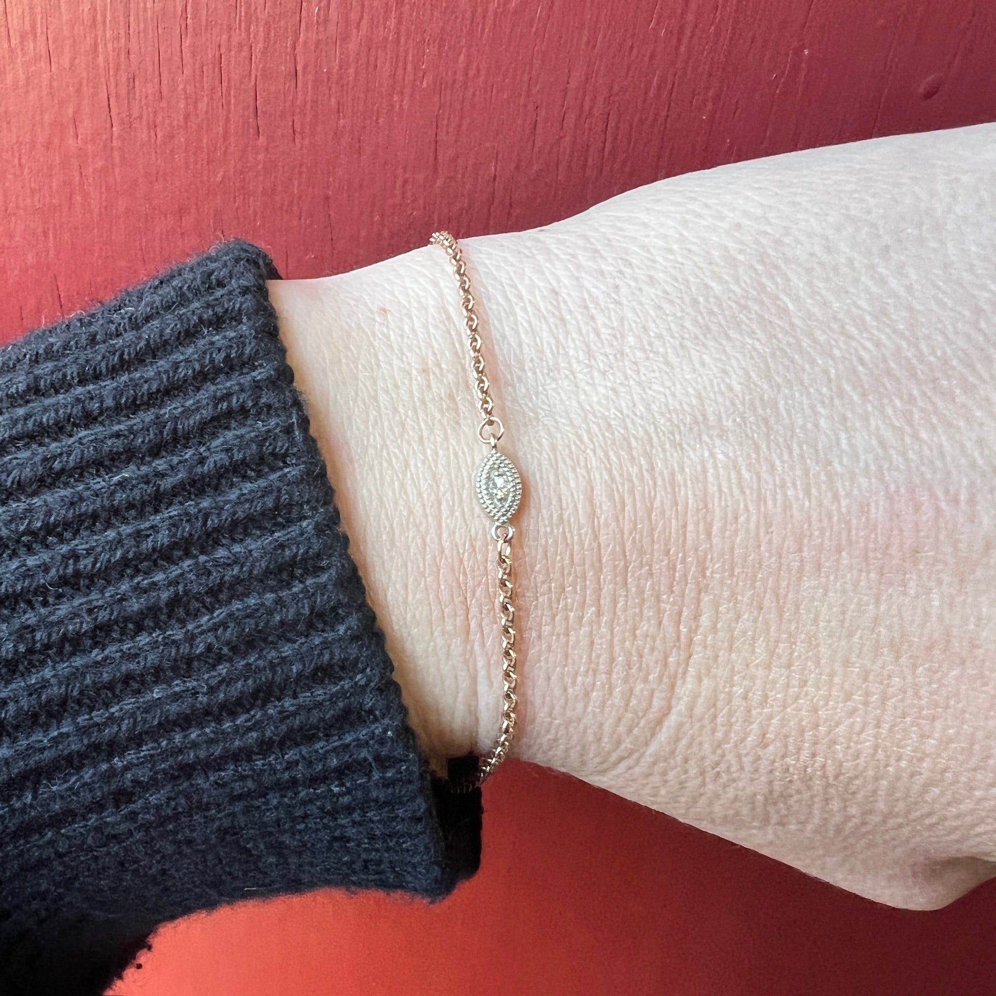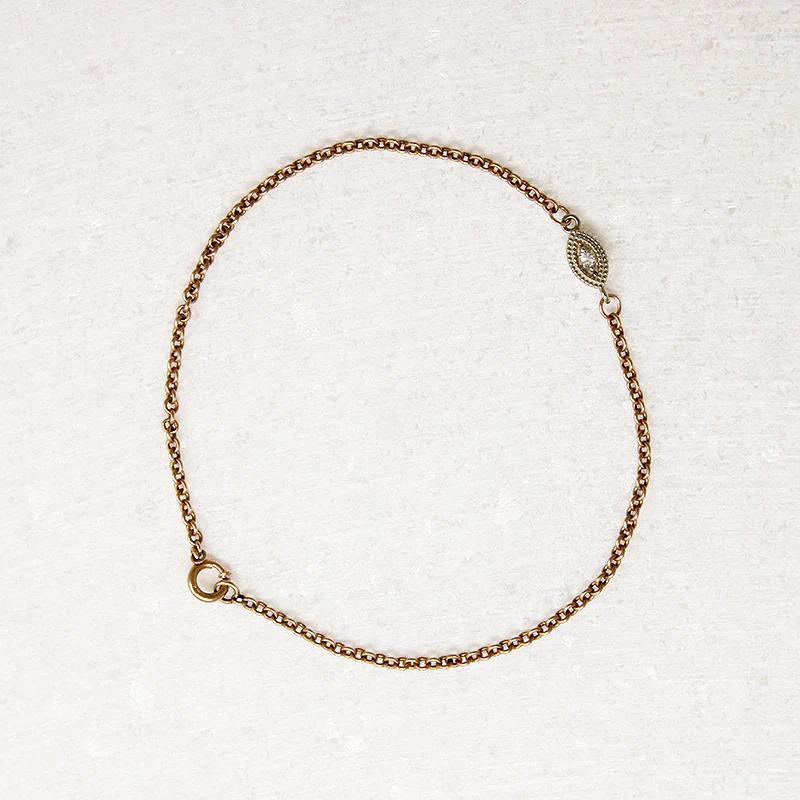 A solitaire diamond is suspended on rose gold cable chain in this dainty artisan bracelet. The sparkling diamond is set in a white gold navette-shaped link, engraved with a double row of milgrain beading. The 14k two-tone gold creates a stylish contrast. All of the elements of this diamond bracelet are vintage or recycled, and it fastens with a spring ring clasp. Handcrafted exclusively for GSL.