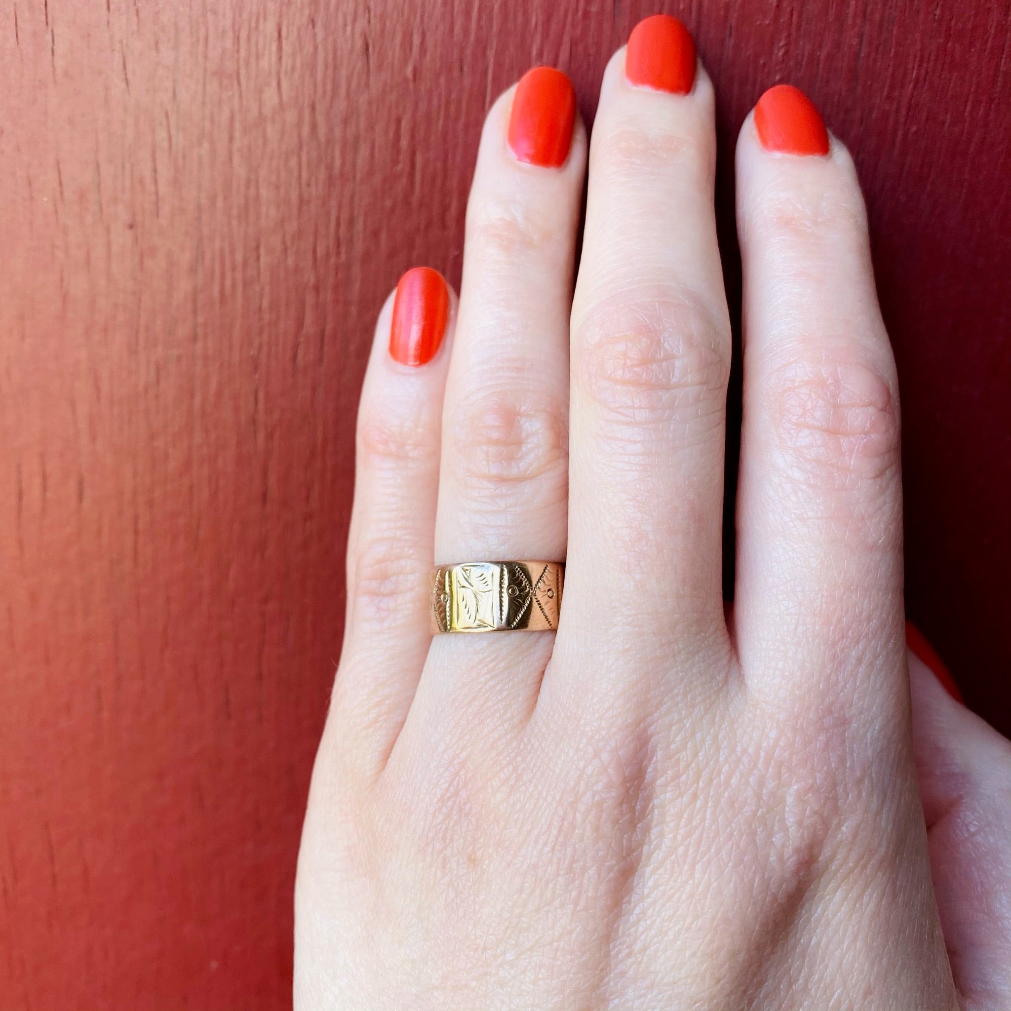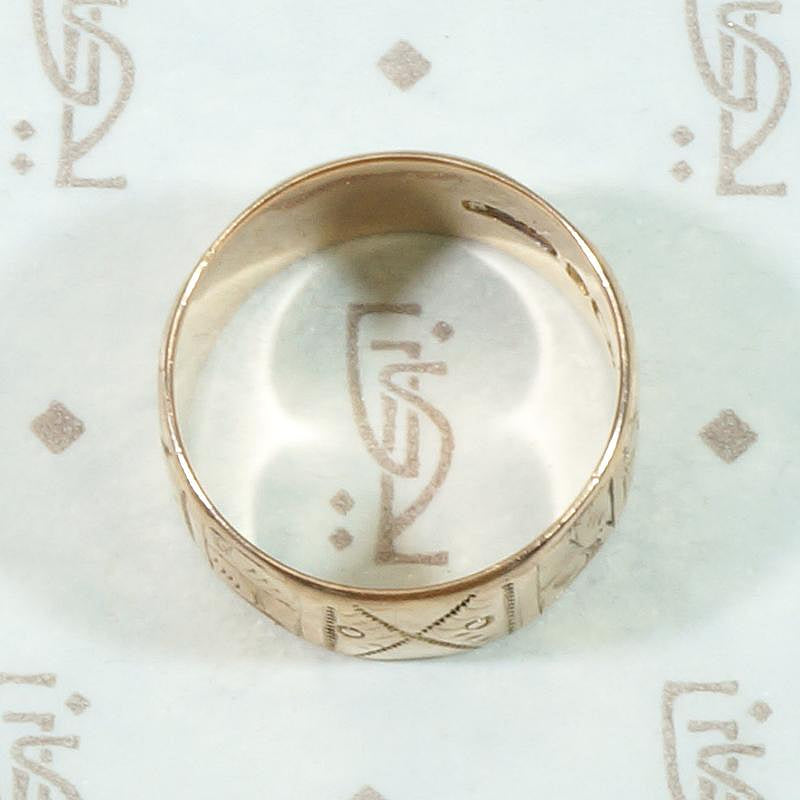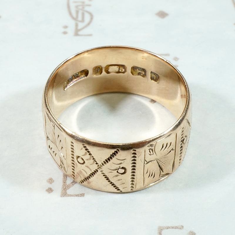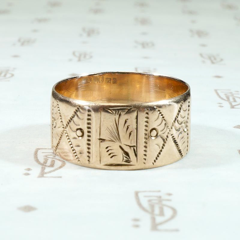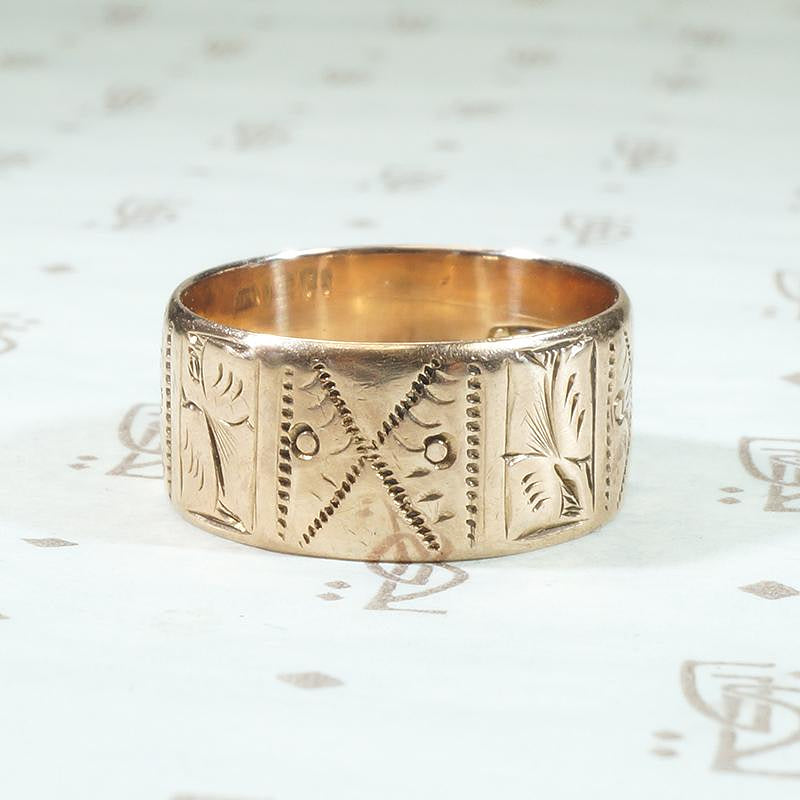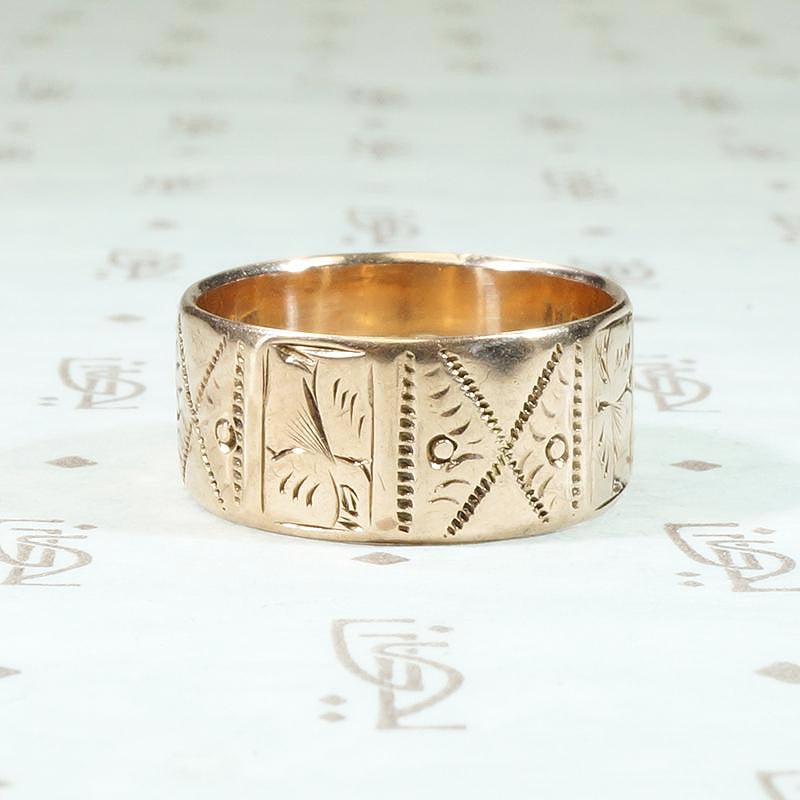 In the 19th Century this very popular style of ring was referred to as a "Cigar Band." Very thin and rather wide, the band resembles the paper bands that were placed around cigars. This rosy 9ct gold example has beveled panels engraved with a variety of flourishes and designs. Hallmarked for 9ct, Birmingham, England and the year 1883.